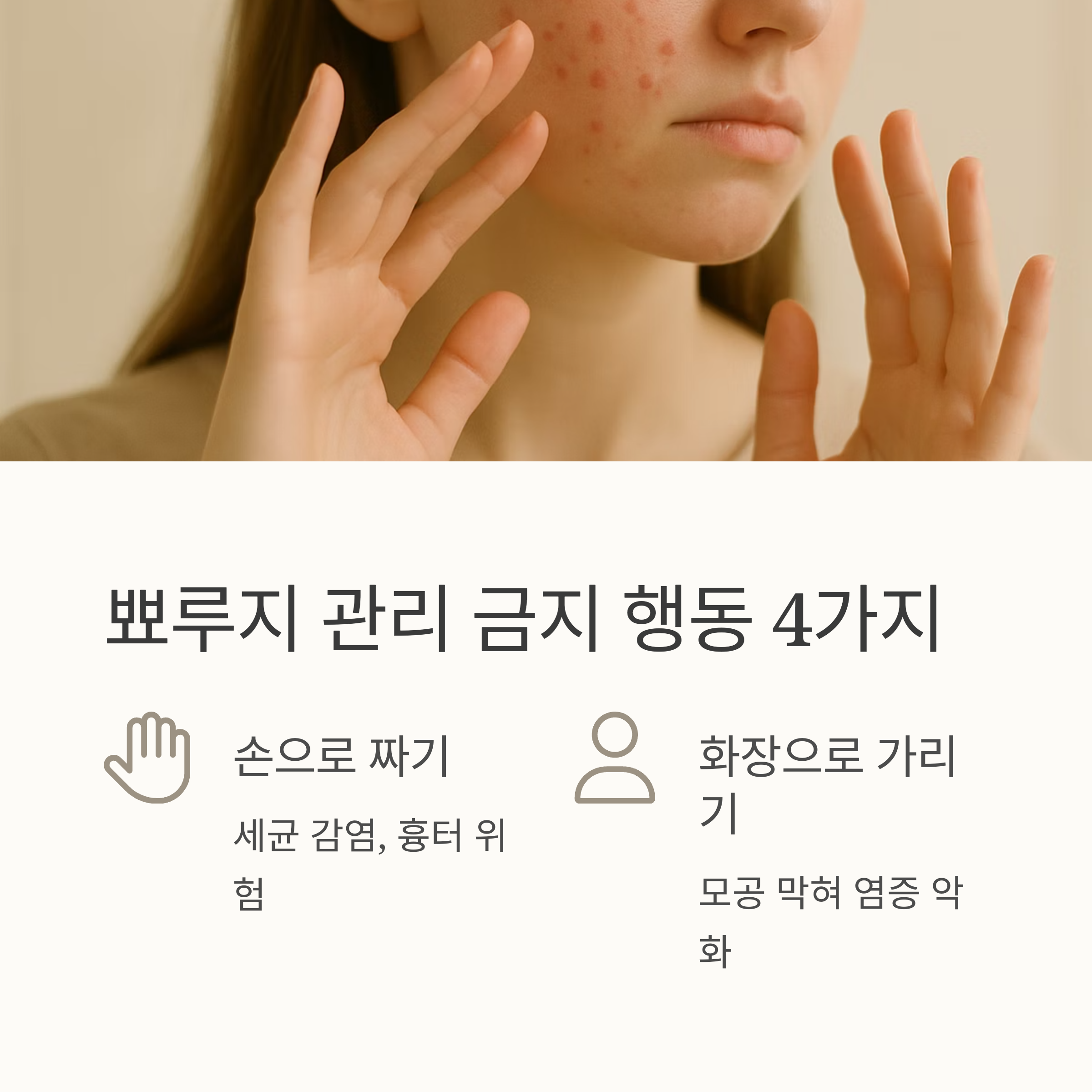 뾰루지가 났을 때 절대로 해서는 안 되는 행동들이 있어요. 첫 번째는 바로 손으로 짜는 거예요. 손에는 세균이 많으니 짜면 감염될 위험이 크고, 색소 침착으로 흉터가 남을 수도 있답니다.