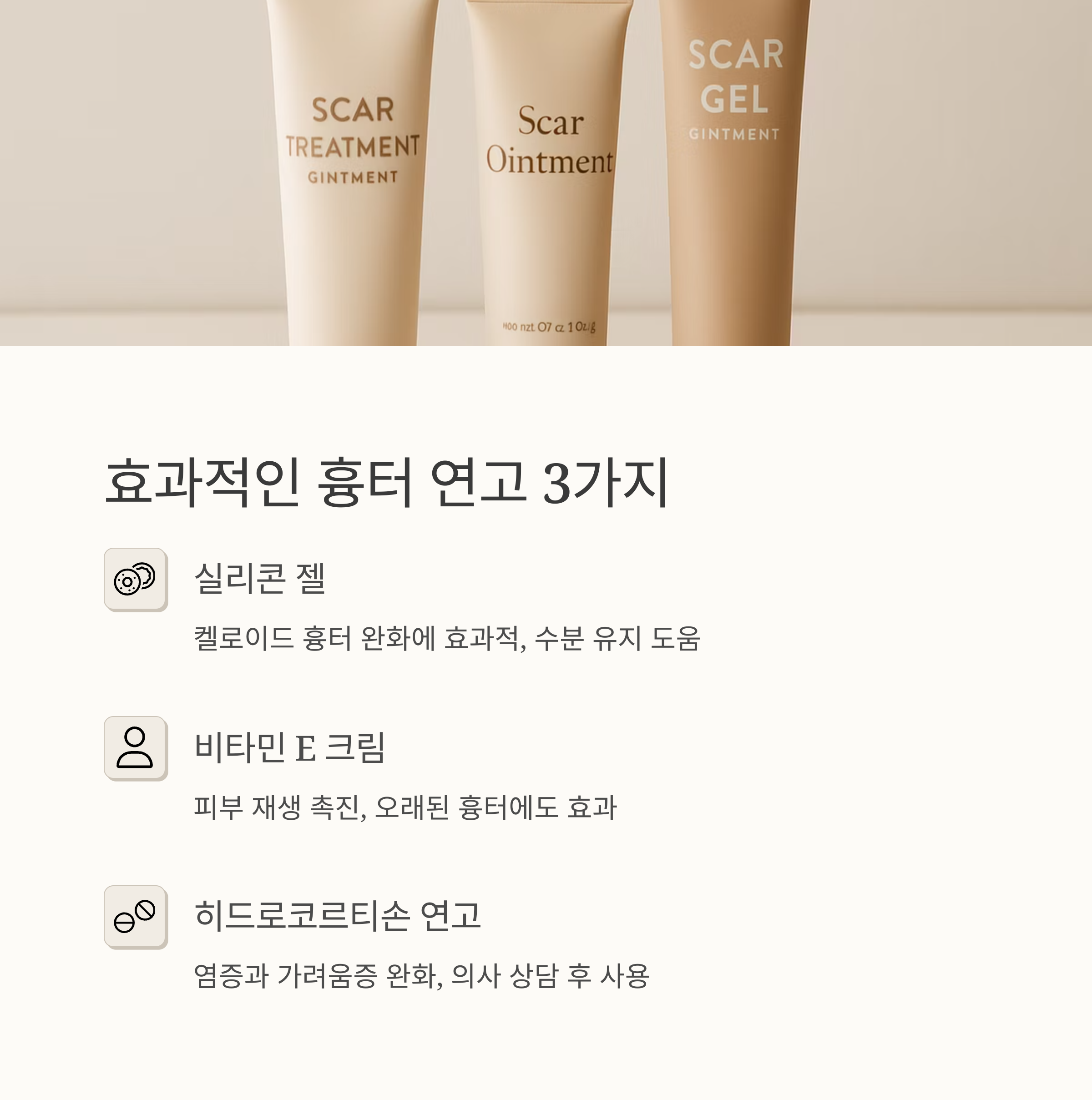 특히 켈로이드 흉터 완화에 효과적인 것으로 알려져 있죠. 두 번째로, 비타민 E 크림은 피부 재생에 도움이 되는 성분으로, 오래된 흉터에도 효과를 볼 수 있다고 합니다. 피부가 촉촉해지는 느낌도 좋아서 저는 꾸준히 사용하고 있답니다. 마지막으로, 히드로코르티손 연고는 염증과 가려움증을 완화하는 데 도움을 주는 연고인데요.