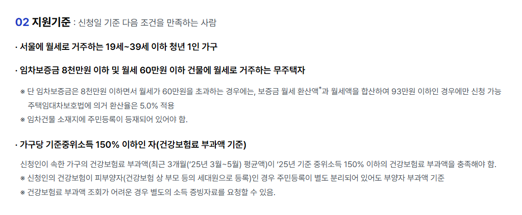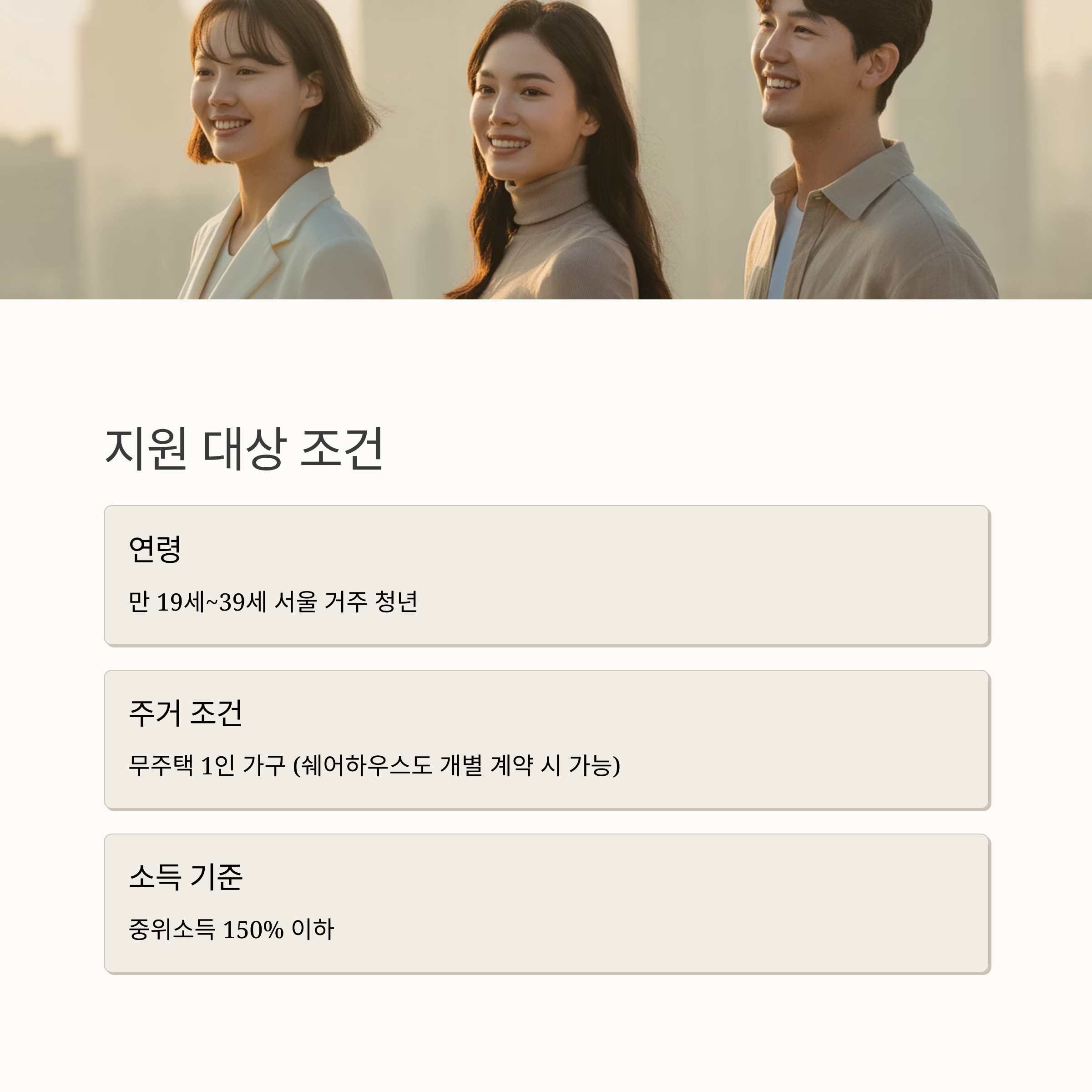 자, 이제 가장 중요한 부분인 지원 대상 조건을 알려드릴게요. 2025년 6월 기준으로 만 19세 이상 39세 이하의 서울시 거주 청년이라면 신청 가능해요. 무주택 1인 가구여야 하며, 혼자 사는 경우뿐만 아니라 쉐어하우스에서 살더라도 각자 계약서가 있다면 신청할 수 있습니다.