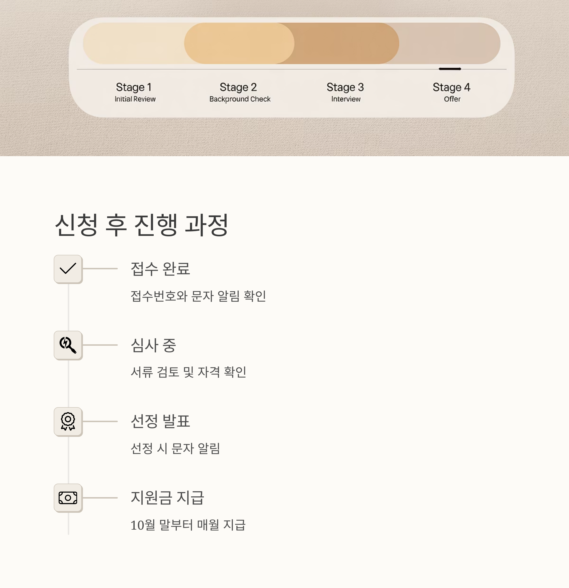 상태는 '접수 완료', '심사 중', '선정', '보류', '탈락' 등으로 표시되니, 자신의 신청 현황을 꼼꼼하게 체크하는 것을 잊지 마세요. 선정되면 10월 말 첫 지급 시점에 안내 문자가 오고, 지급 내역은 '나의 지원내역'에서 확인 가능해요.