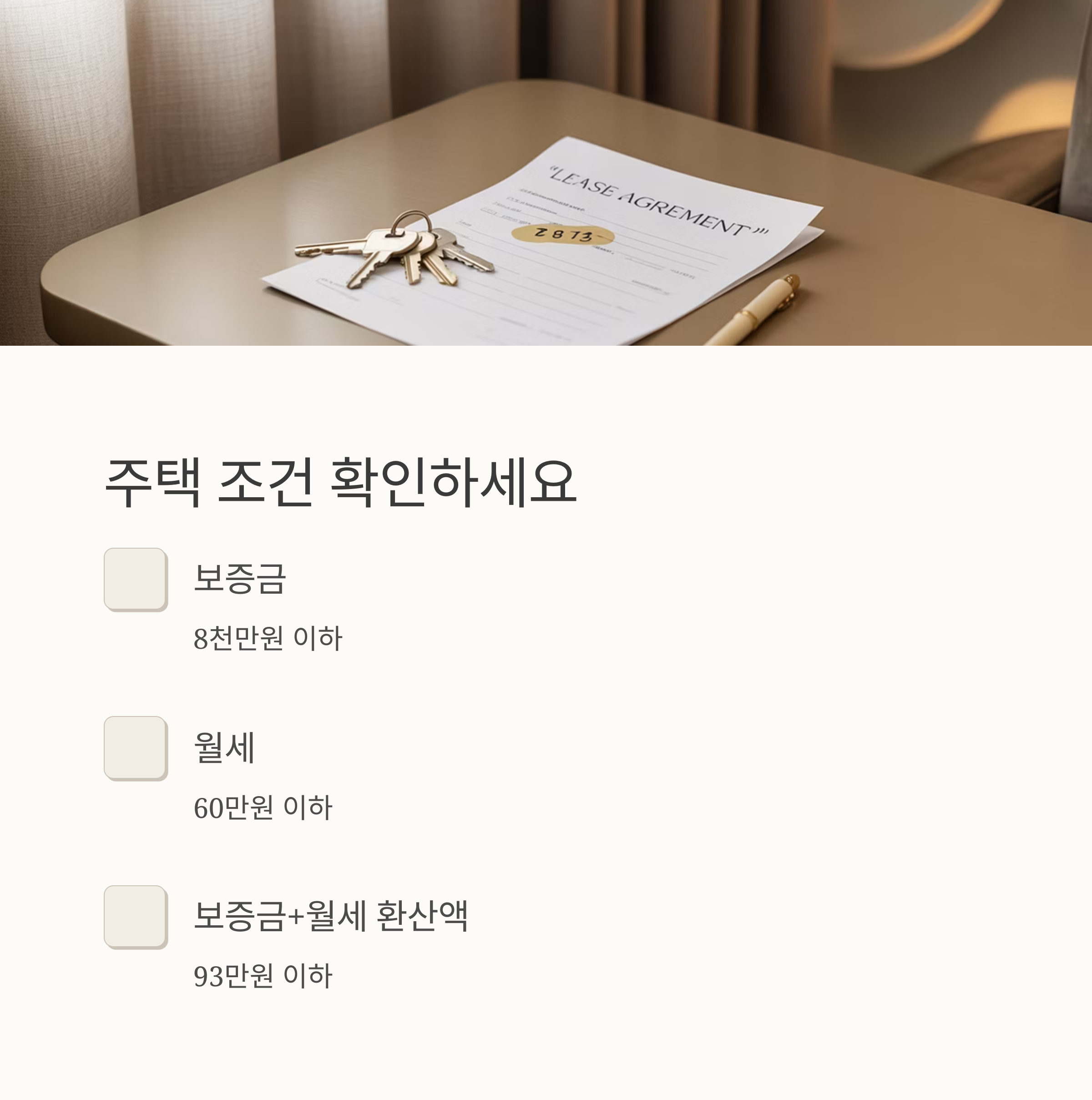 소득 기준은 건강보험료 기준 중위소득의 150% 이하여야 하며, 보증금은 8천만 원 이하, 월세는 60만 원 이하, 또는 보증금과 월세를 합쳐 93만 원 이하여야 해요. 중요한 점! 이전에 지원을 받았거나 다른 주거 지원 사업 혜택을 받고 있다면 신청이 불가능해요.