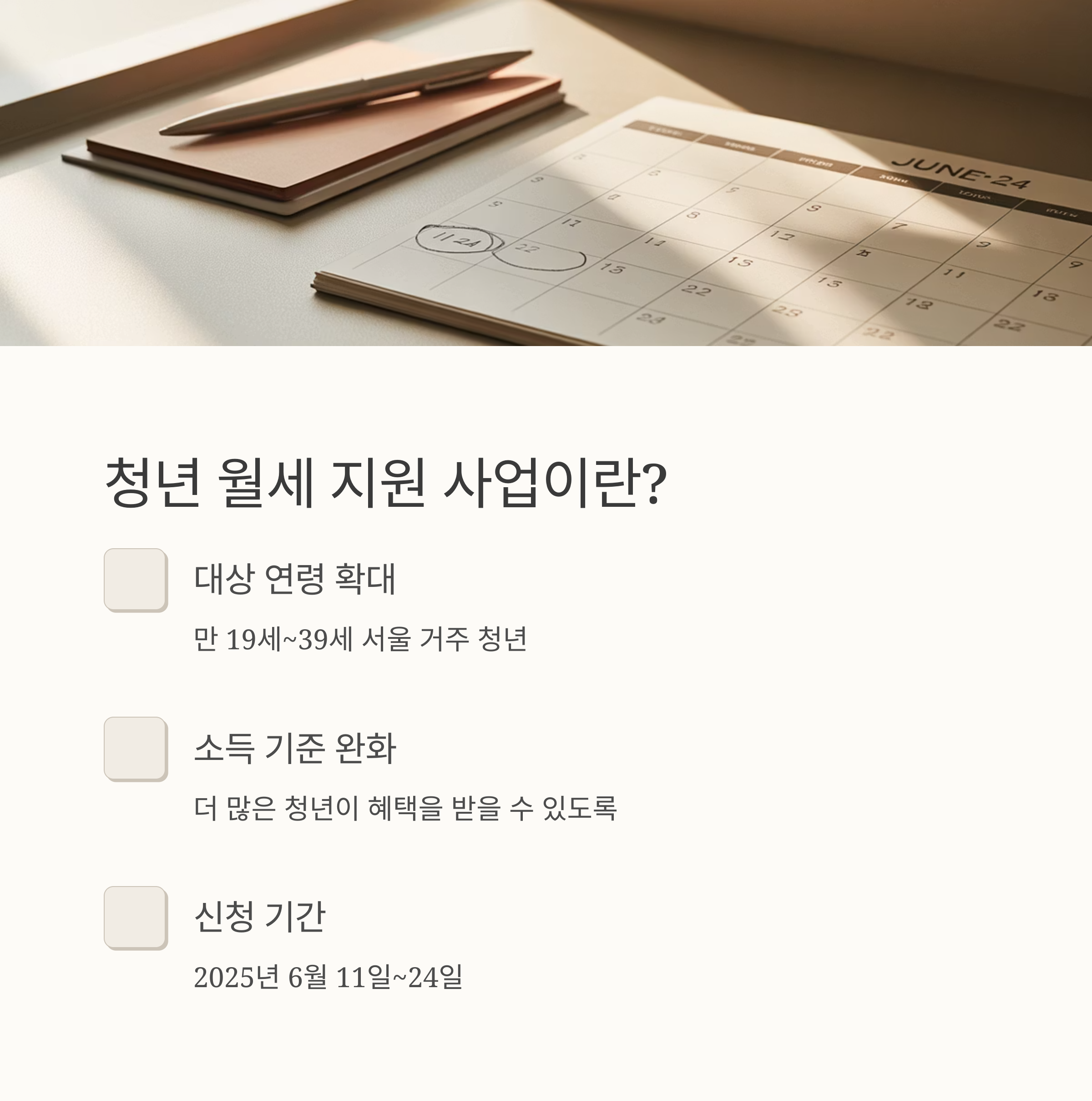 이번 사업은 지원 대상 연령 확대와 소득 기준 완화로 더 많은 청년이 혜택을 받을 수 있게 되었답니다. 6월 11일부터 24일까지 신청 기간이니, 놓치지 말고 꼼꼼하게 확인해보세요. 월세 걱정 덜고 꿈을 향해 나아갈 수 있도록 여러분을 응원합니다!