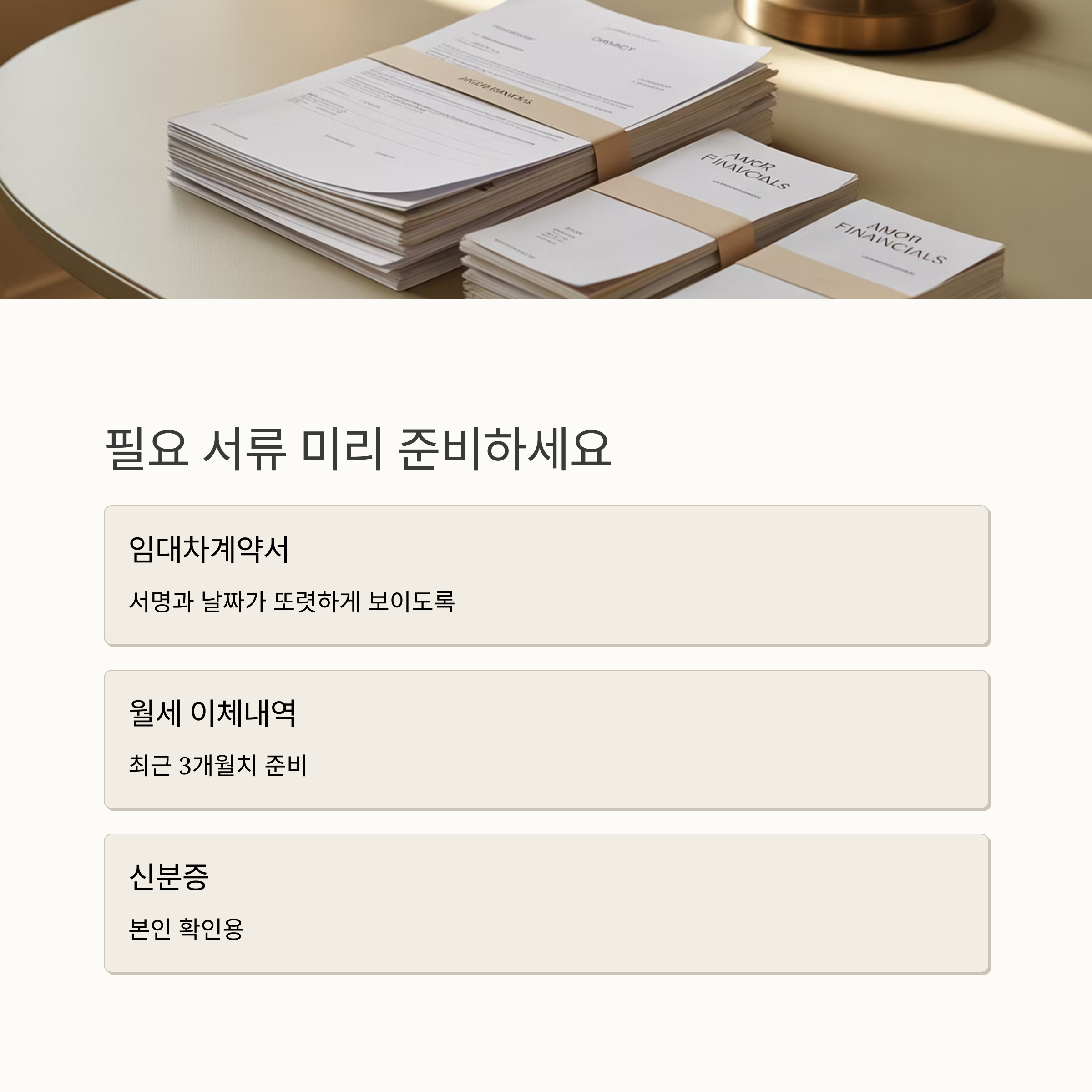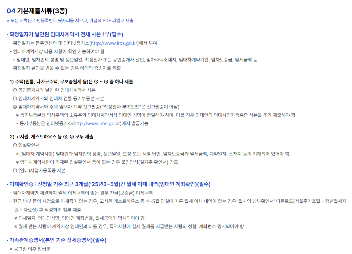 그곳에서 신청서를 작성하시면 되는데, 필요한 서류는 임대차계약서와 최근 3개월치 월세 이체 내역이에요. PDF나 사진으로 첨부하시면 됩니다. 서류 준비는 미리 해두시는게 좋아요.