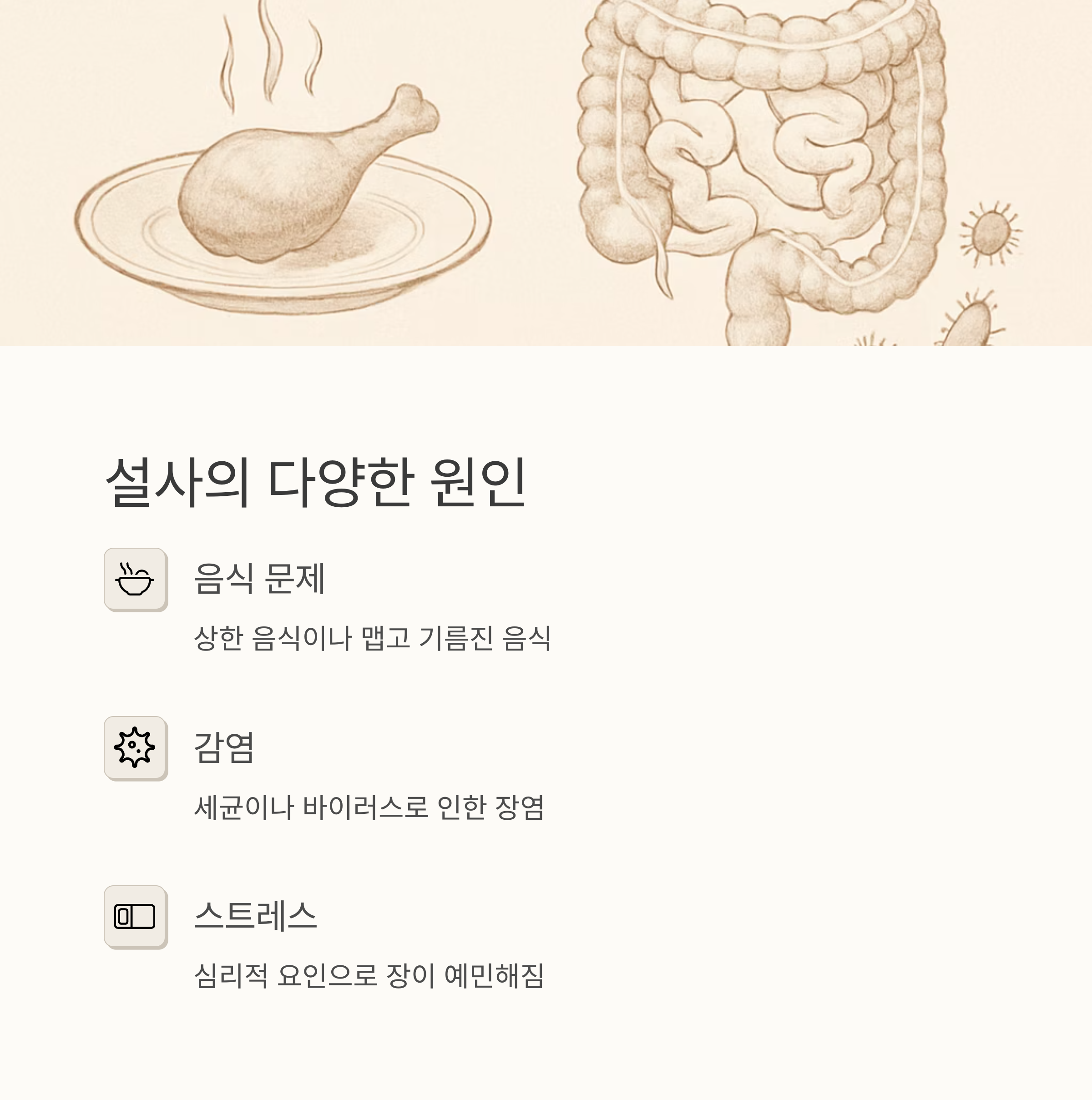 어떤 원인인지 정확히 알아야 해결책을 찾을 수 있으니, 잠깐 시간을 내어 생각해 보세요. 평소와 다른 음식을 먹었는지, 스트레스를 많이 받았는지, 주변에 감기 환자가 있는지 등을 살펴보는 게 좋아요. 그리고 설사가 오래 지속되거나 다른 증상(고열, 혈변 등)이 동반된다면 꼭 병원에 가서 진료를 받아야 해요.
