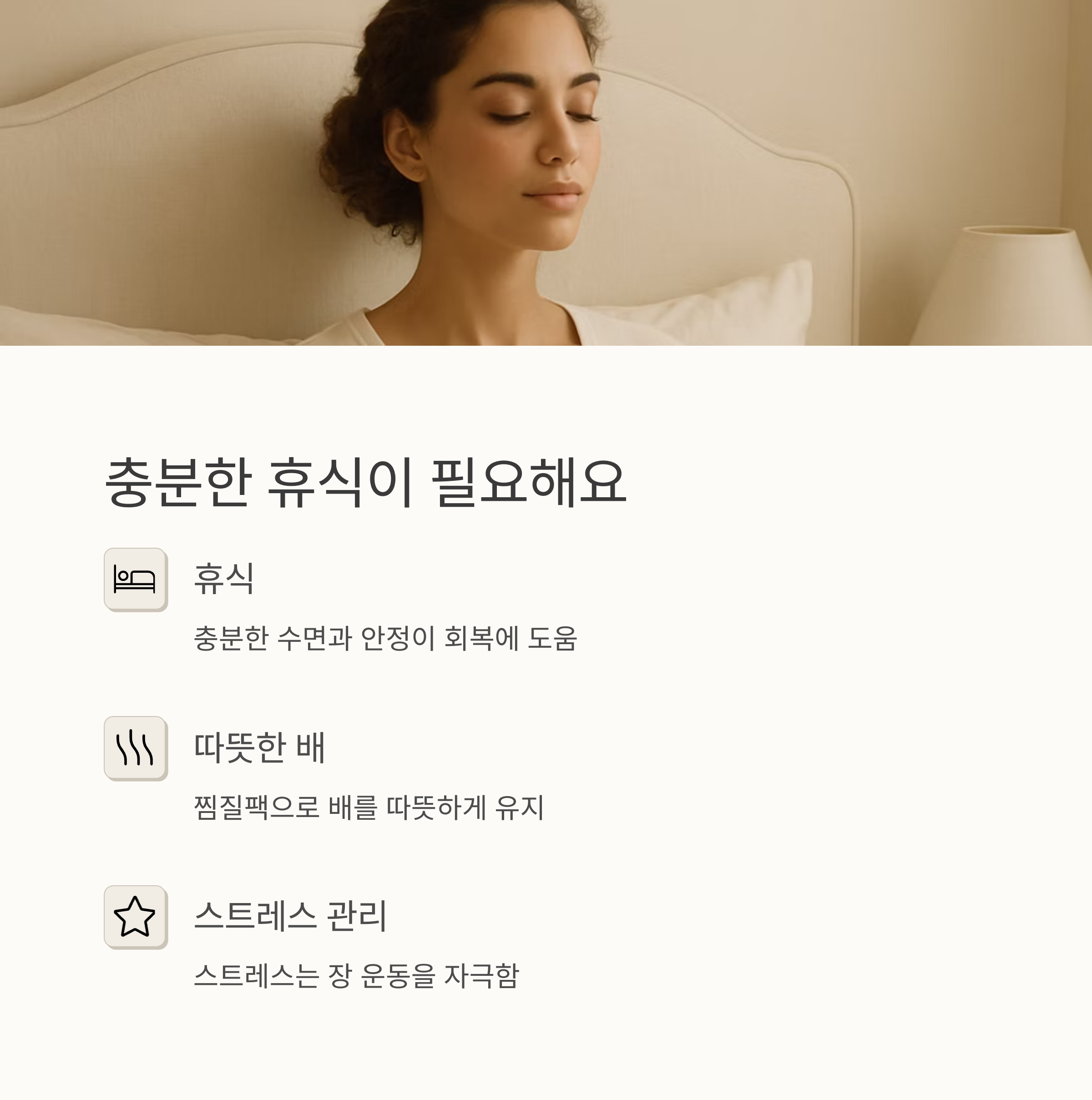 스트레스와 피로는 장의 운동을 자극해서 설사를 악화시킬 수 있으니까요. 편안하게 휴식을 취하고, 따뜻한 찜질팩으로 배를 따뜻하게 감싸주면 장이 진정되는데 도움이 돼요. 배를 따뜻하게 유지하는 것은 장의 운동을 안정시키는 데 효과적이에요. 잠시 쉬면서 편안하게 휴식을 취하고 몸의 회복에 집중해 보세요!