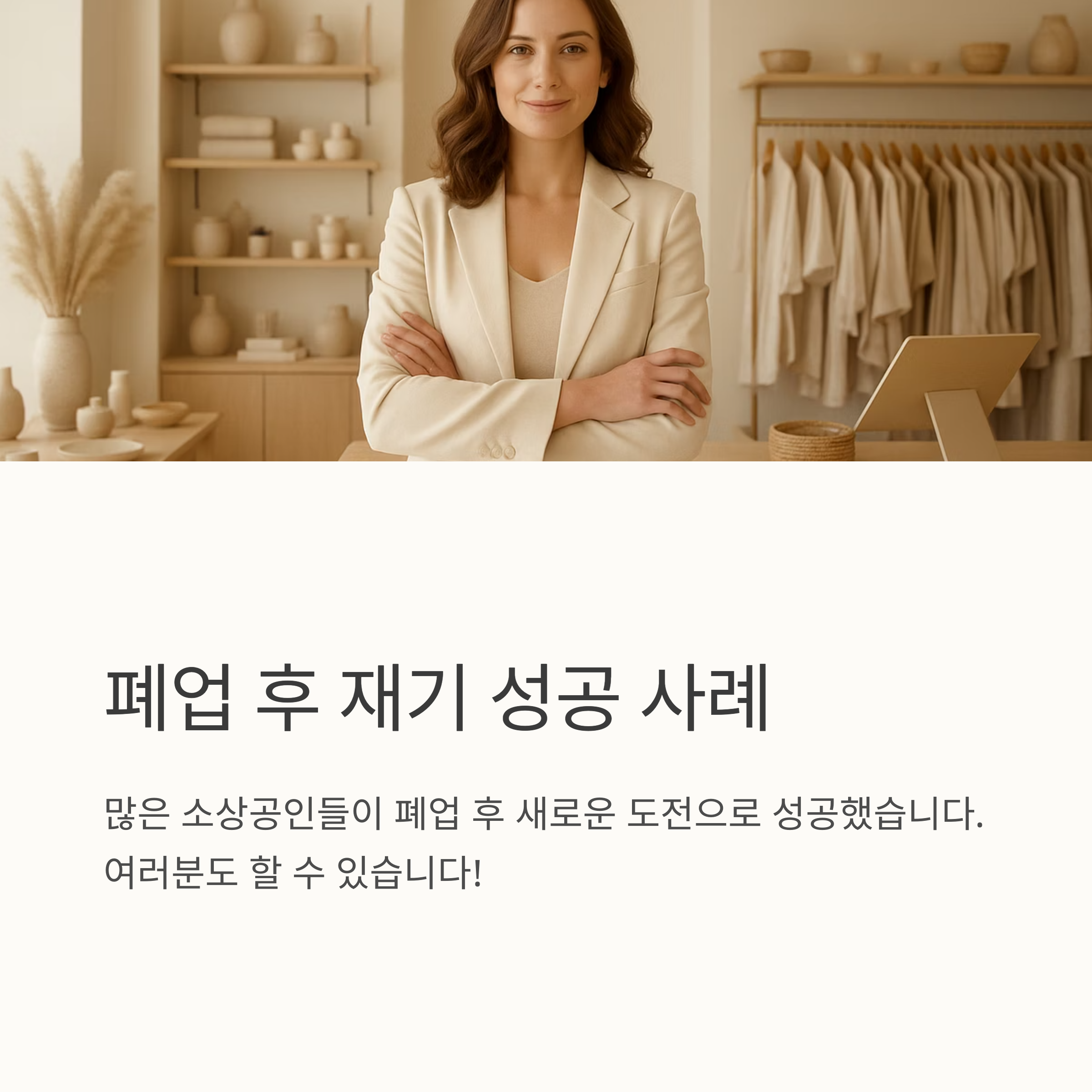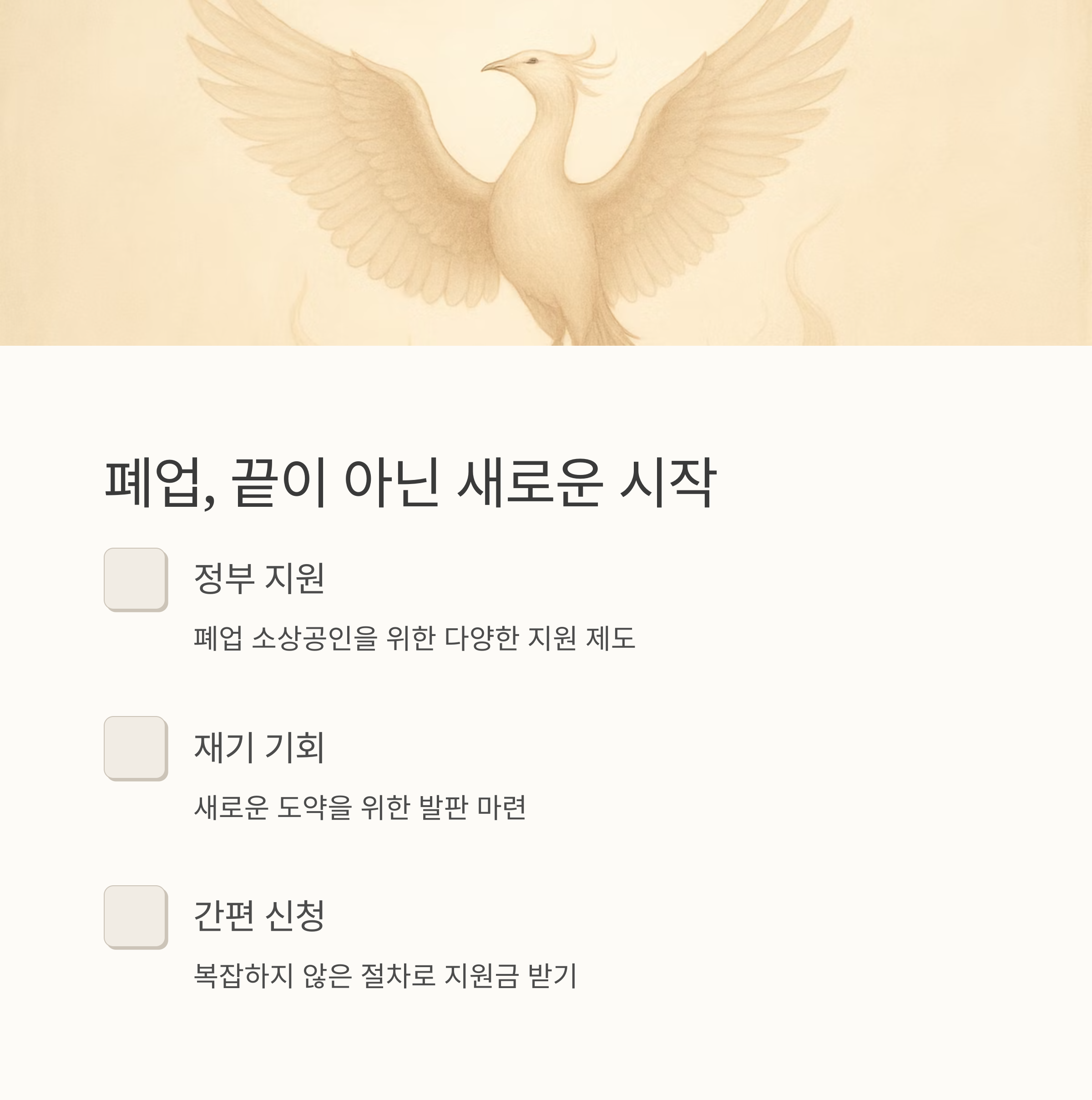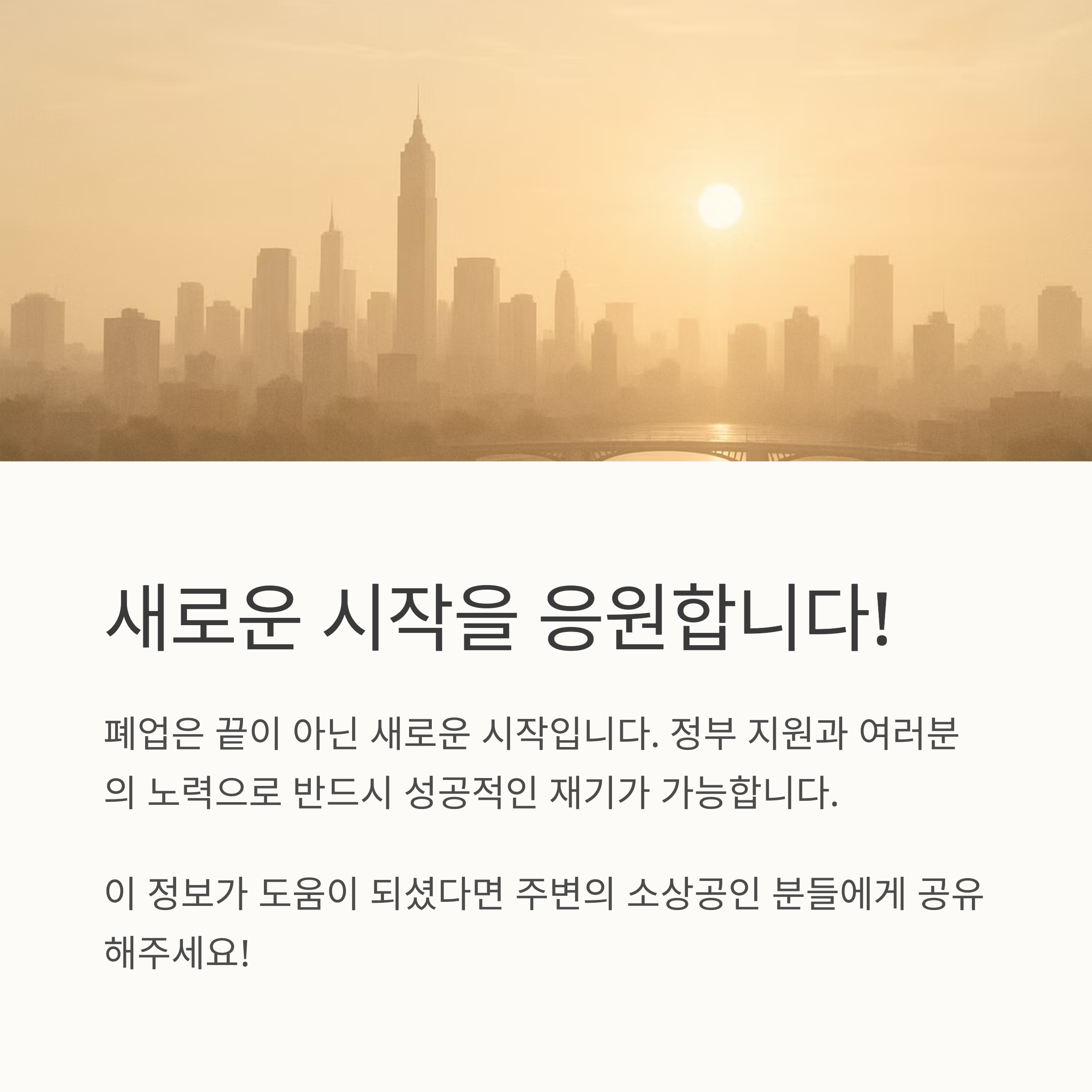 폐업은 쉽지 않은 결정이지만, 새로운 시작을 위한 기회로 삼을 수 있습니다. 폐업지원금 제도를 통해 희망을 찾고, 다시 도약하는 계기로 삼으세요. 정부의 지원과 여러분의 노력이 함께한다면, 분명 성공적인 재기를 이룰 수 있을 것입니다. 힘내세요! 여러분은 충분히 할 수 있습니다.
