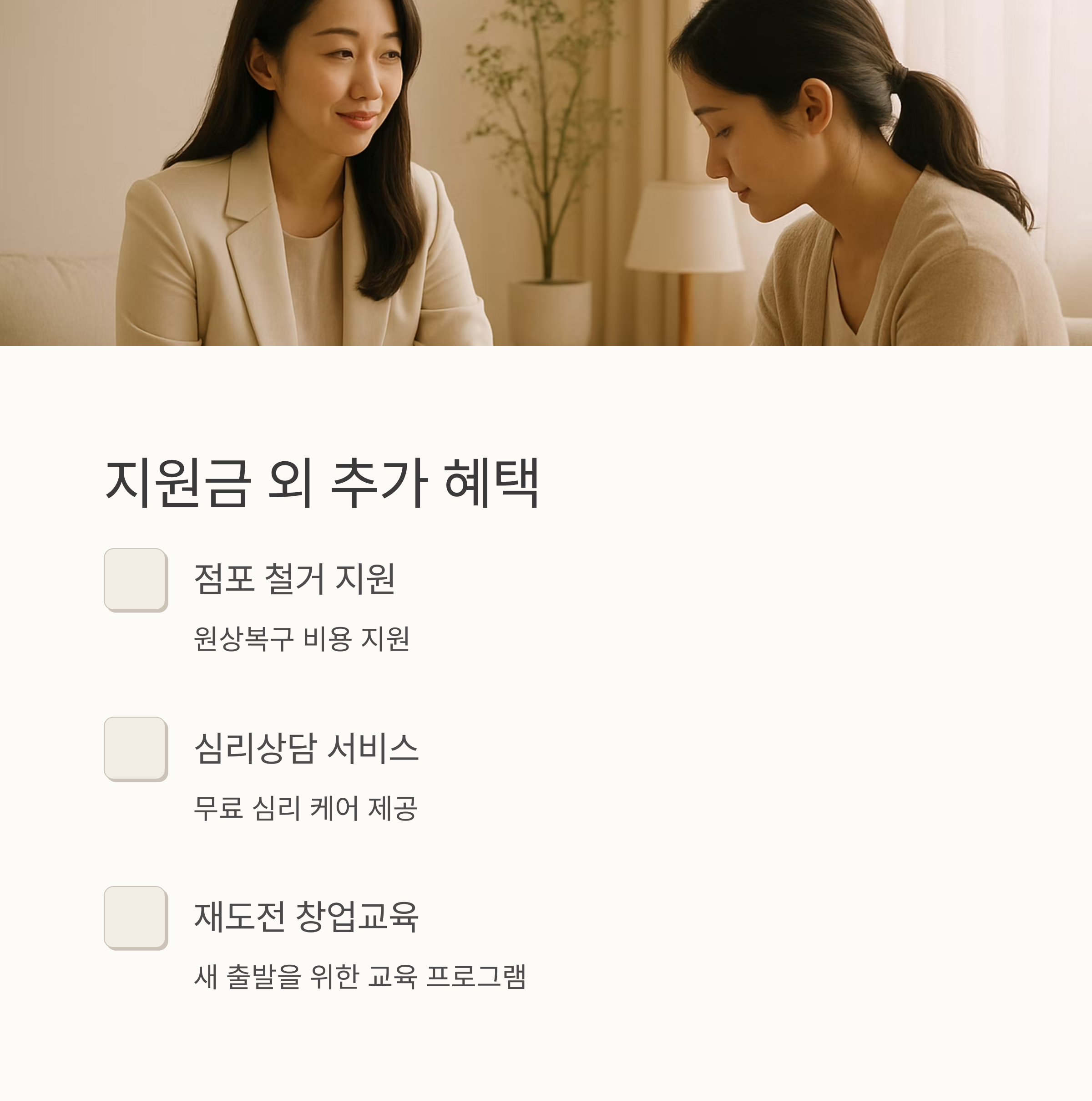 점포 철거 비용이나 원상복구 비용, 심리상담 등 부가적인 지원까지 더해져, 폐업으로 인한 부담을 덜어드리고자 합니다. 힘든 시기를 극복하고, 새로운 꿈을 향해 나아가실 수 있도록 응원합니다.
