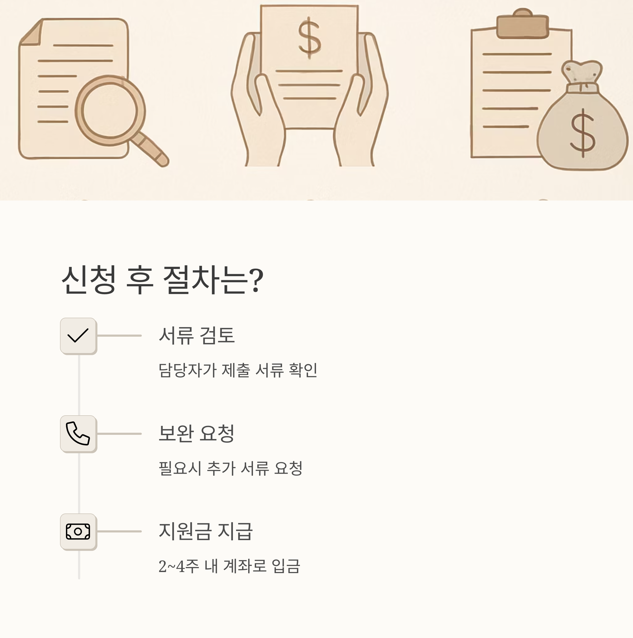서류 준비가 조금 번거로울 수 있지만, 미리미리 준비해두면 신청 과정이 더욱 수월해질 거예요. 혹시 서류가 부족하거나 잘못된 부분이 있으면 담당자 분들이 연락을 주실 거예요. 그때 차분하게 보완하면 된답니다. 신청 후에는 최소 2주에서 최대 4주 정도 기다리면 지원금이 지급될 거예요.