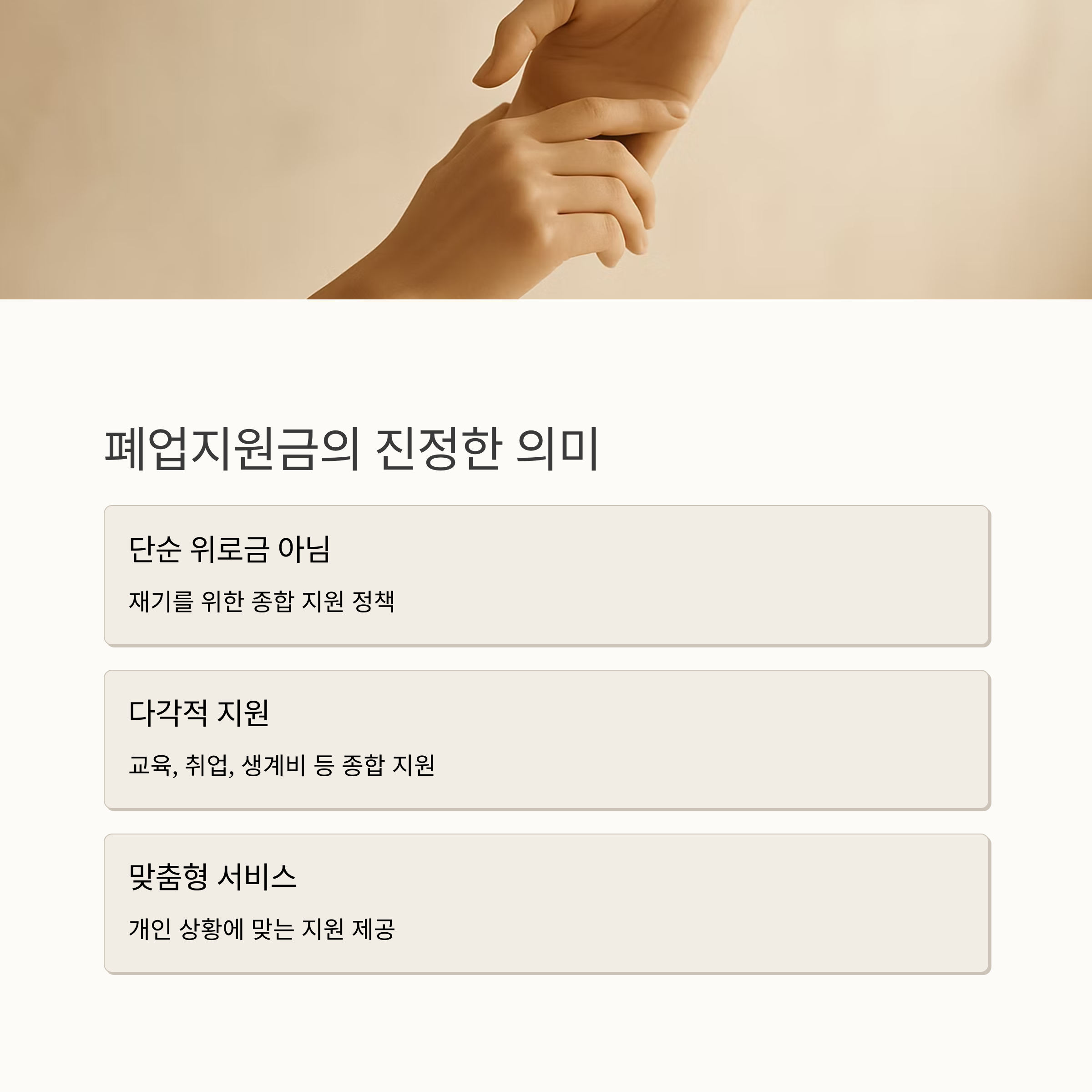 폐업지원금 제도는 단순한 위로금이 아니에요. 경영난으로 힘든 소상공인 여러분이 다시 일어설 수 있도록 돕는 정부의 따뜻한 지원 정책이랍니다. 재도전을 위한 교육, 취업 지원, 생계비 보전 등 다각적인 지원을 통해 여러분의 재기를 돕고자 합니다.