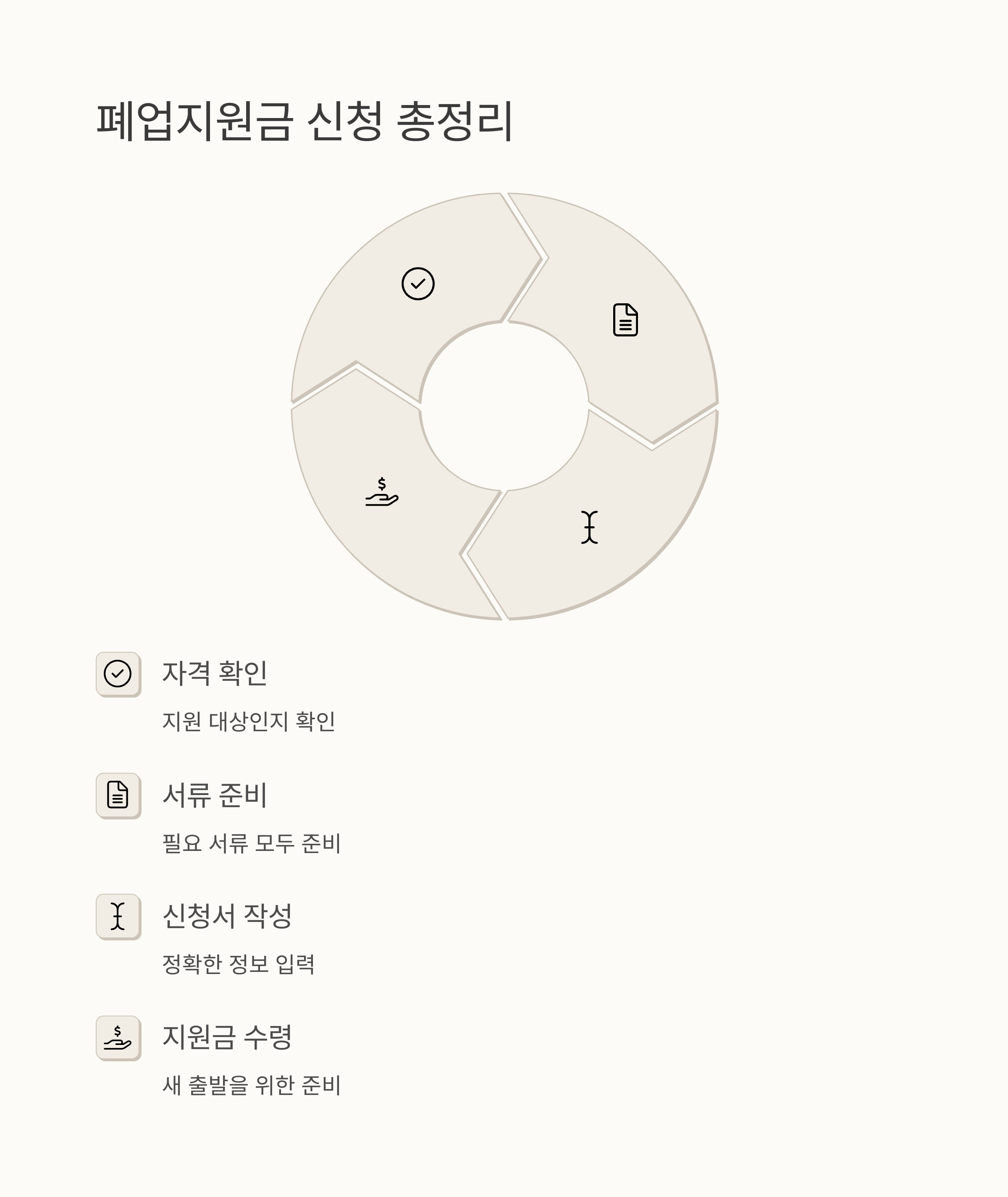 세금 체납이 없어야 하고, 폐업 신고 관련 서류를 제출할 수 있어야 해요. 매출이나 업종, 운영 기간 등에 따라 지원금액은 달라질 수 있고, 같은 지원금을 이미 받았다면 중복 수급이 제한될 수도 있으니 꼼꼼하게 확인하세요.