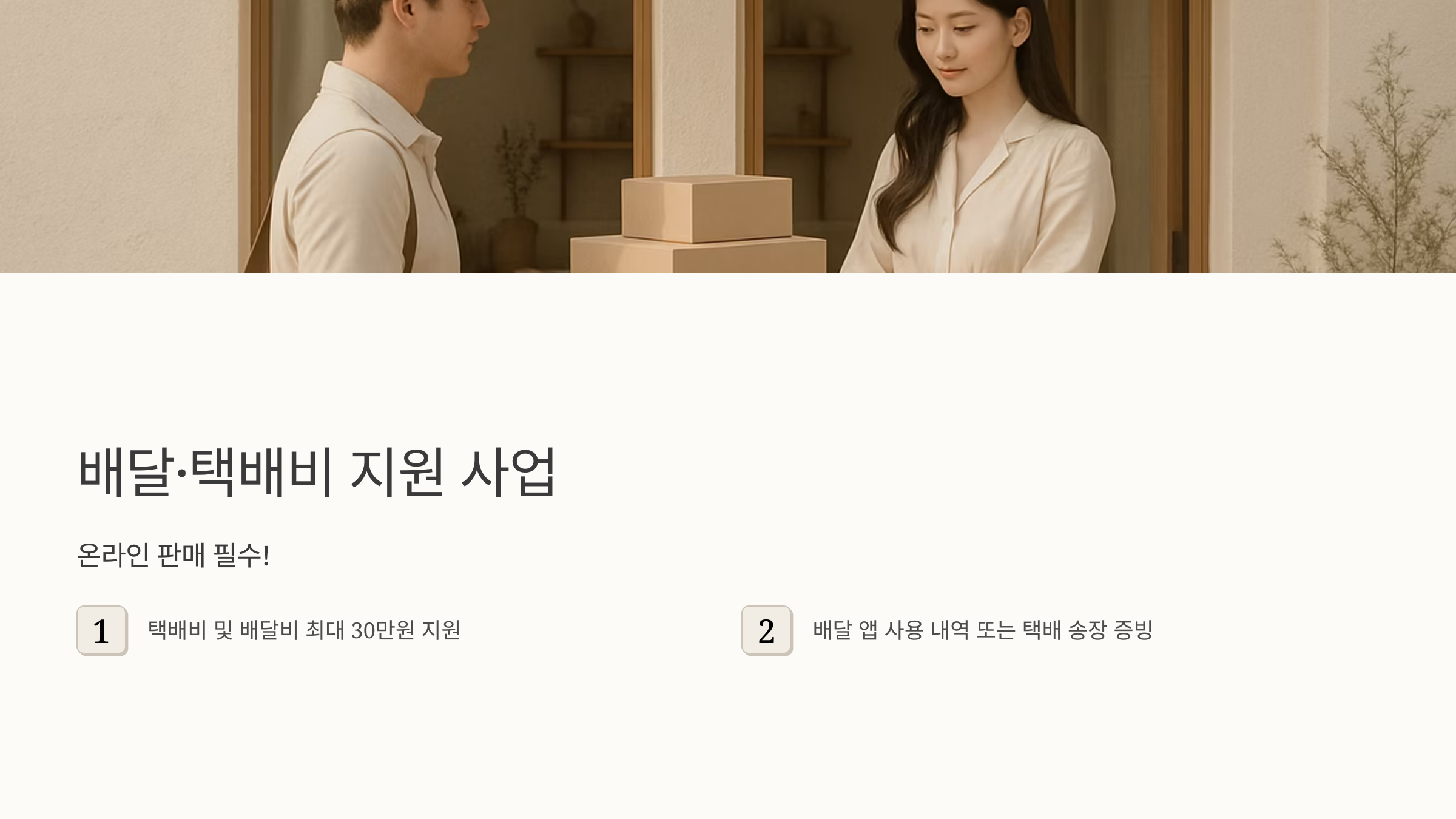 요즘은 온라인 판매가 필수인 시대잖아요? 하지만 배달, 택배비가 만만치 않죠. 배달·택배비 지원 사업은 택배비 및 배달비를 최대 30만 원까지 지원해 드립니다.