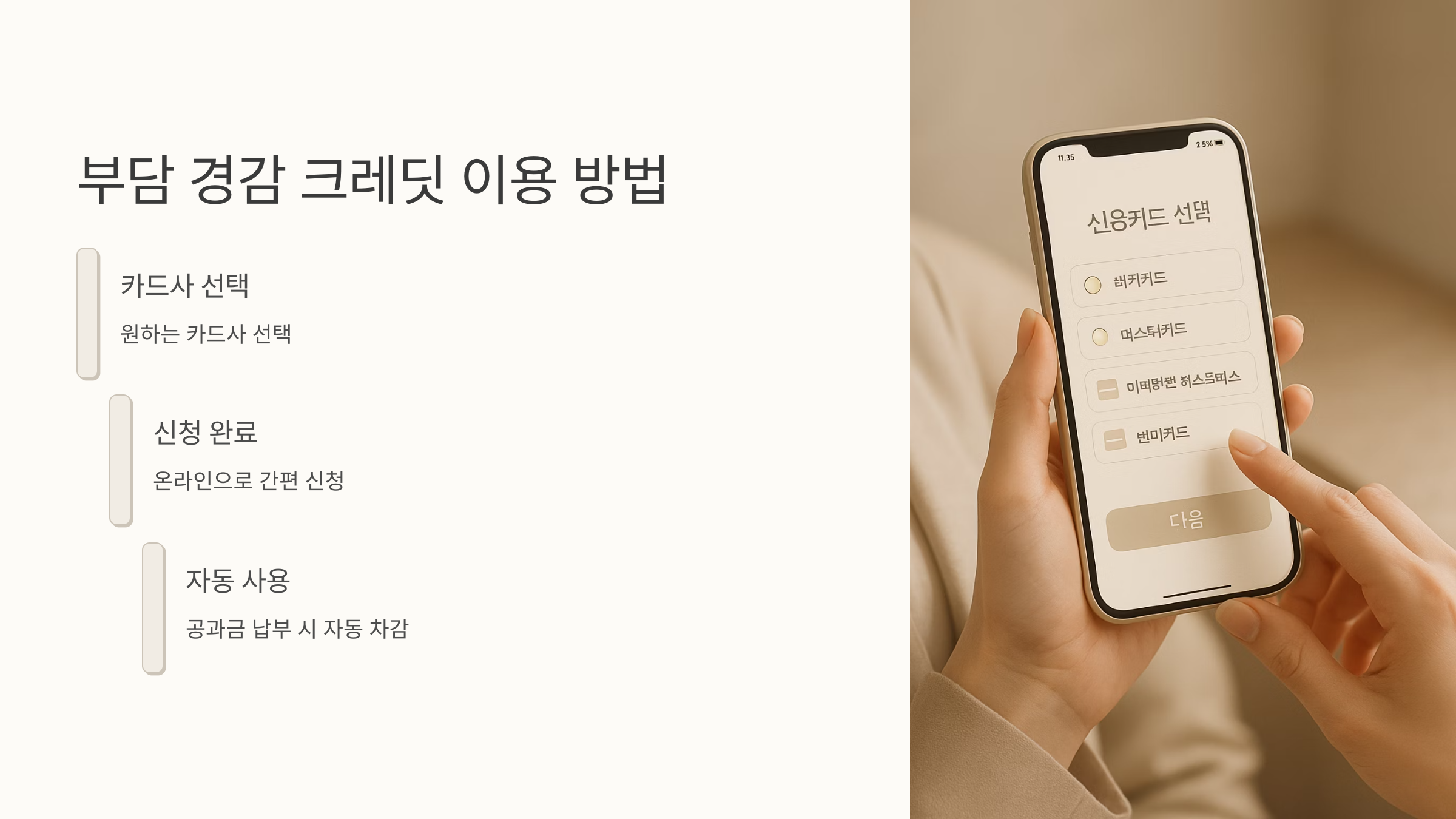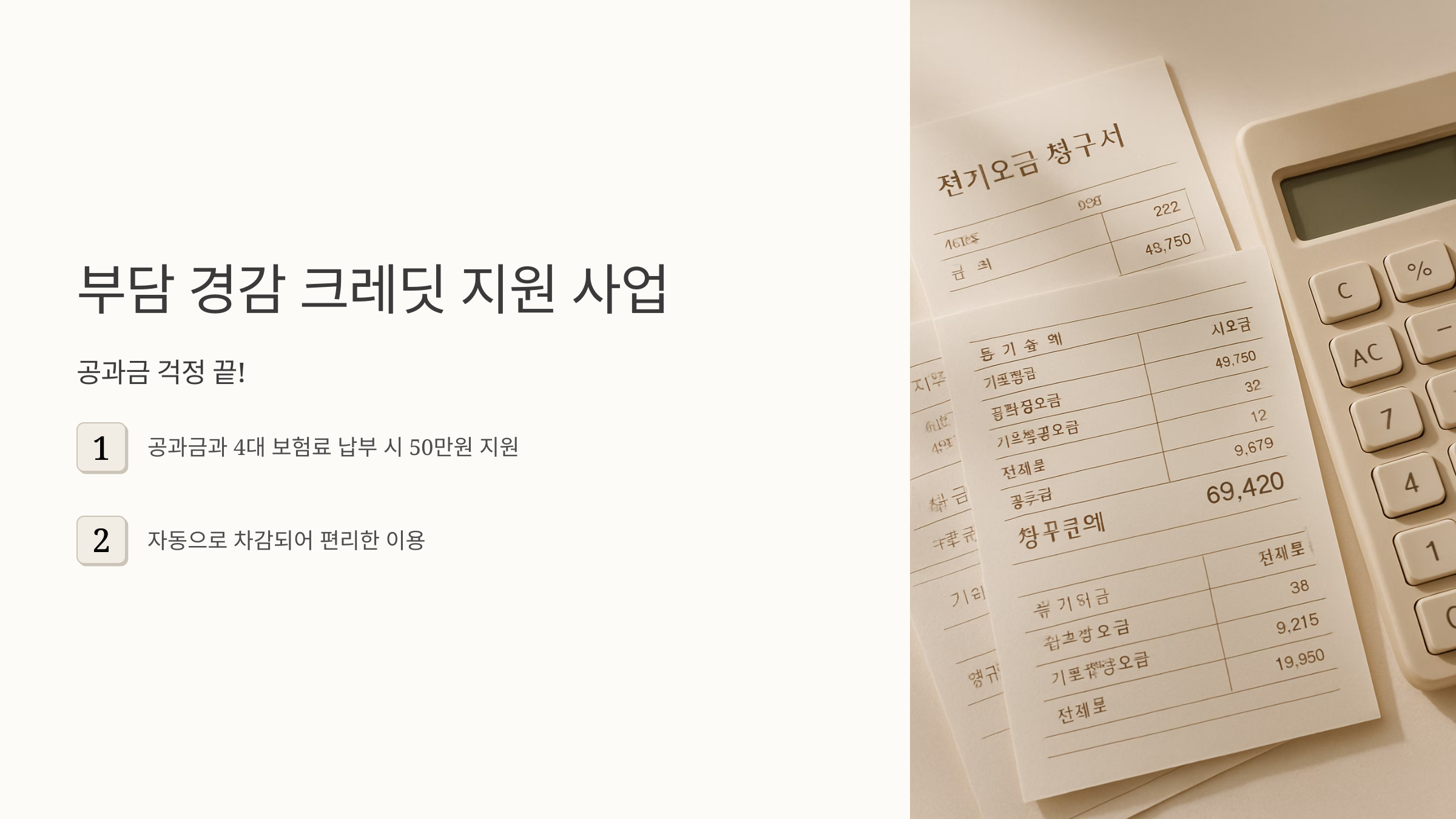 월세, 관리비, 전기요금 등등… 공과금 폭탄에 매달 힘드시죠? 부담 경감 크레딧 지원 사업은 공과금과 4대 보험료 납부 시 50만 원을 지원해 줍니다. 50만원이면 커피 한 잔 값이 아니라, 생활에 꽤나 큰 도움이 될 거예요. 마치 마법처럼 자동으로 차감되니 깜빡할 염려도 없어요.
