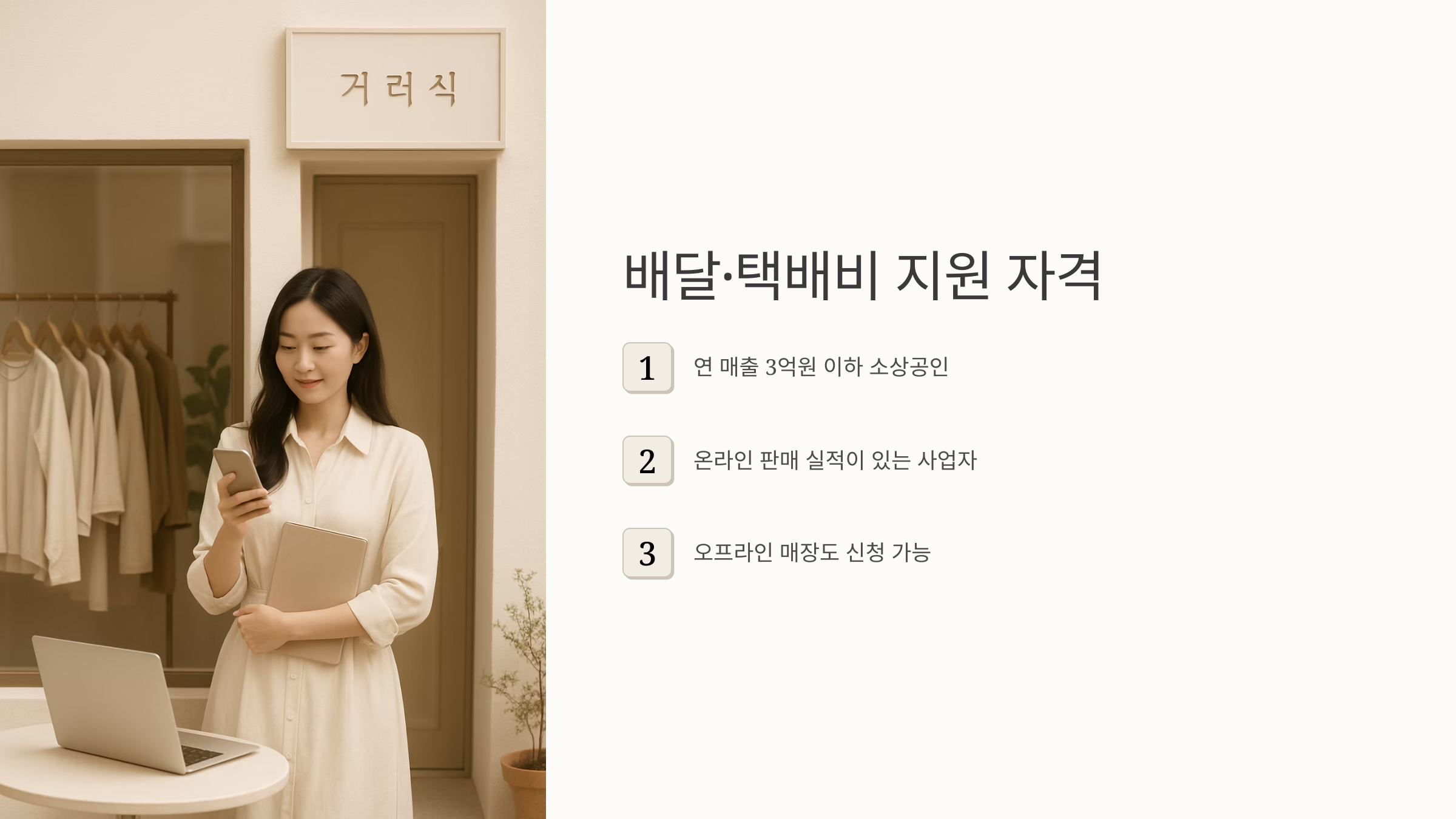 배달 앱 사용 내역이나 택배 송장을 증빙하면 되고요, 연 매출 3억 원 이하 소상공인이면 신청 가능합니다. 오프라인 매장이라도 온라인 판매 실적만 있다면 누구든 신청 가능해요. 30만 원이면 꽤 많은 물건들을 배송할 수 있겠죠? 자세한 사항은 신청 페이지에서 확인해 주세요.