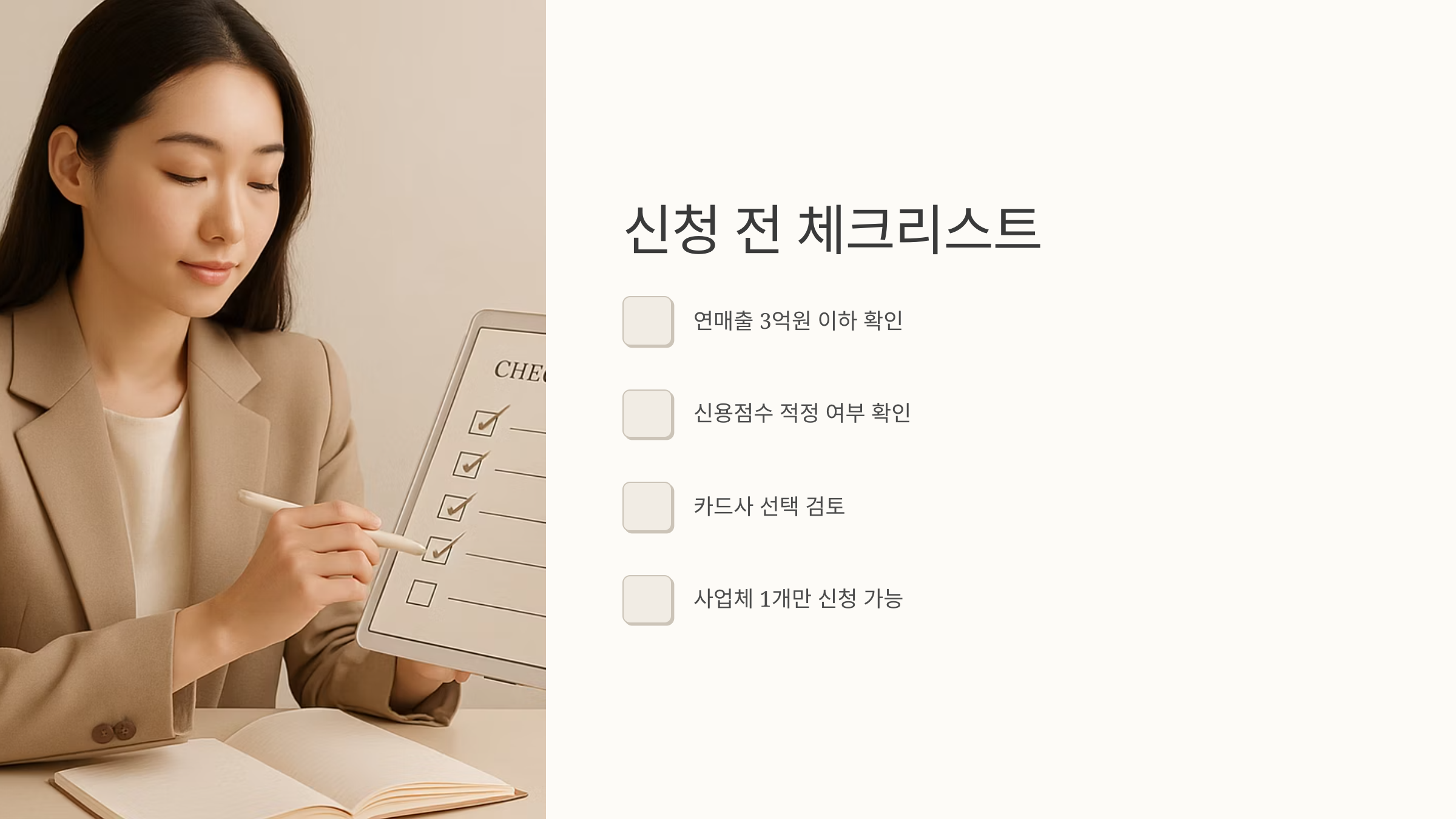 신청 전에 꼭 확인해야 할 사항들이 있습니다. 연매출이 3억 원 이하인지, 신용점수는 적정한지, 카드사 선택은 잘했는지, 사업체는 1개만 신청 가능한지, 신청 기간은 맞는지 등등 체크리스트를 꼼꼼하게 확인하는 게 중요해요.