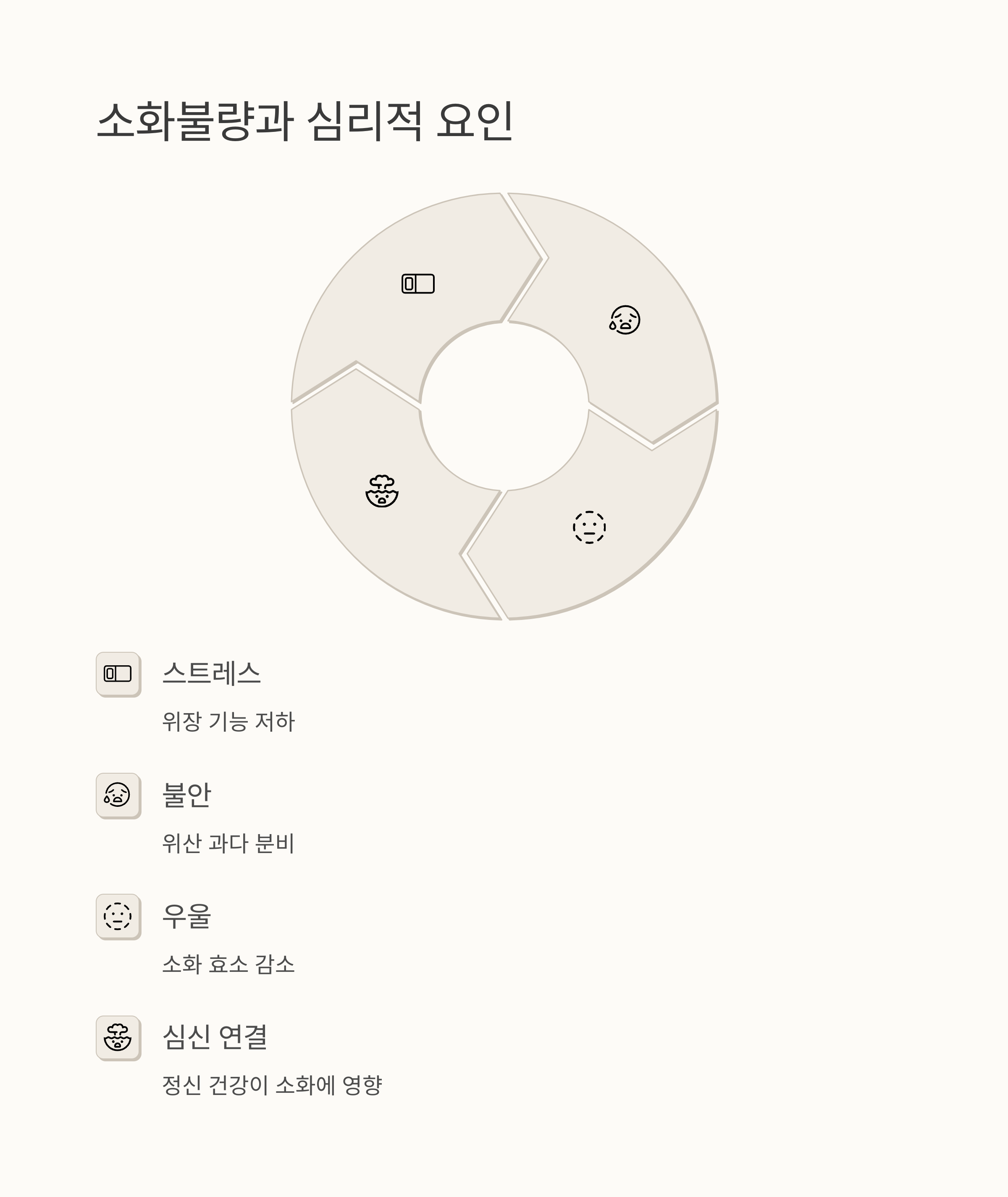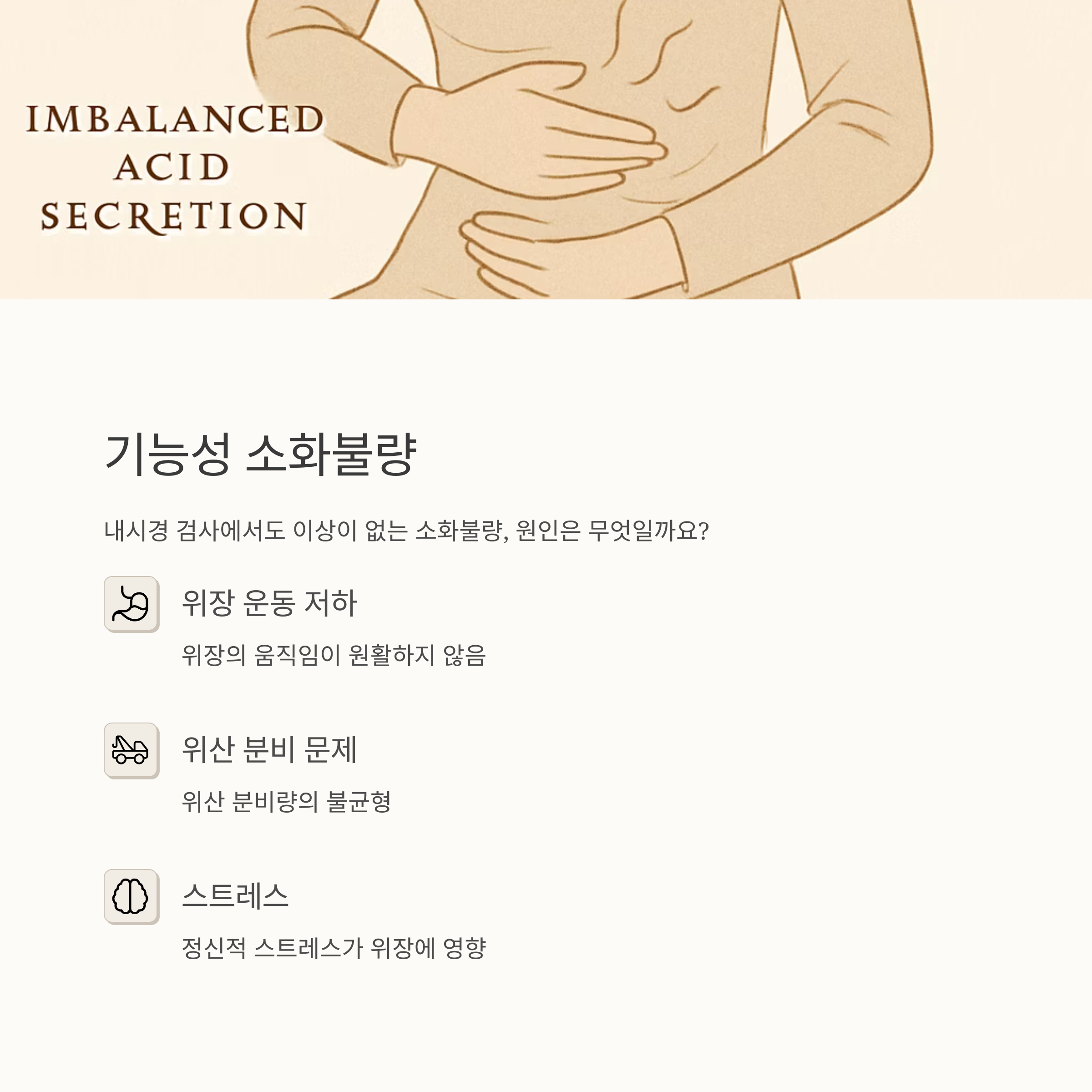 스트레스도 무시 못 해요. 스트레스 받으면 위장이 힘들어하는 게 눈에 보일 정도니까요. 이렇게 다양한 소화불량 원인이 한꺼번에 작용하기도 해요. 때문에, 소화불량을 해결하려면 자신에게 맞는 소화불량 원인을 찾는 게 가장 중요해요.