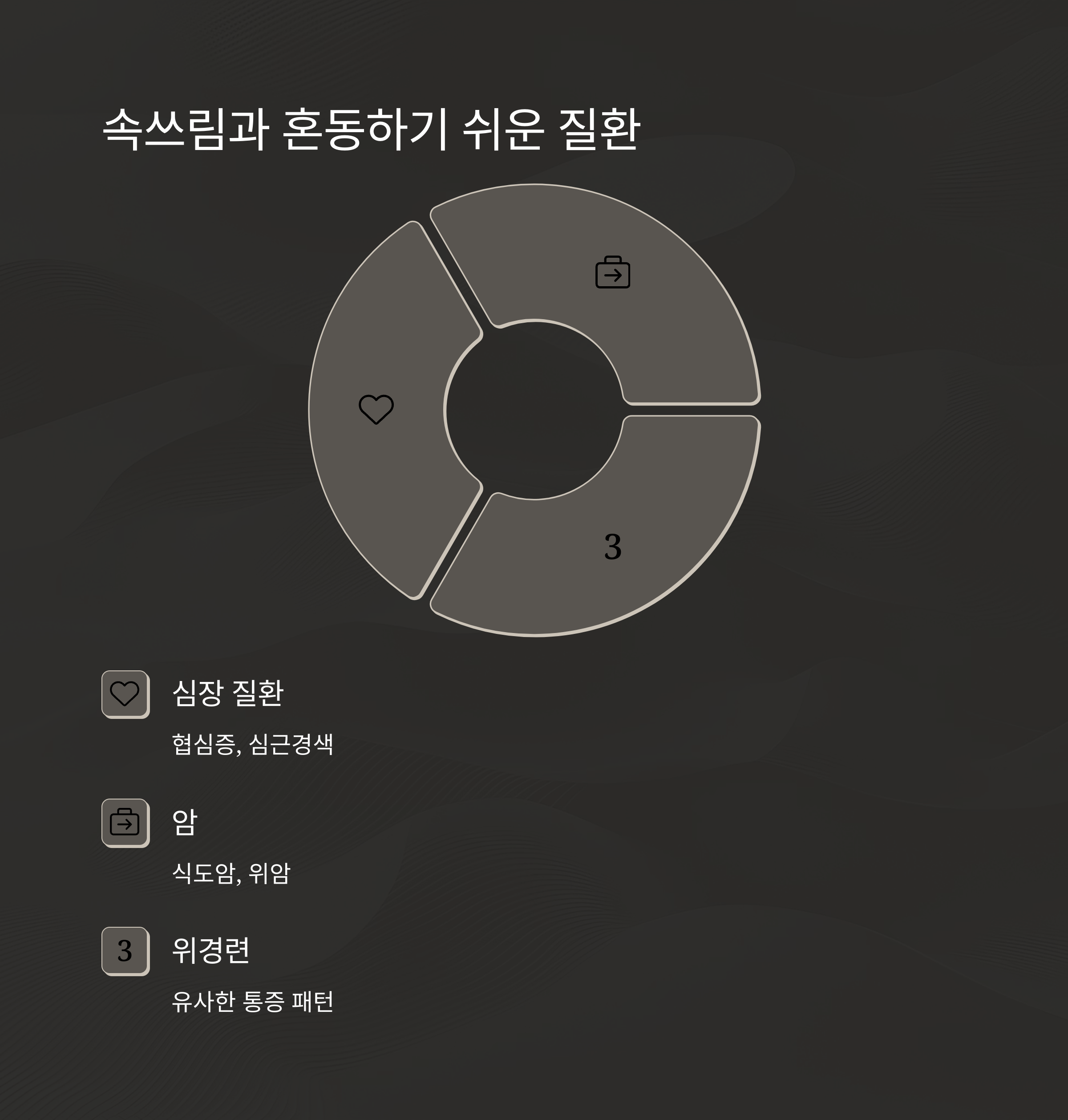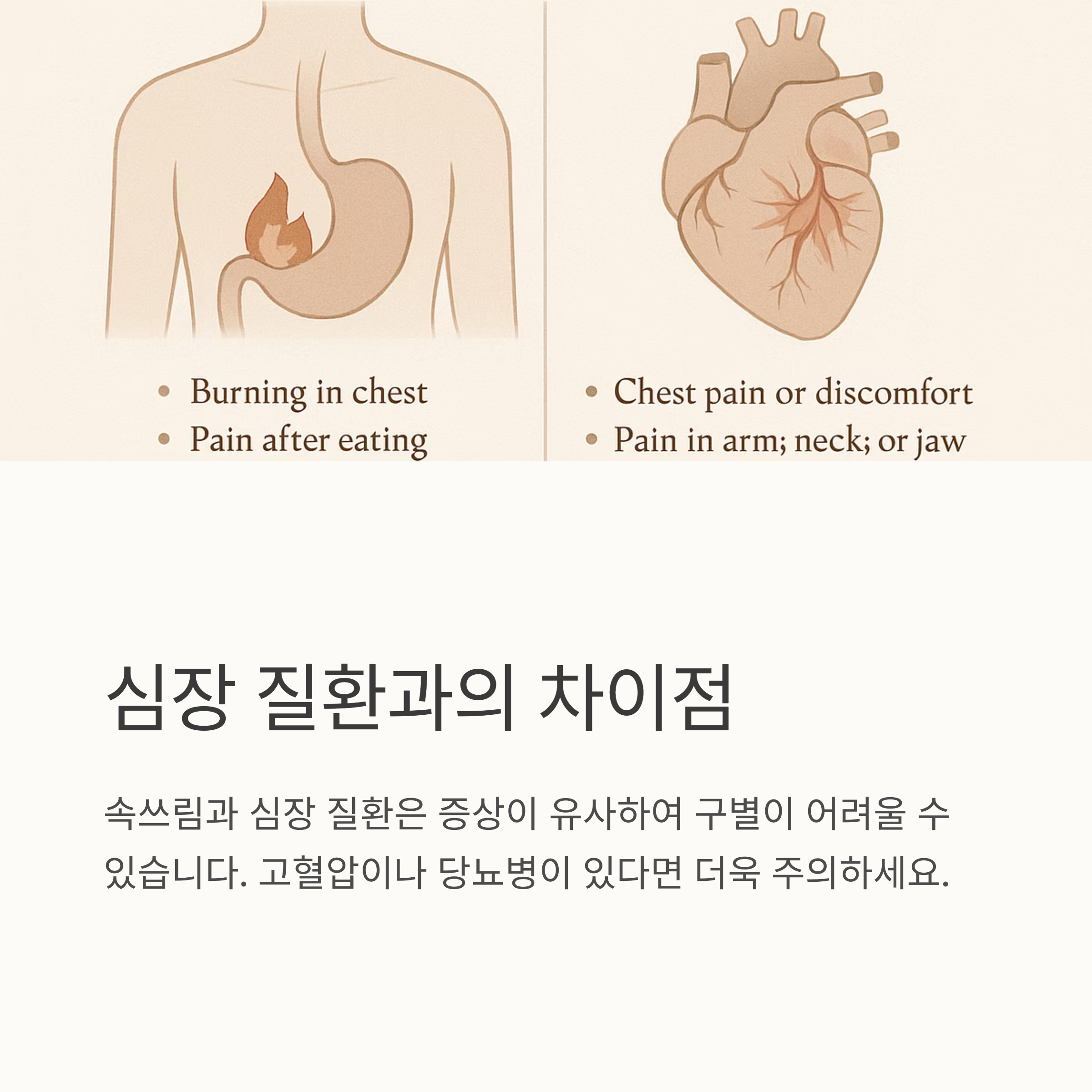 속쓰림 증상은 다른 질환과 혼동하기 쉬운 경우가 많습니다. 가장 헷갈리는 질환 중 하나는 바로 심장 질환입니다. 협심증이나 심근경색의 경우에도 가슴 통증이 나타날 수 있기 때문입니다. 특히 고혈압이나 당뇨병이 있는 분들이라면 더욱 주의해야 합니다. 속쓰림과 심장 질환을 감별하는 것은 의료 전문가에게 맡기는 것이 좋습니다.