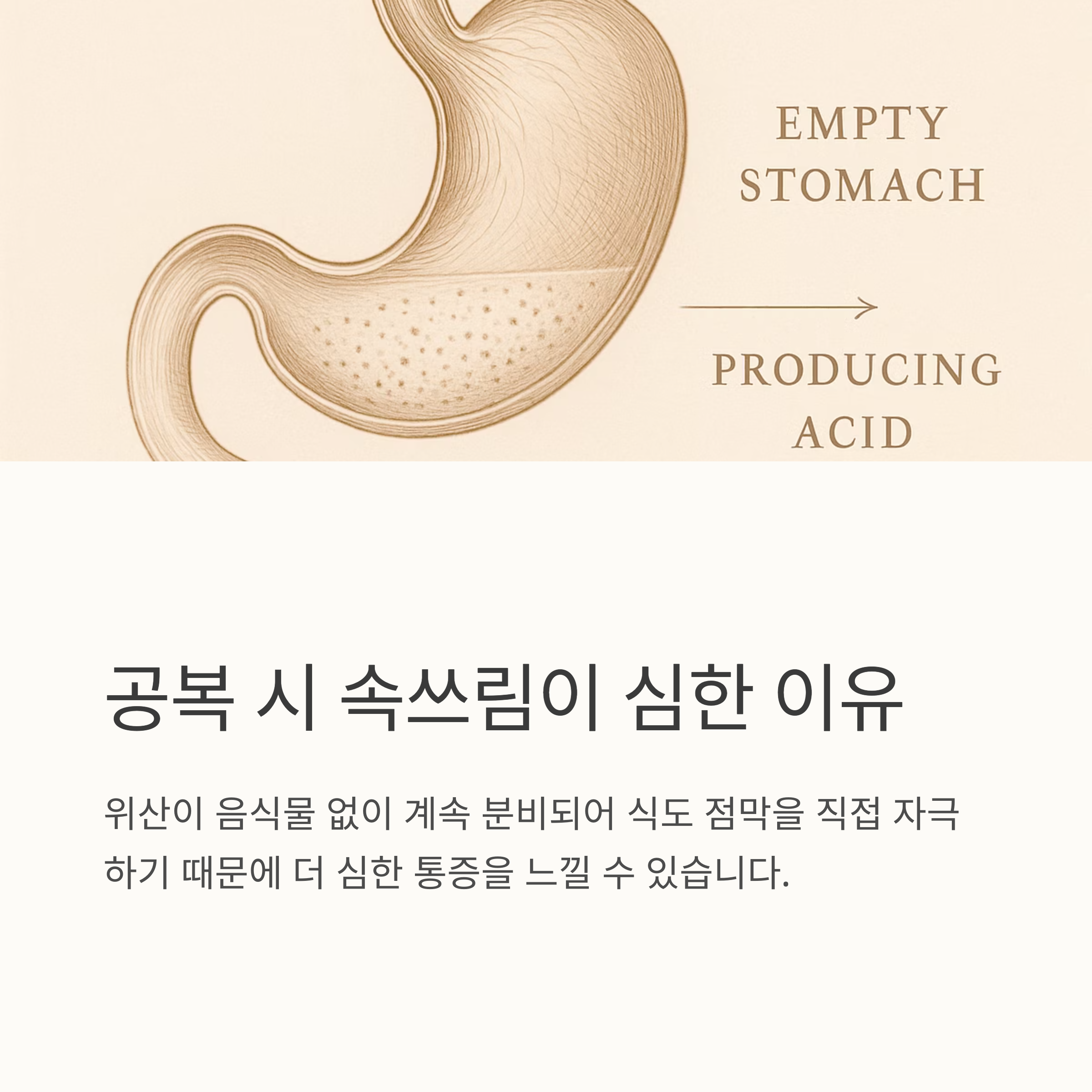 자주 묻는 질문들을 모아봤습니다. 공복에 속쓰림이 더 심해지는 이유는 위산이 음식물 없이도 계속 분비되기 때문입니다. 위산이 식도 점막을 직접 자극하기 때문에 공복 시에는 더욱 심한 통증을 느낄 수 있어요. 속쓰림이 매일 반복된다면? 일주일 이상 지속되거나 수면을 방해할 정도라면 무조건 병원에 가서 정확한 진단을 받아보는 것이 좋습니다.