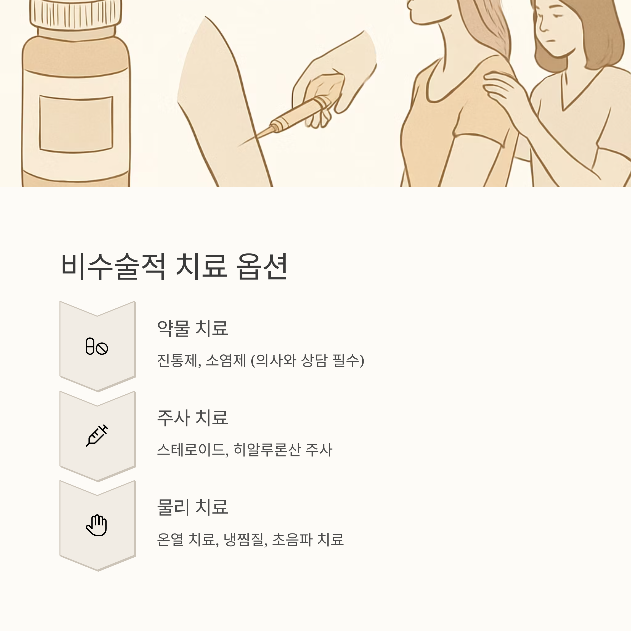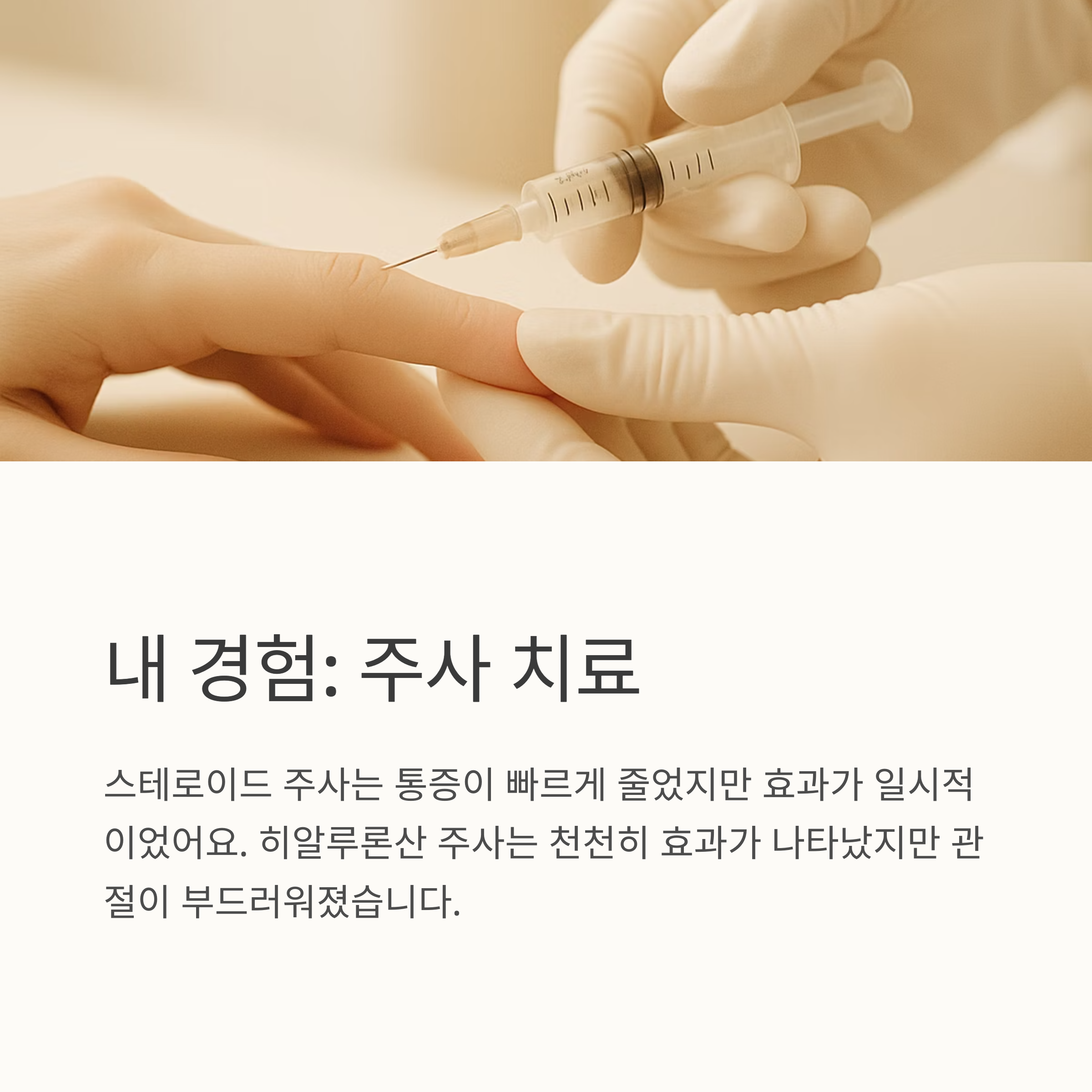 주사 치료는 스테로이드나 히알루론산 주사가 있는데, 스테로이드 주사는 효과가 빠르지만 자주 맞으면 관절에 무리가 갈 수 있어요. 히알루론산 주사는 관절액과 비슷한 성분이라 부작용이 적은 편입니다. 저는 스테로이드 주사와 히알루론산 주사를 번갈아가면서 맞았는데, 스테로이드 주사는 통증이 확실히 줄어들었지만 효과가 일시적이었어요.