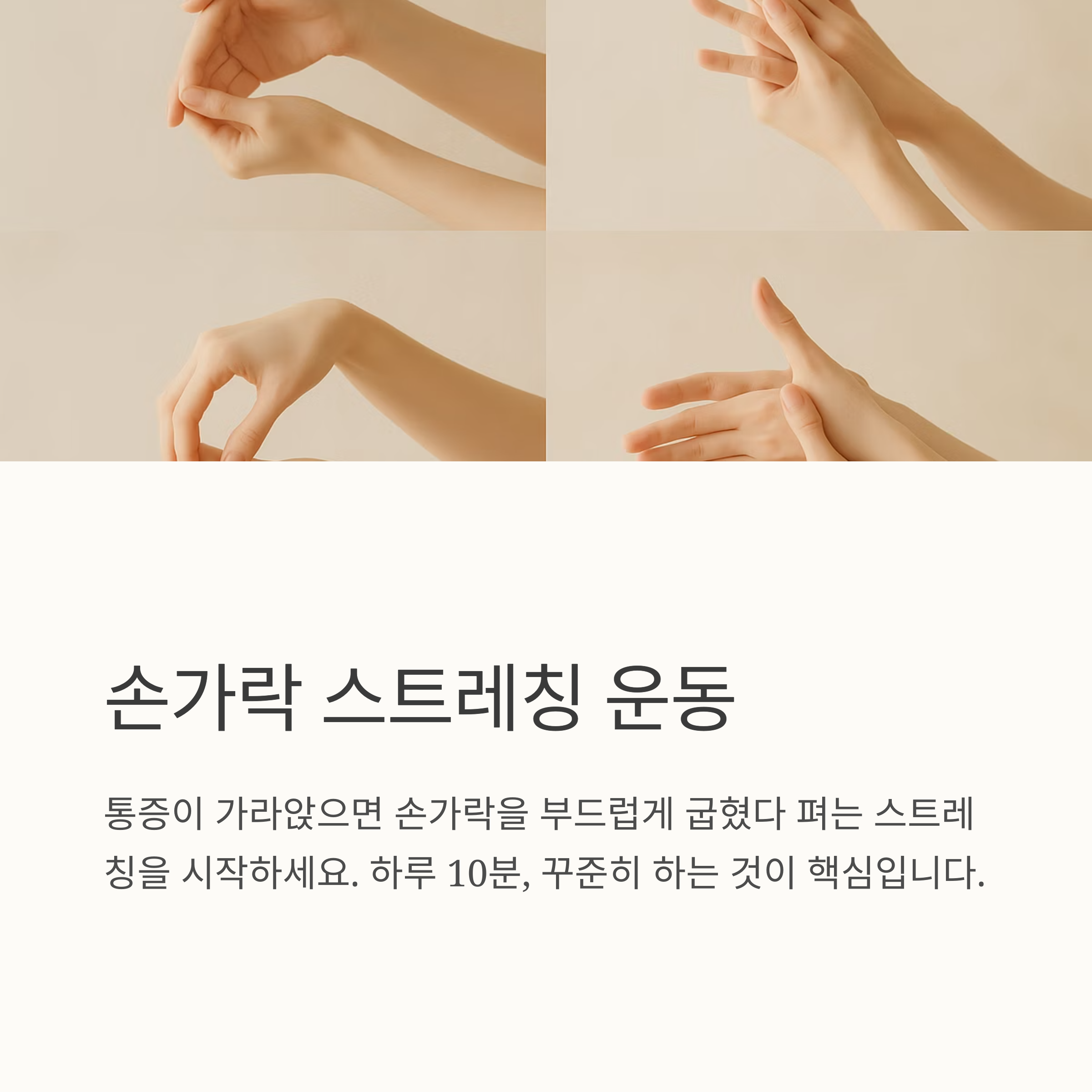 손가락을 굽혔다 폈다 하는 간단한 스트레칭부터 고무공을 쥐었다 놓는 운동, 작은 물건을 집어 옮기는 운동 등 다양한 운동을 했죠. 처음에는 힘들었지만 점점 익숙해지면서 손가락 움직임이 부드러워지는 것을 느꼈습니다. 그리고 따뜻한 물에 손을 담그거나 냉찜질을 하는 것도 통증 완화에 도움이 됩니다.