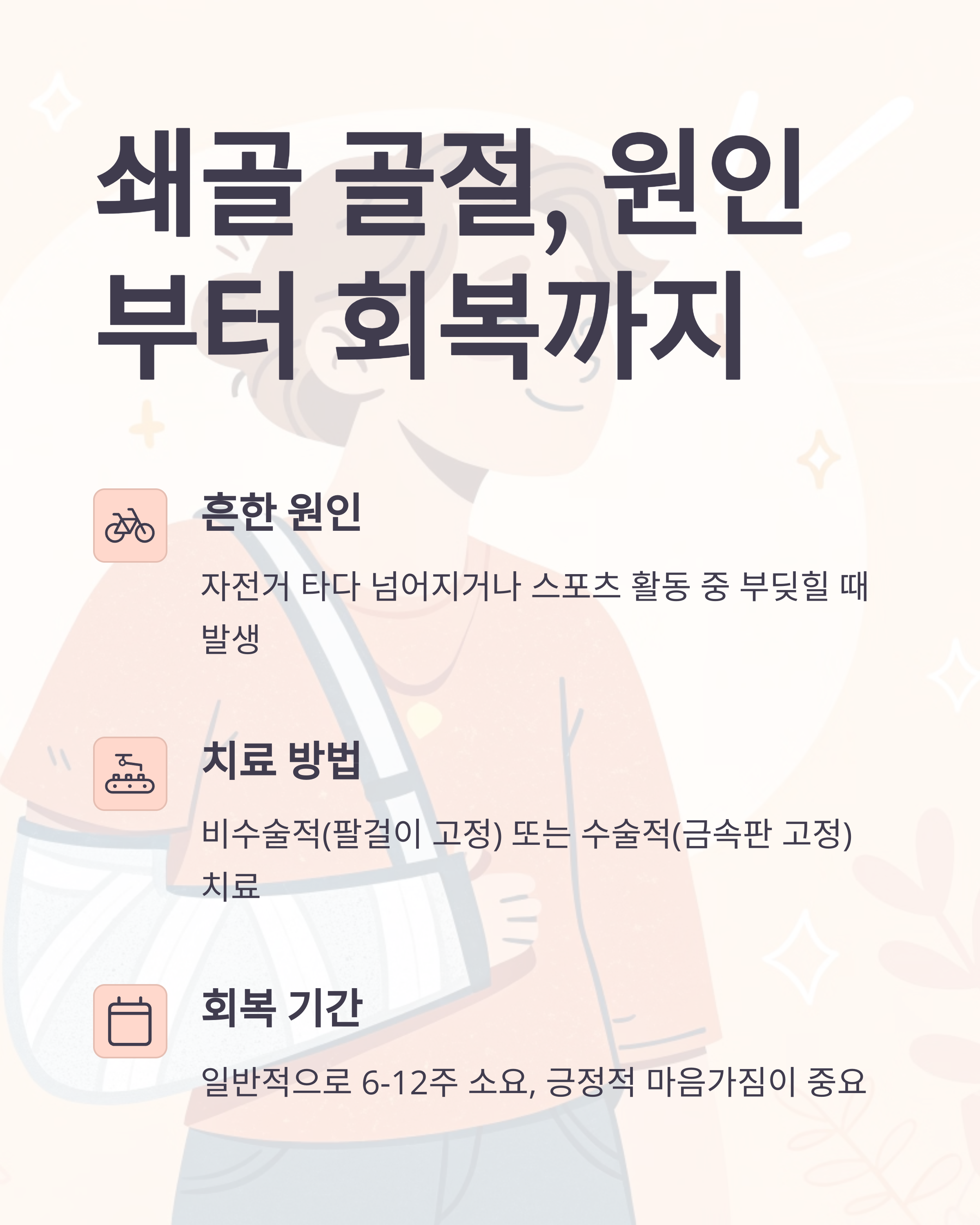 안녕하세요! 쇄골 골절 때문에 걱정이 많으시죠? 자전거 타다 넘어졌을 때, 갑자기 겪게 된 쇄골 골절, 누구에게나 일어날 수 있는 일이에요. 원인부터 치료, 회복 과정까지, 친구처럼 친근하게 모든 정보를 알려드릴게요! 이제부터 쇄골 통증에서 벗어나 건강하게 회복하는 여정을 함께 떠나봐요!