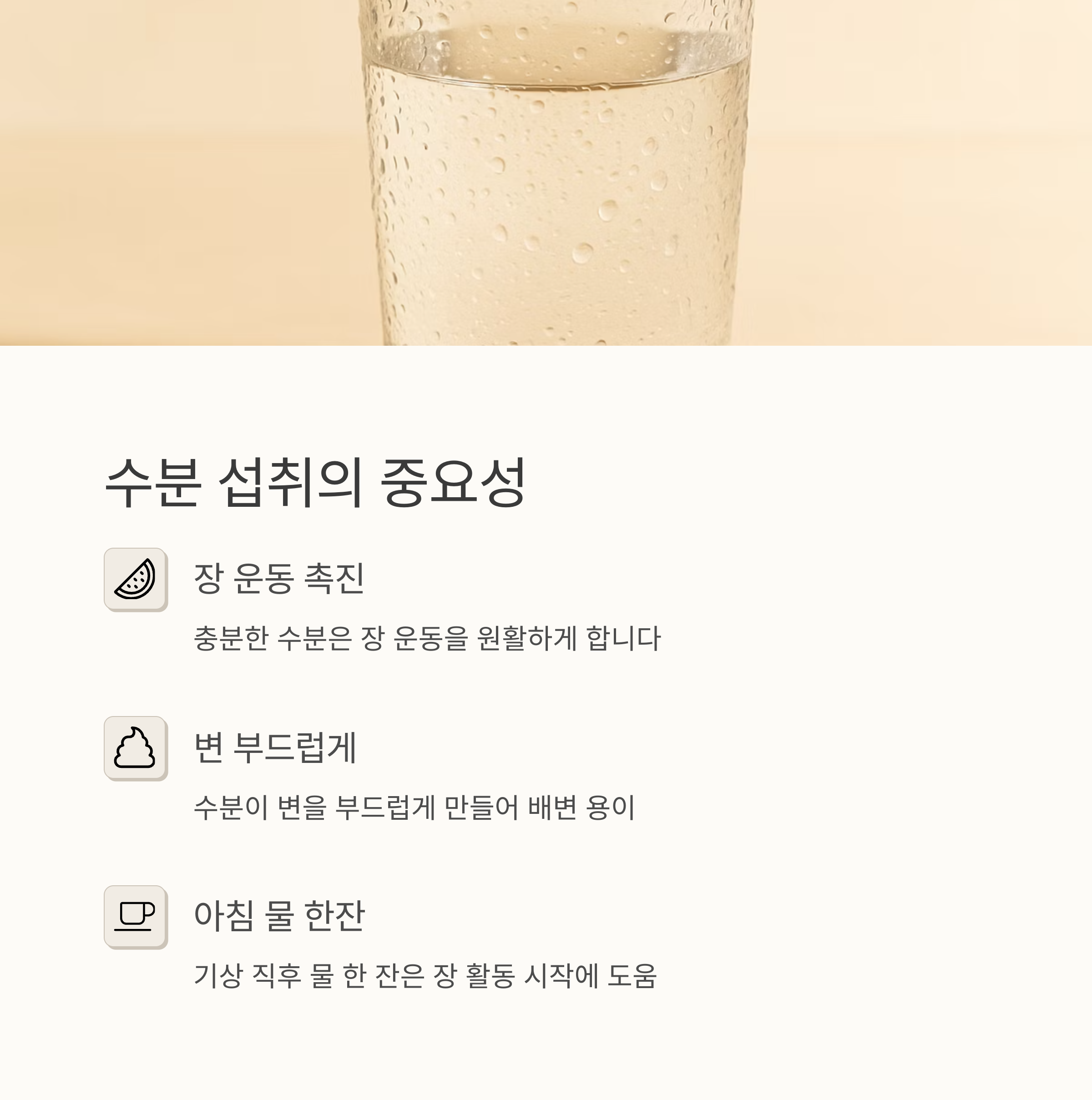 그리고 무엇보다 중요한 것은 바로 수분 섭취입니다. 물을 충분히 마셔야 장 운동이 원활하게 이루어지고 변이 부드러워져서 배변 활동이 더욱 수월해진답니다. 저는 아침에 일어나자마자 물 한 잔을 마시고, 하루 종일 물을 자주 마시려고 노력하고 있어요. 수분 함량이 높은 과일이나 채소도 함께 섭취하면 더욱 효과적이랍니다. 수박이나 오이, 바나나 같은 과일과 채소를 섭취하는 것도 좋은 방법이겠죠?