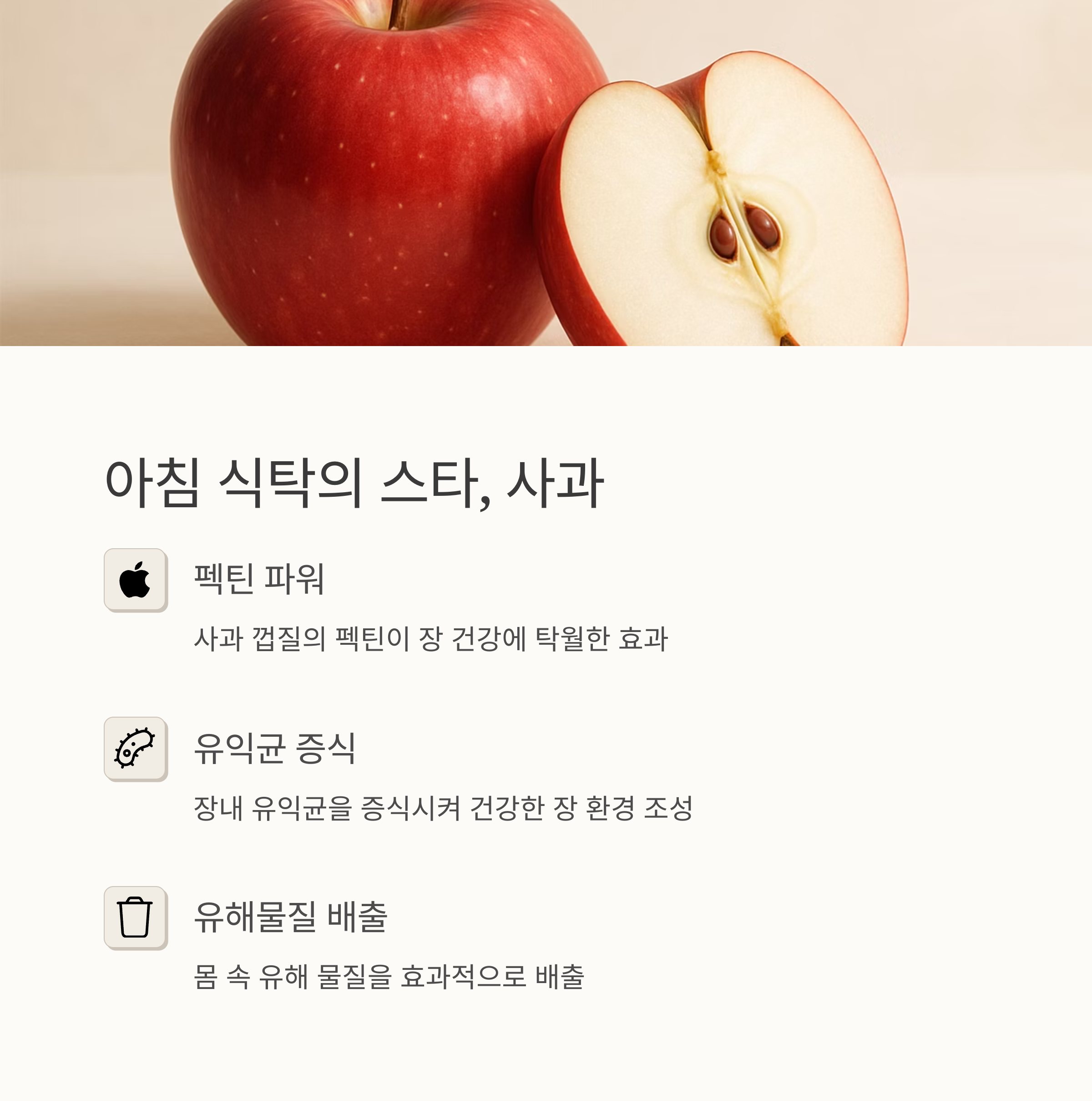 아삭아삭한 사과, 정말 좋아하죠? 사과는 아침에 먹으면 변비 예방에 효과적이라고 해요. 특히 사과 껍질에 있는 펙틴이라는 식이섬유가 장 건강에 좋대요. 저는 아침마다 사과를 껍질째 먹으려고 노력하는데요, 껍질을 깎아 먹는 것보다 훨씬 더 섬유질을 많이 섭취할 수 있거든요.