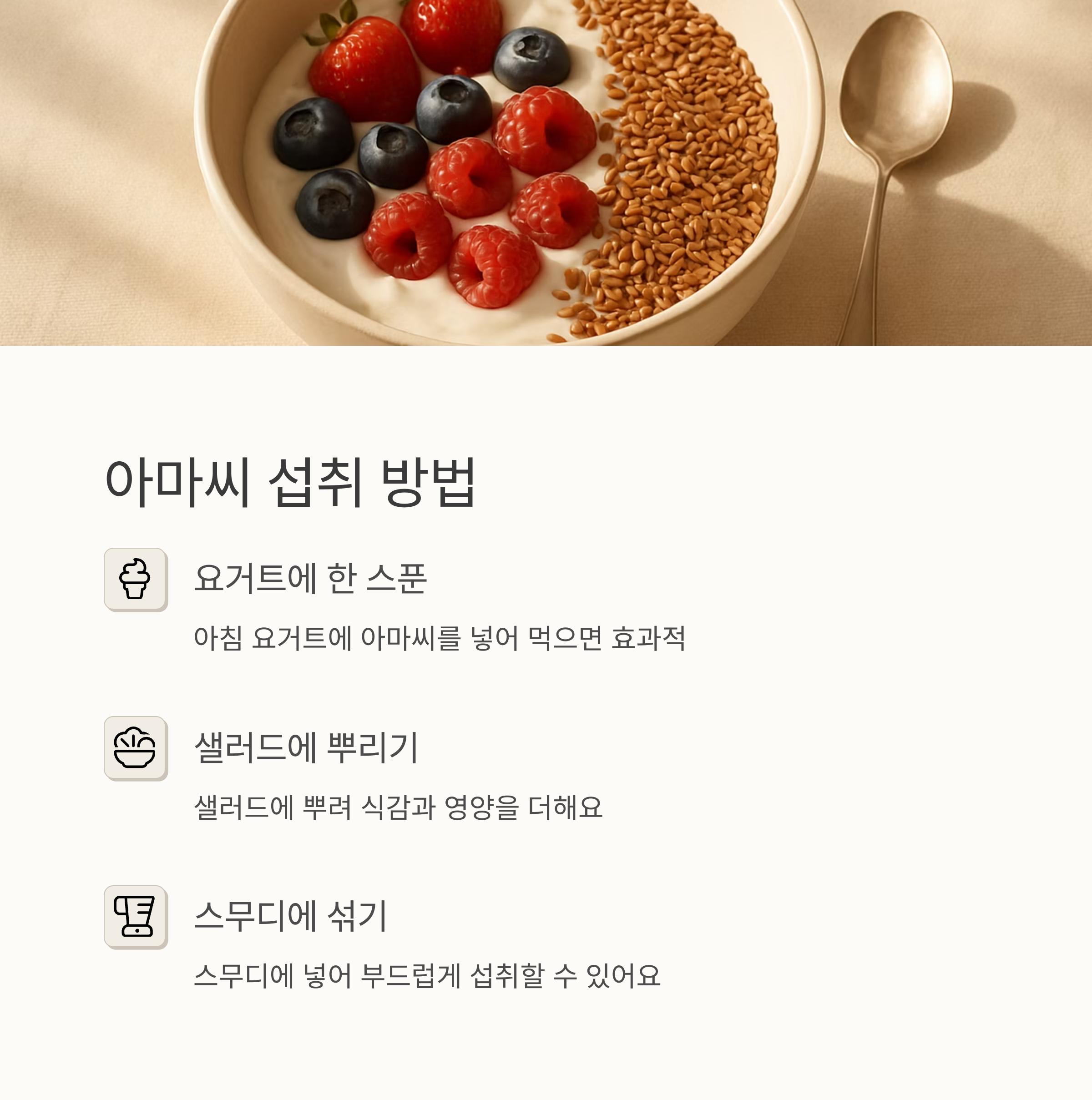 처음에는 씹는 질감이 조금 낯설었지만, 이제는 아마씨 없으면 아침이 허전할 정도예요. 아마씨를 꾸준히 먹으면서 변비 뿐 아니라 피부 트러블도 많이 좋아진 것 같아요. 아마씨를 섭취할 때는 물을 충분히 마셔주는 것이 중요해요.