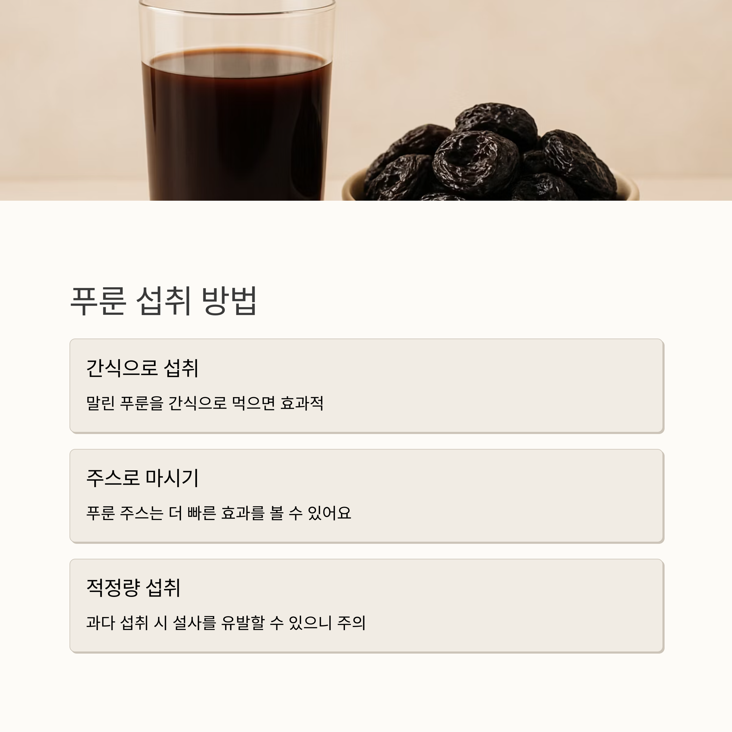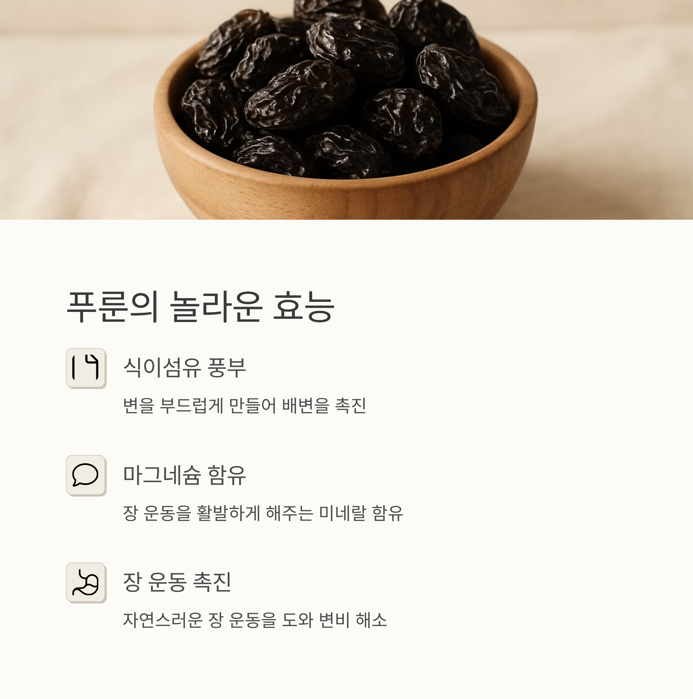 푸룬은 변비에 효과적이라고 소문이 자자하죠? 저도 푸룬을 꾸준히 먹으면서 변비가 많이 좋아졌어요. 푸룬에는 식이섬유와 마그네슘이 풍부하게 들어있어서 장 운동을 활발하게 해주는 효과가 있대요. 저는 푸룬 주스나 말린 푸룬을 간식으로 먹는데, 너무 많이 먹으면 설사를 할 수 있으니 적당량을 섭취하는 것이 중요해요.