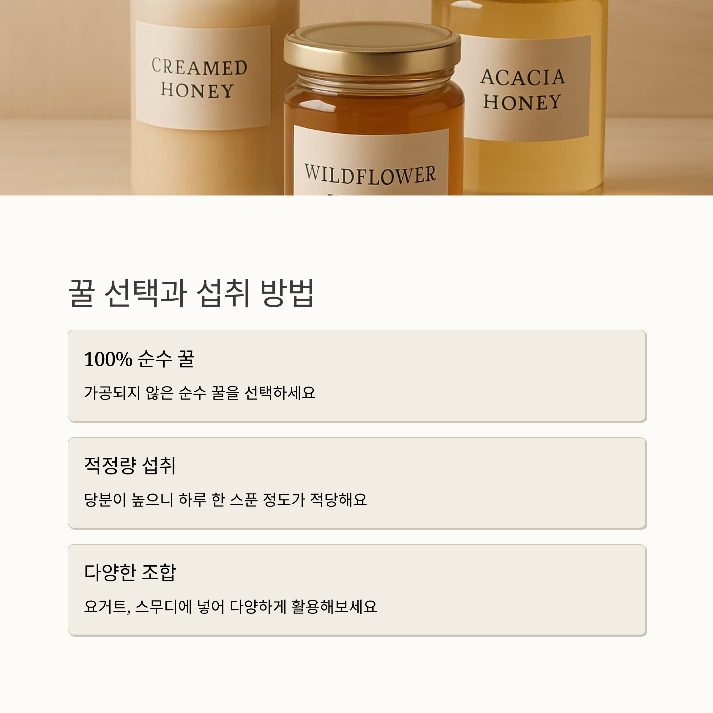 꿀을 선택할 때는 100% 순수 꿀을 고르는 것이 중요하겠죠? 꿀과 함께 다른 변비 해결에 도움이 되는 음식들을 함께 섭취하면 더 좋은 효과를 볼 수 있을 거예요. 꿀은 다양한 음식과 조합해서 먹을 수 있어 좋더라고요. 저는 요거트나 스무디에 넣어 먹기도 합니다.