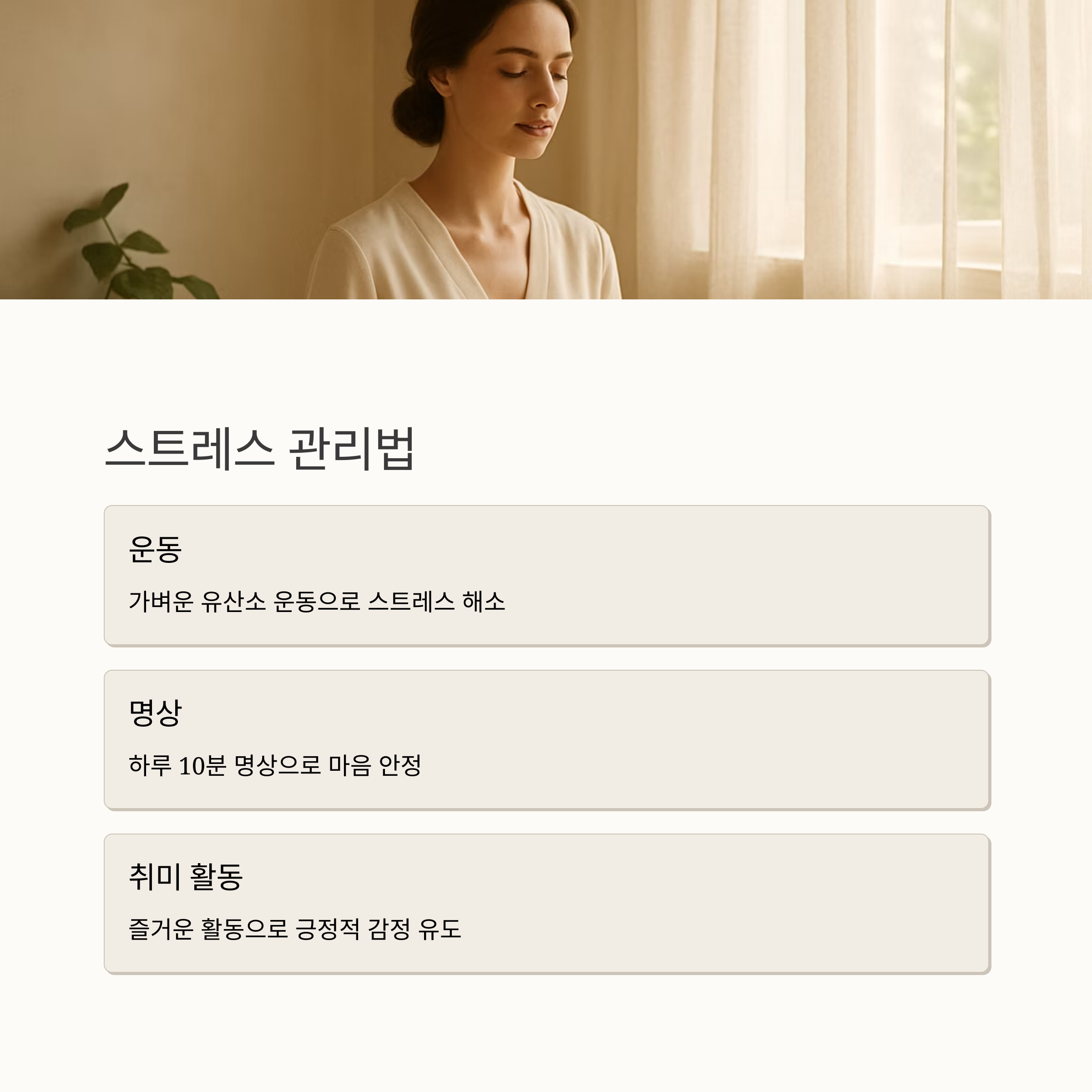 가벼운 운동, 명상, 취미 활동 등 자신에게 맞는 방법을 찾아 꾸준히 실천해보세요. 카페인이나 알코올 섭취를 줄이고, 자극적인 음식은 피하는 것이 좋습니다. 또한, 마음의 평화를 찾기 위해 노력하는 것이 중요해요. 요가나 명상, 심리 상담 등을 통해 마음을 편안하게 유지하는 연습을 해보시면 도움이 될 거예요.