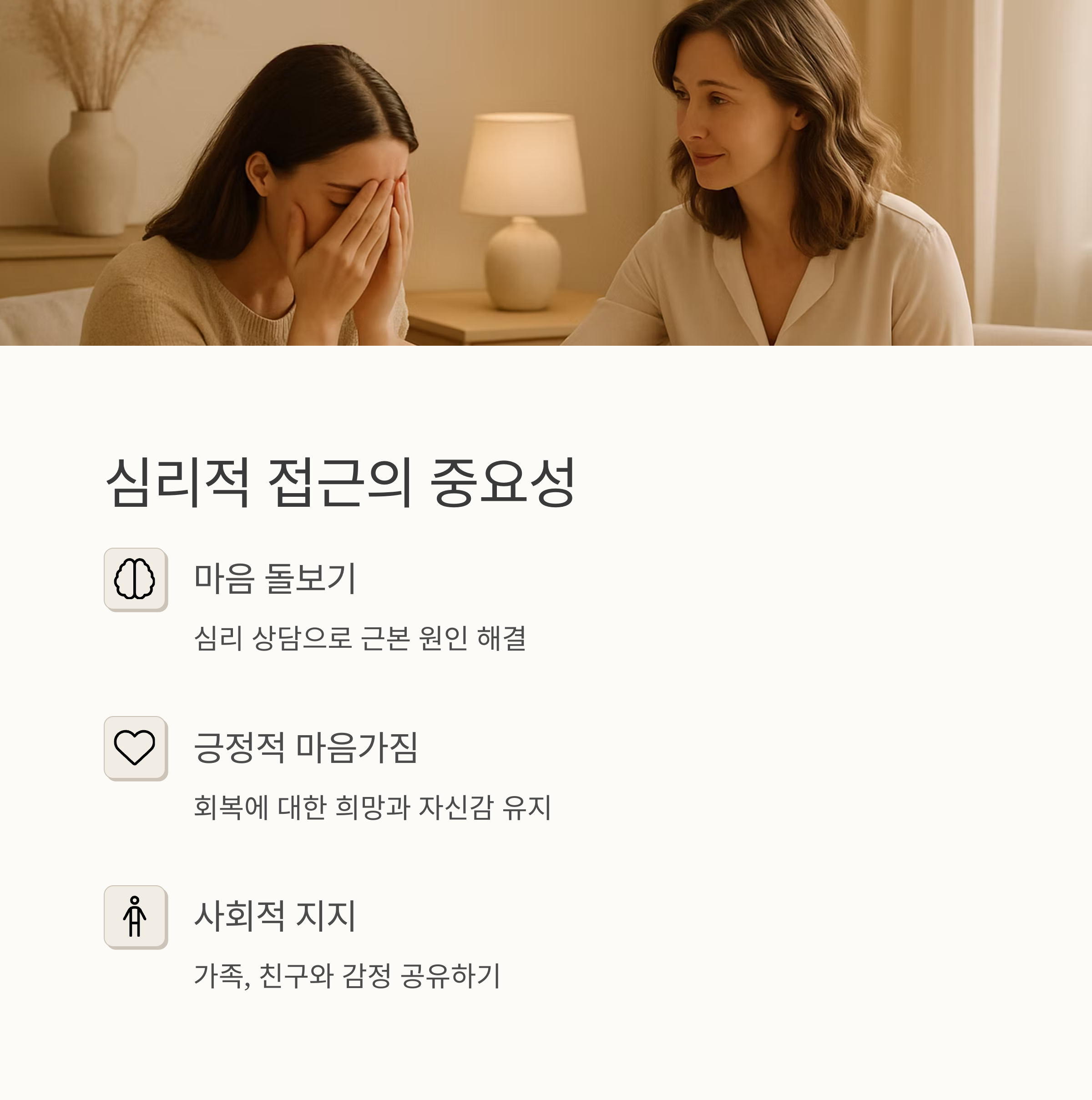 무엇보다 중요한 것은 긍정적인 마음가짐입니다. 힘든 시간 속에서도 포기하지 않고, 자신의 건강을 위해 노력하는 모습은 스스로에게 큰 힘이 될 거예요. 주변 사람들과의 소통과 지지도 큰 도움이 될 수 있으니, 가족이나 친구들과 이야기를 나누고, 힘든 감정을 털어놓는 것을 두려워하지 마세요.