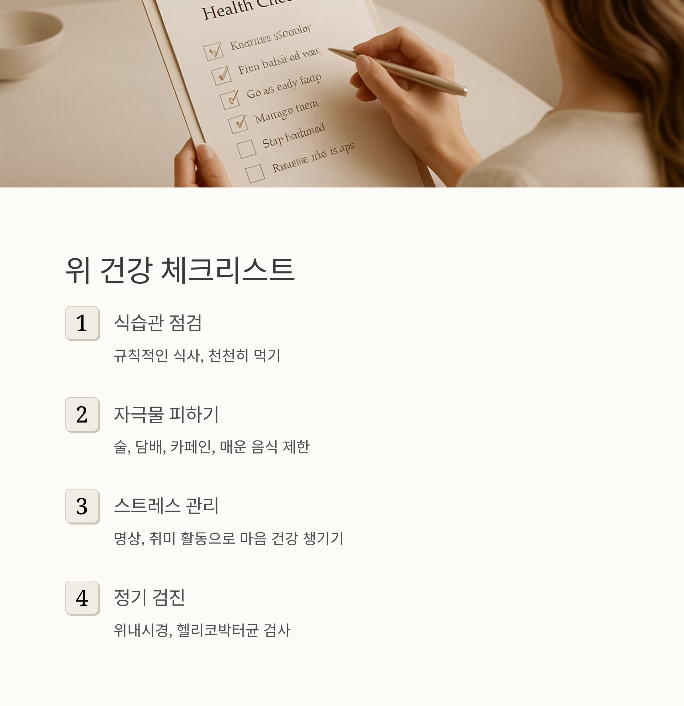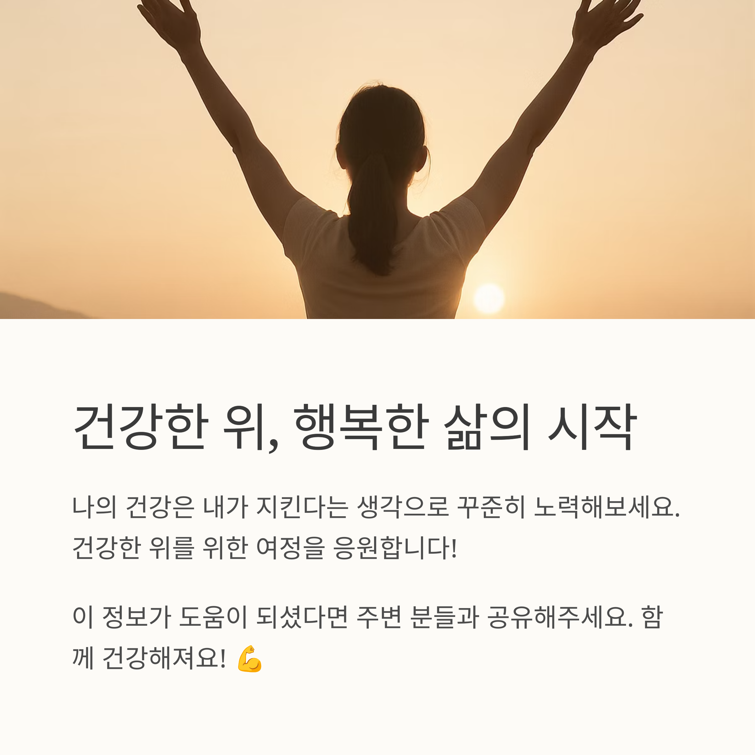 위 건강은 단순히 십이지장 궤양 치료에 좋은 음식만 잘 챙긴다고 되는 게 아니에요. 생활 속 작은 습관들이 모여 건강한 위를 만들어요. 식단과 생활 습관 개선을 통해 위 건강을 꾸준히 관리하면 속 편한 삶을 누릴 수 있을 거예요. 나의 건강은 내가 지킨다는 생각으로 꾸준히 노력해 보세요. 건강한 위를 위한 여정을 응원합니다!