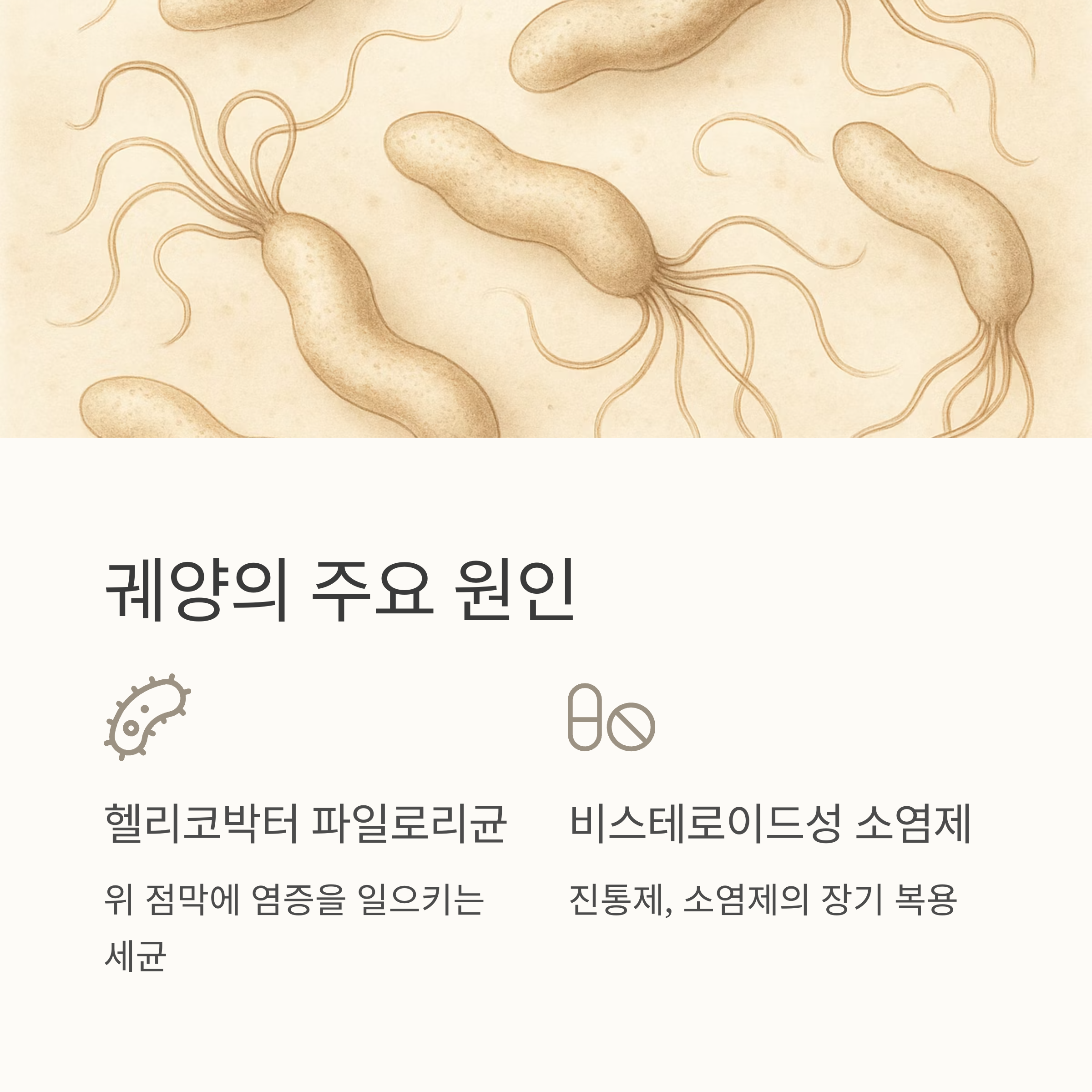 십이지장 궤양은 왜 생길까요? 가장 흔한 원인은 바로 '헬리코박터 파일로리균'이라는 세균이에요. 이 균은 위 점막에 붙어 염증을 일으키고, 위산 분비를 늘려 궤양을 만드는 나쁜 녀석이죠. 또 다른 원인으로는 '비스테로이드성 소염제(NSAIDs)' 라는 약이 있어요. 진통제나 소염제처럼 통증을 줄이는 약인데, 장기간 복용하면 위 점막을 손상시켜 궤양이 생길 위험이 커져요.