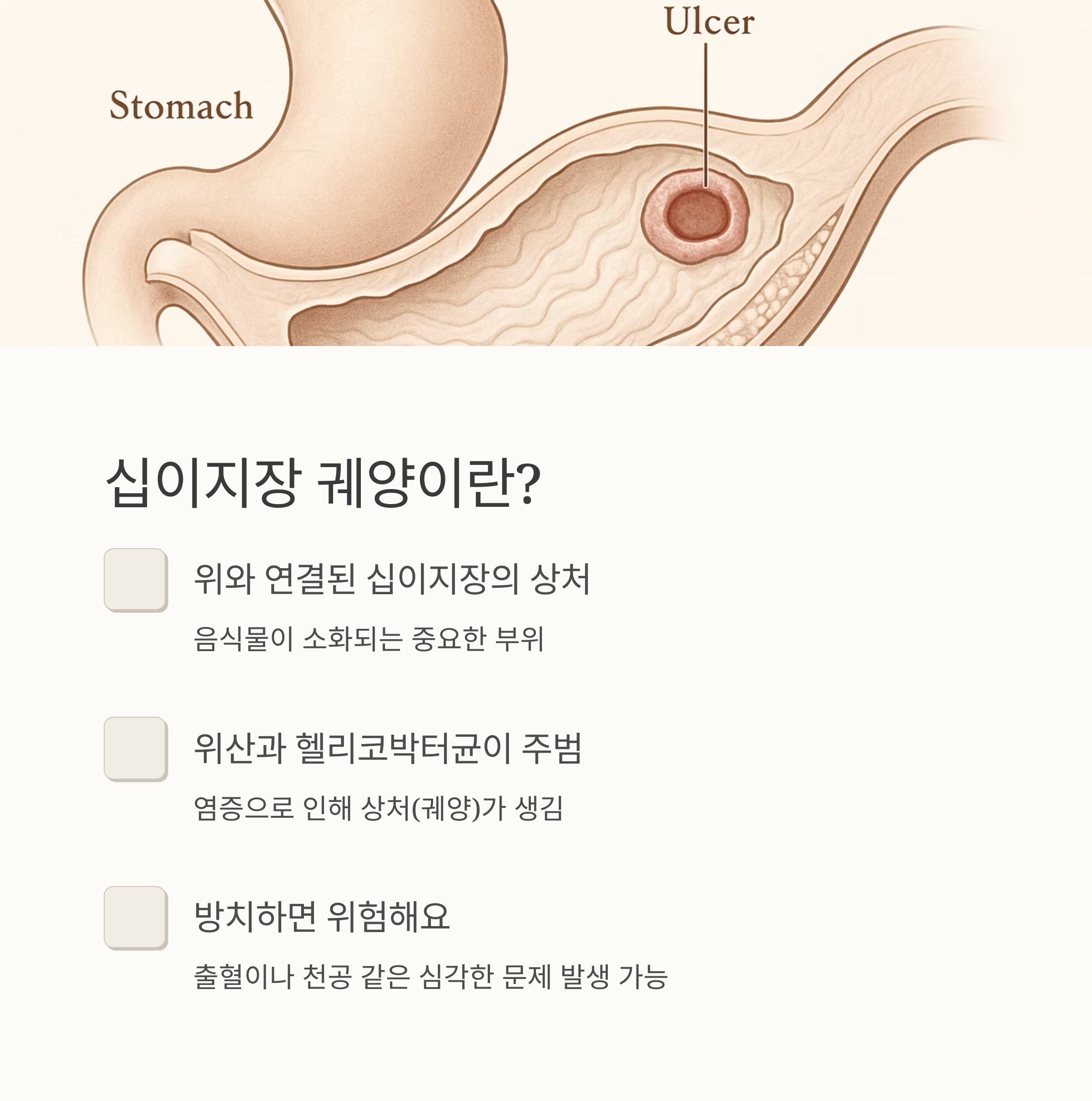 안녕하세요! 속이 쓰리고 아프다면 십이지장 궤양을 의심해볼 수 있어요. 오늘은 십이지장 궤양에 대해 알아보고, 건강한 위를 위한 생활 습관과 식단 관리법을 친절하게 설명해 드릴게요. 함께 건강한 위를 만들어봐요!