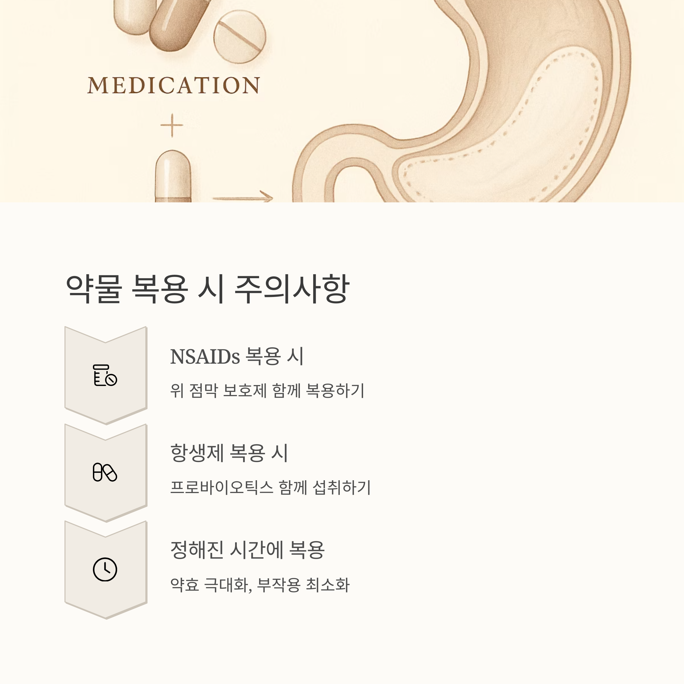 만약 NSAIDs나 스테로이드 같은 약을 먹는다면 위 점막 보호제를 함께 복용하는 것이 좋고, 항생제를 먹을 때는 프로바이오틱스를 함께 섭취해서 장 건강을 챙겨야 해요. 40세 이상이라면 1~2년에 한 번씩 위내시경 검사를 받고, 헬리코박터균 감염 여부도 확인하는 것이 좋습니다. 꾸준히 관리하고 건강한 생활 습관을 유지하면 건강한 위를 유지할 수 있어요. 건강한 위, 긍정적인 마음으로 시작해요!