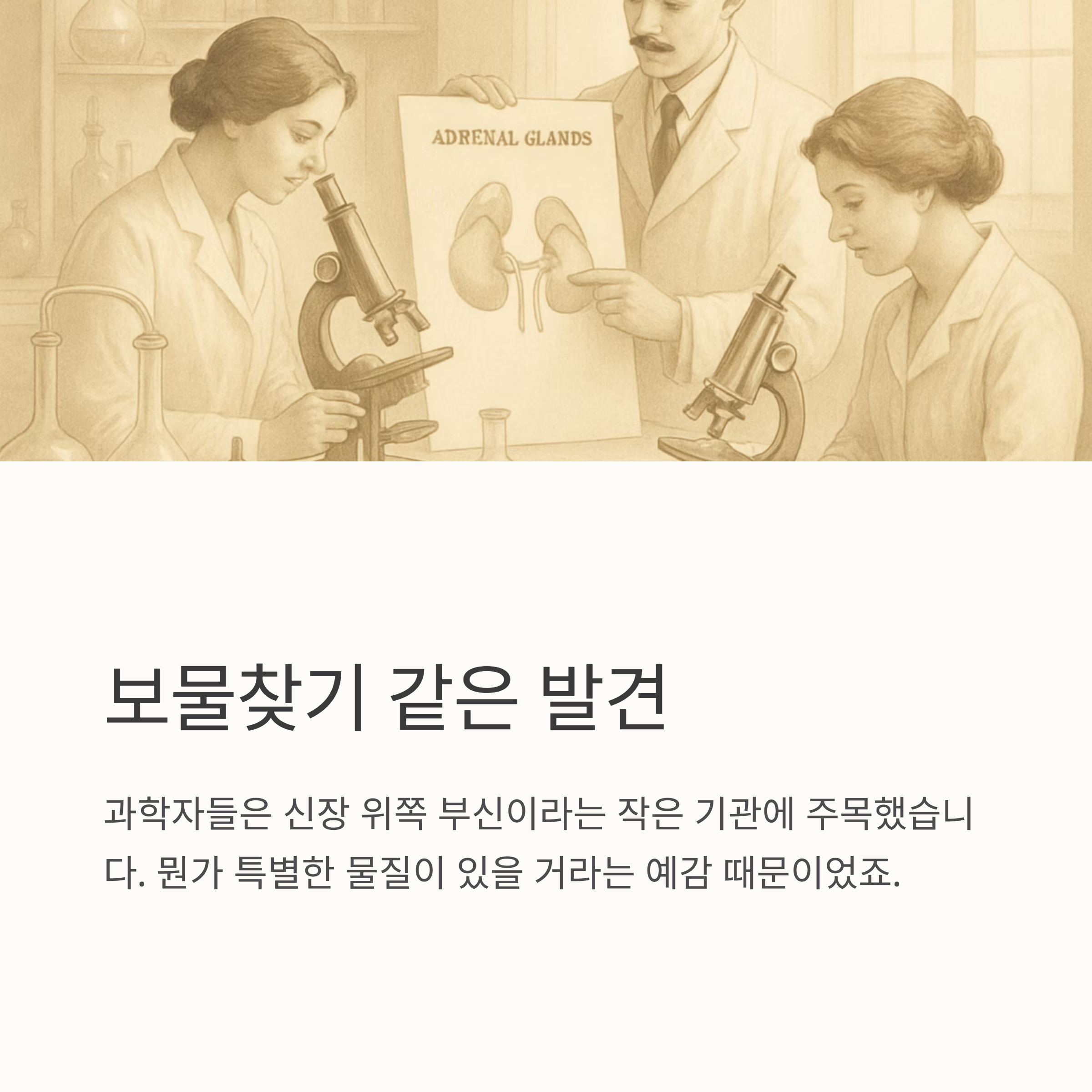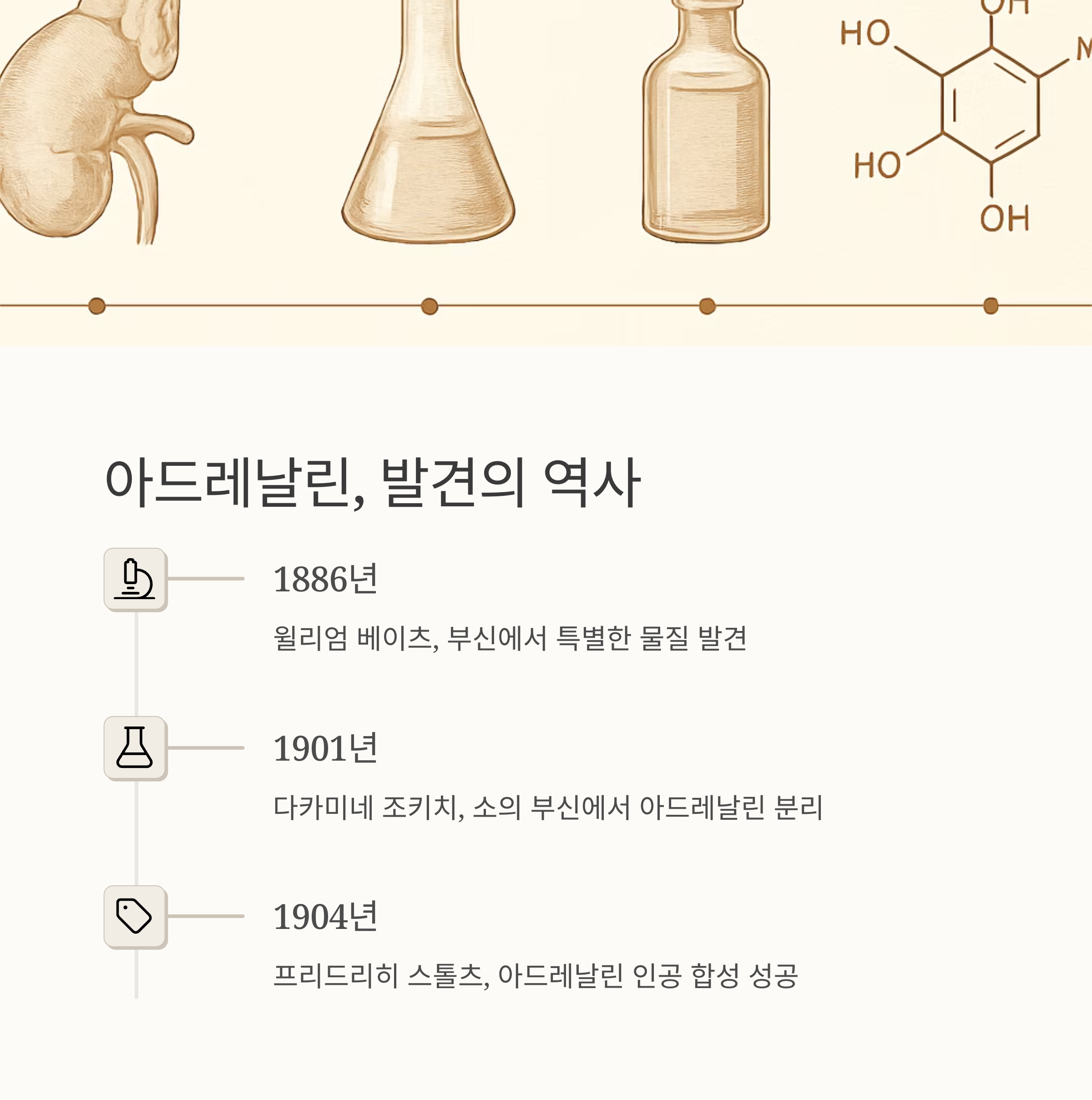 뭔가 특별한 물질이 있을 거라는 예감 때문이었죠. 1886년, 윌리엄 베이츠는 부신에서 특별한 물질을 발견하는 데 성공했고, 이후 1901년 다카미네 조키치 박사가 소의 부신에서 아드레날린을 분리해 냈습니다. 보물찾기처럼 말이죠! 그리고 1904년, 프리드리히 스톨츠가 아드레날린을 인공적으로 합성하는 데 성공하면서, 본격적인 연구가 시작되었습니다.