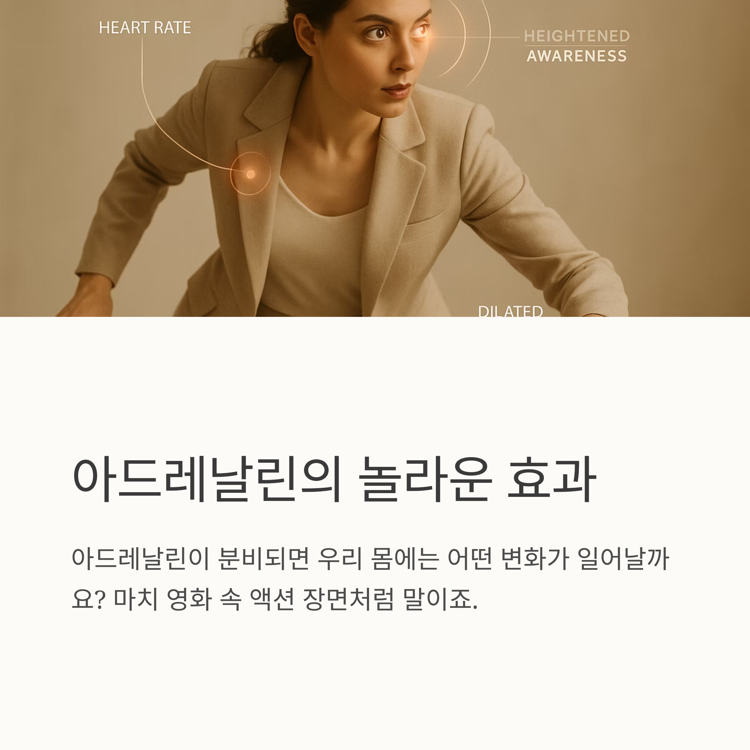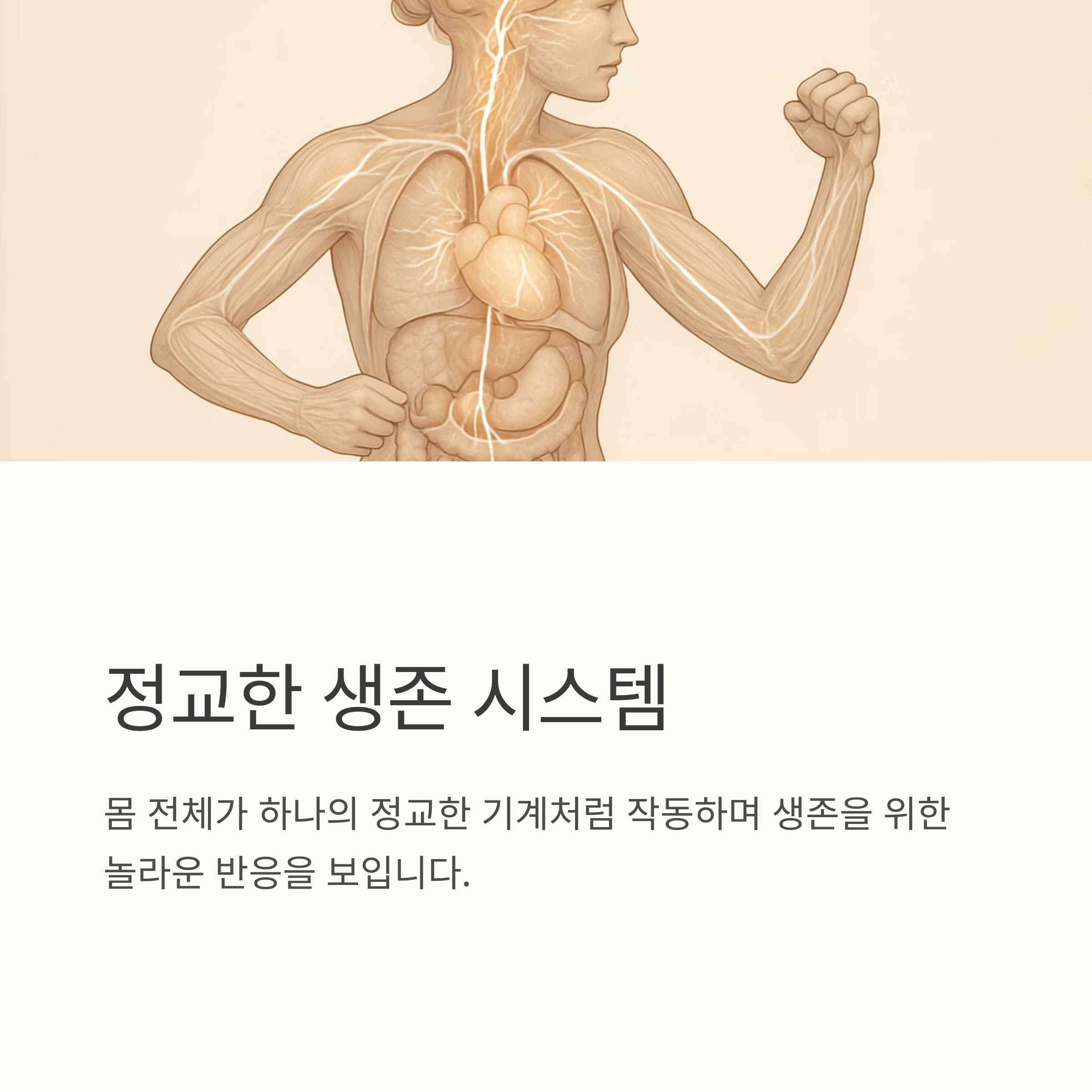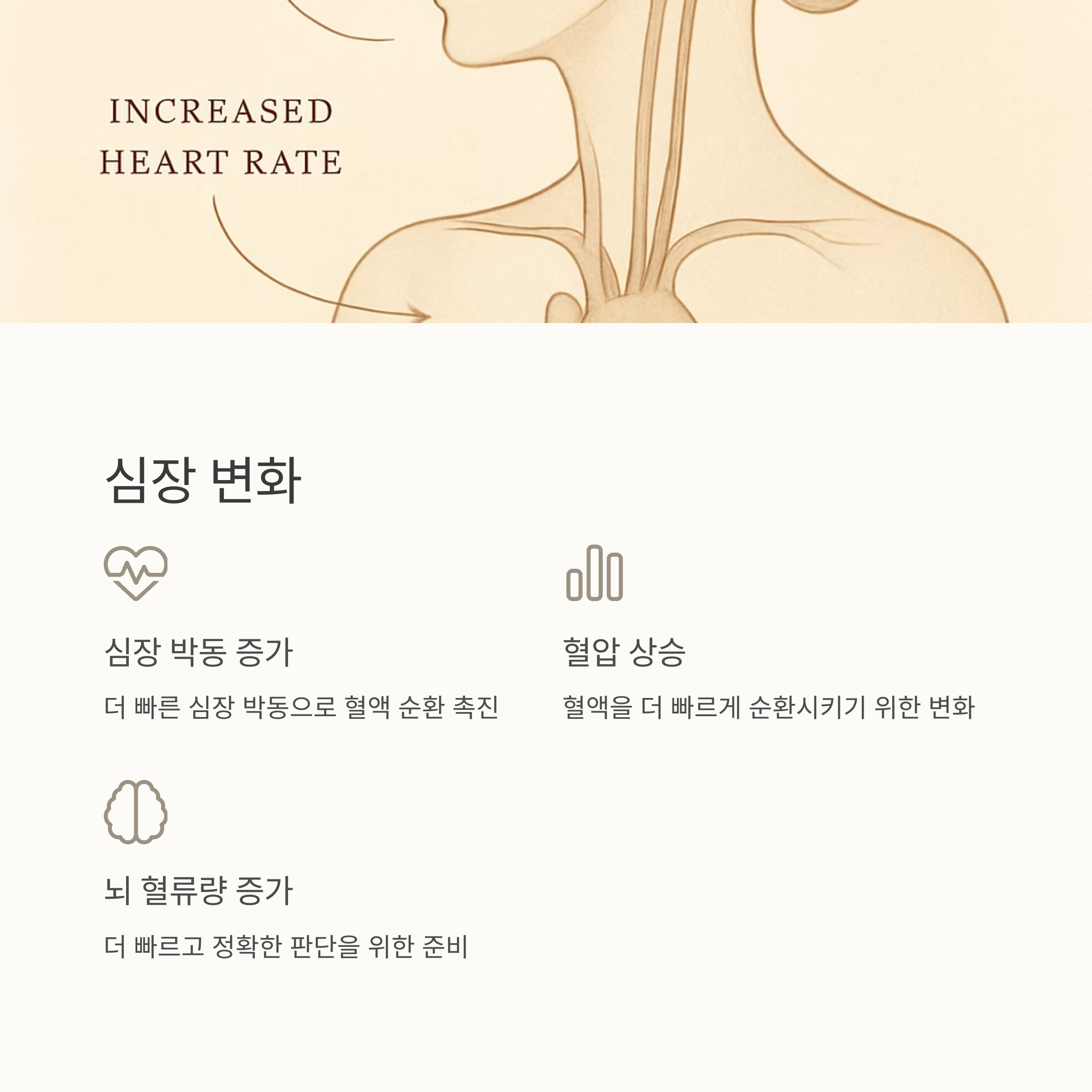 아드레날린이 분비되면 우리 몸에는 어떤 변화가 일어날까요? 영화 속 액션 장면처럼 말이죠. 심장이 쿵쾅거리고, 숨이 가빠지고, 시야가 좁아지면서, 주변의 소리가 희미해지는 것 같기도 합니다. 하지만 이 모든 것은 우리 몸이 생존을 위해 최선을 다하는 모습입니다.