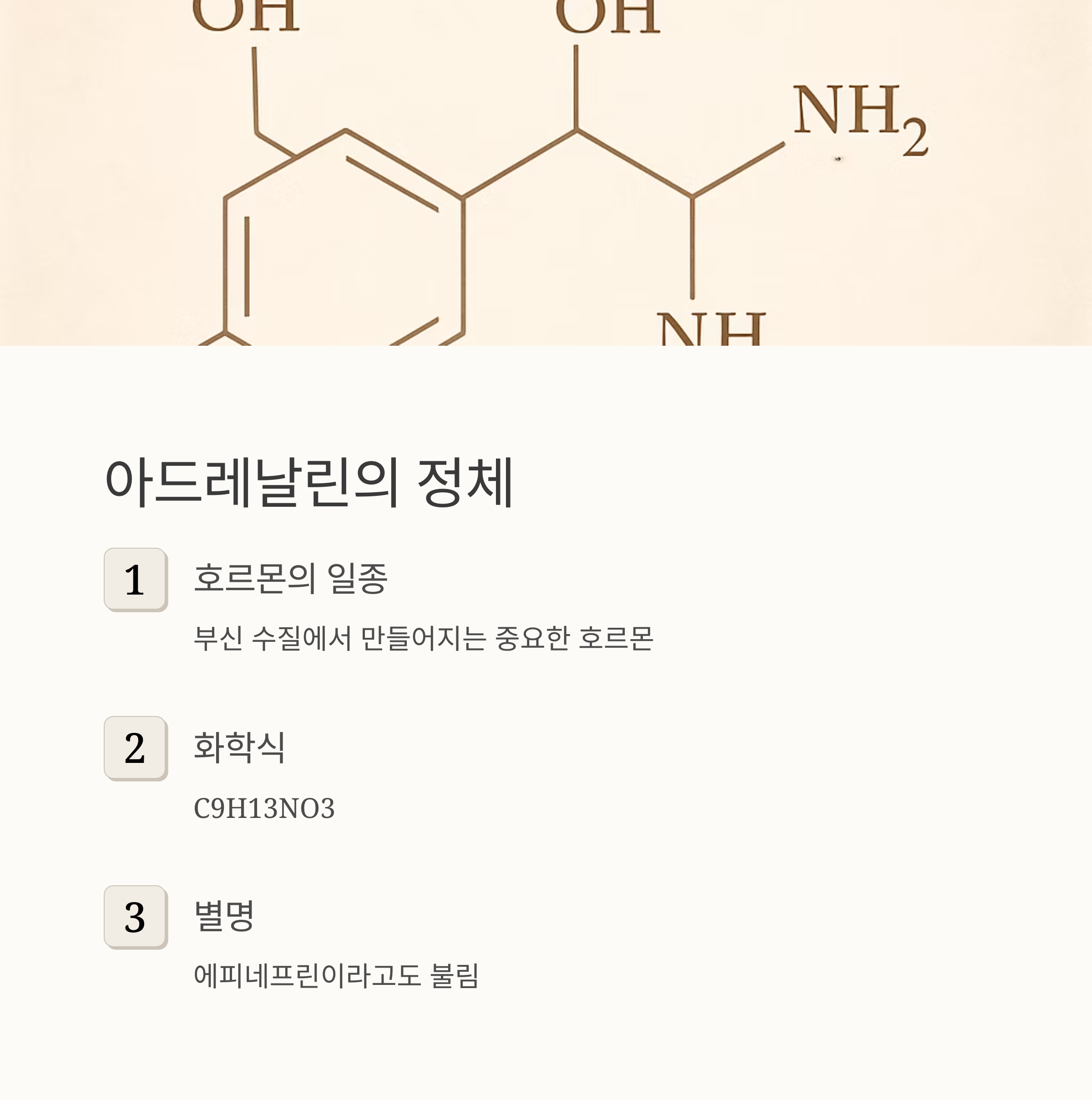 자, 이제 아드레날린이 뭘 하는지 좀 더 자세히 알아볼까요? 아드레날린, 이름만 들어도 뭔가 엄청난 힘을 가진 슈퍼히어로 같지 않나요? 실제로도 그렇습니다. 아드레날린은 에피네프린이라고도 불리는데, 우리 몸의 부신 수질에서 만들어지는 호르몬입니다. 화학식은 C9H13NO3 이라고 하네요.