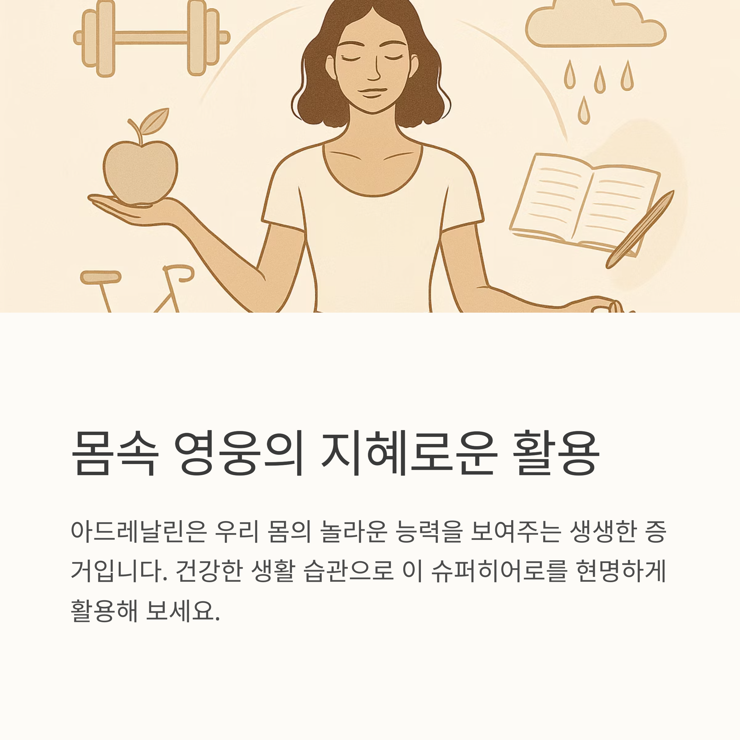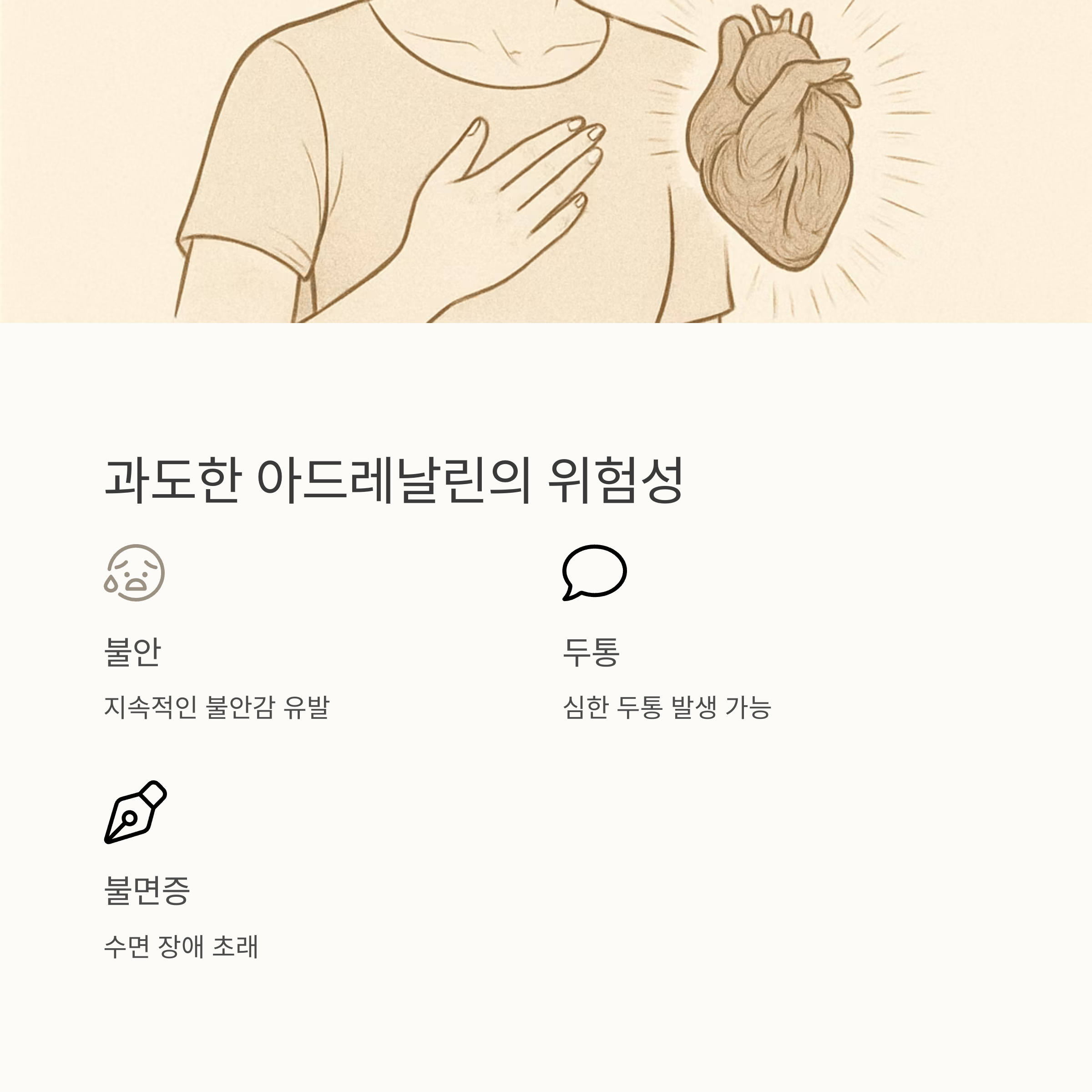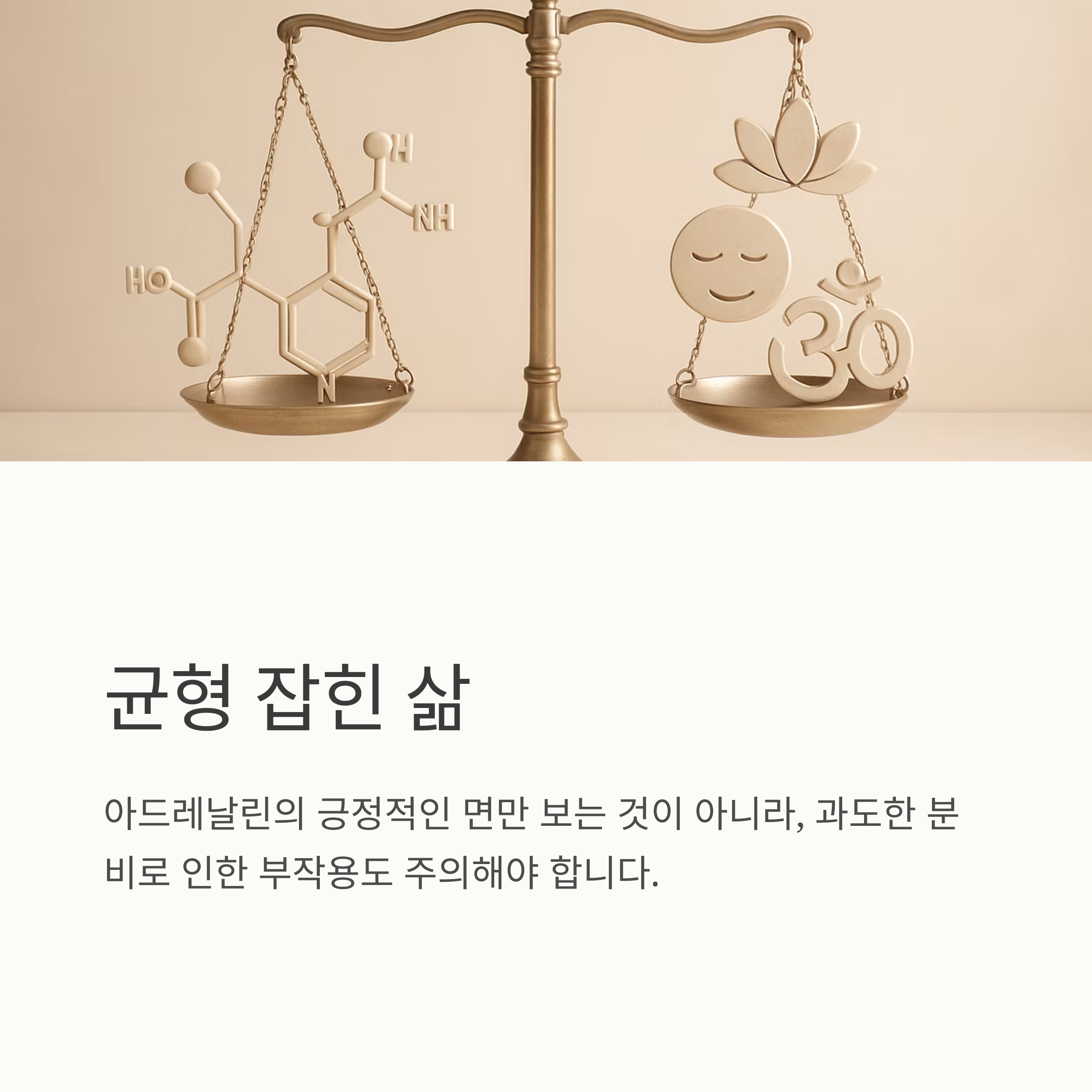 아드레날린의 긍정적인 면만 보는 것이 아니라, 과도한 분비로 인한 부작용도 주의해야 합니다. 균형 잡힌 삶을 통해 우리 몸의 경이로운 방어 시스템을 잘 활용하는 것이 건강한 삶의 비결입니다. 아드레날린과 함께 건강하고 행복한 삶을 만들어 나가시길 바랍니다.