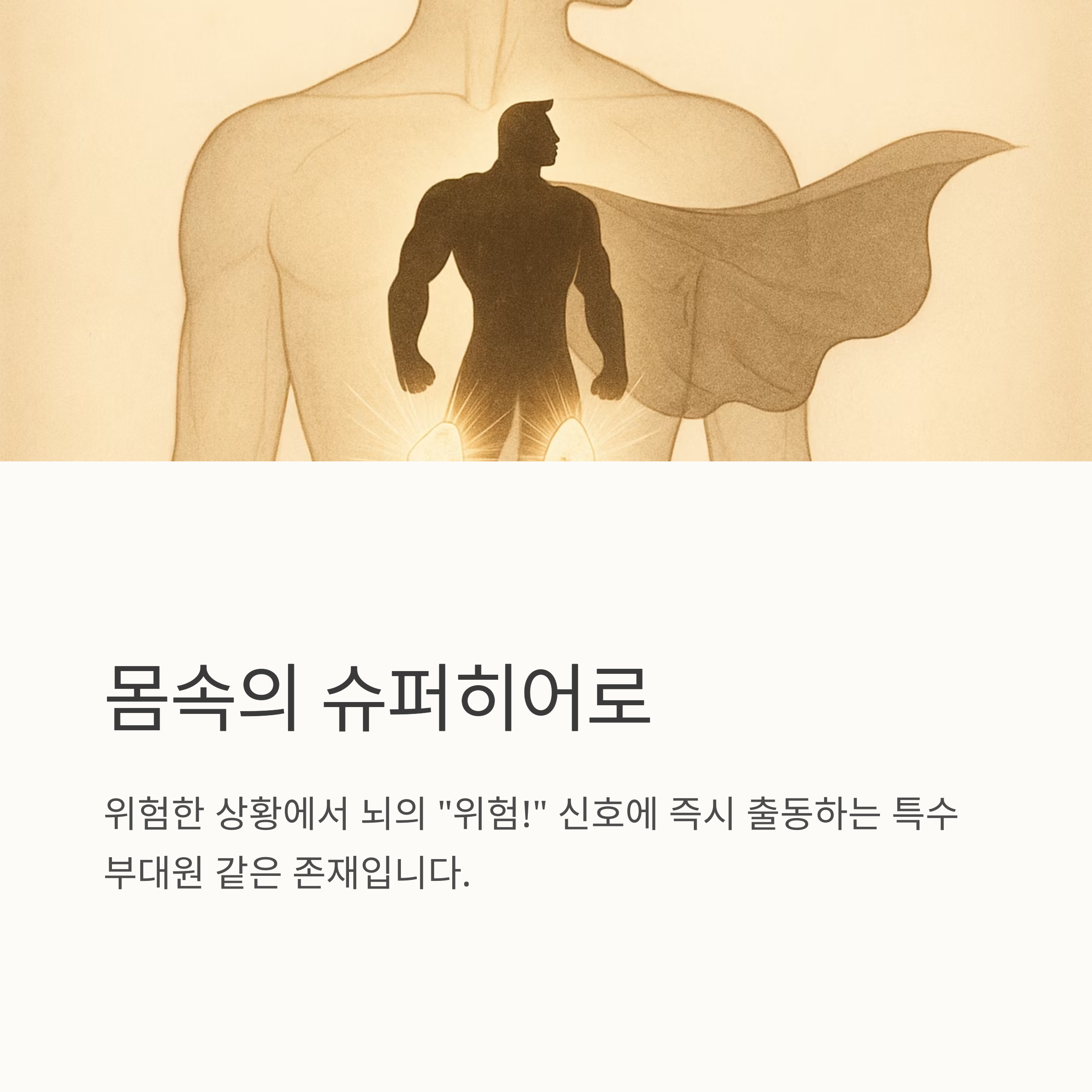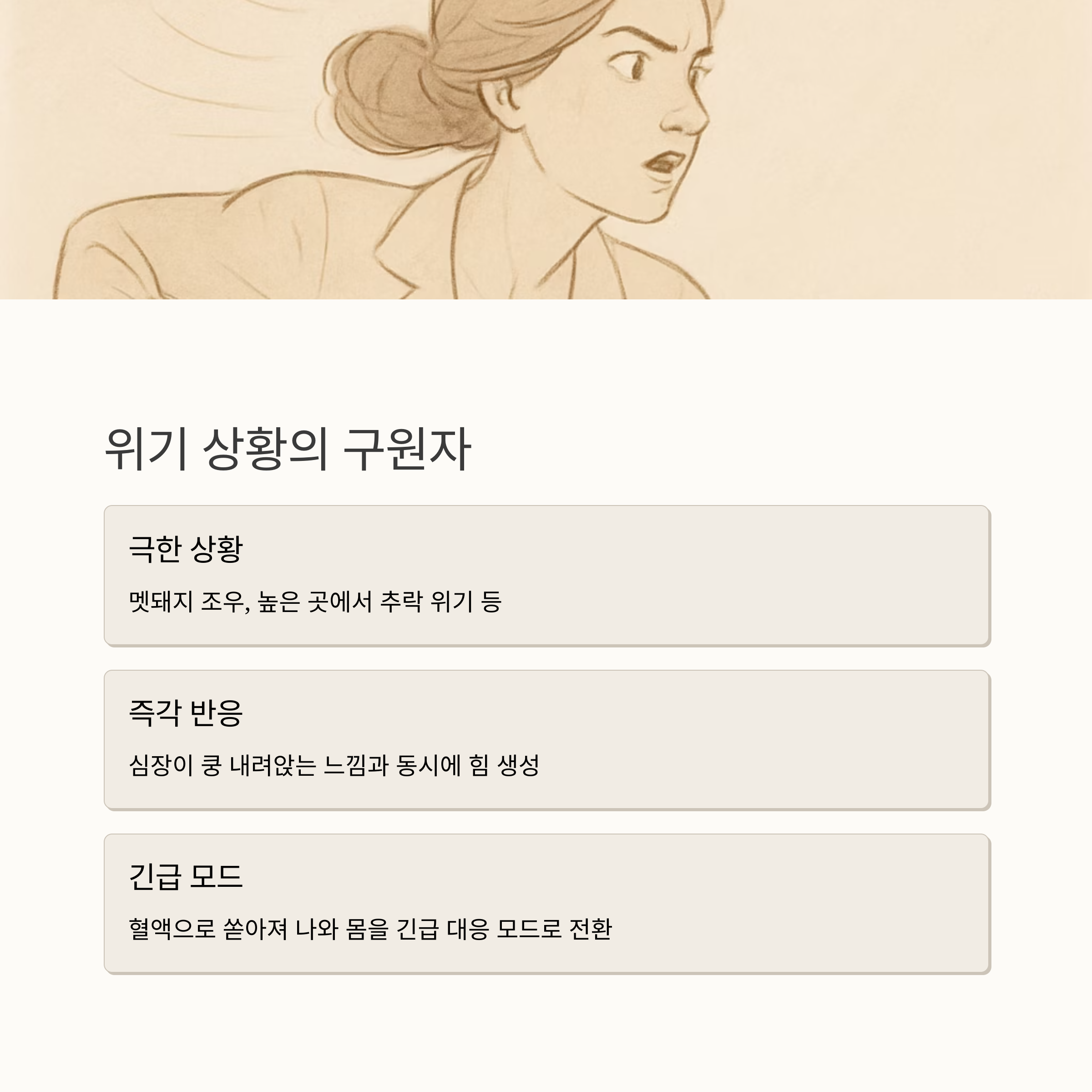 복잡해 보이지만, 결론적으로 우리 몸이 위험한 상황에 처했을 때, 뇌에서 “위험!” 신호가 떨어지면 바로 출동하는 특수부대원 같은 존재라고 생각하면 됩니다. 갑자기 멧돼지를 만났다거나, 높은 곳에서 떨어질 뻔했다거나 하는 극한의 상황을 생각해 보세요. 순간적으로 심장이 쿵 하고 내려앉는 것 같으면서도, 동시에 엄청난 힘이 생겨나는 걸 느끼셨을 겁니다.