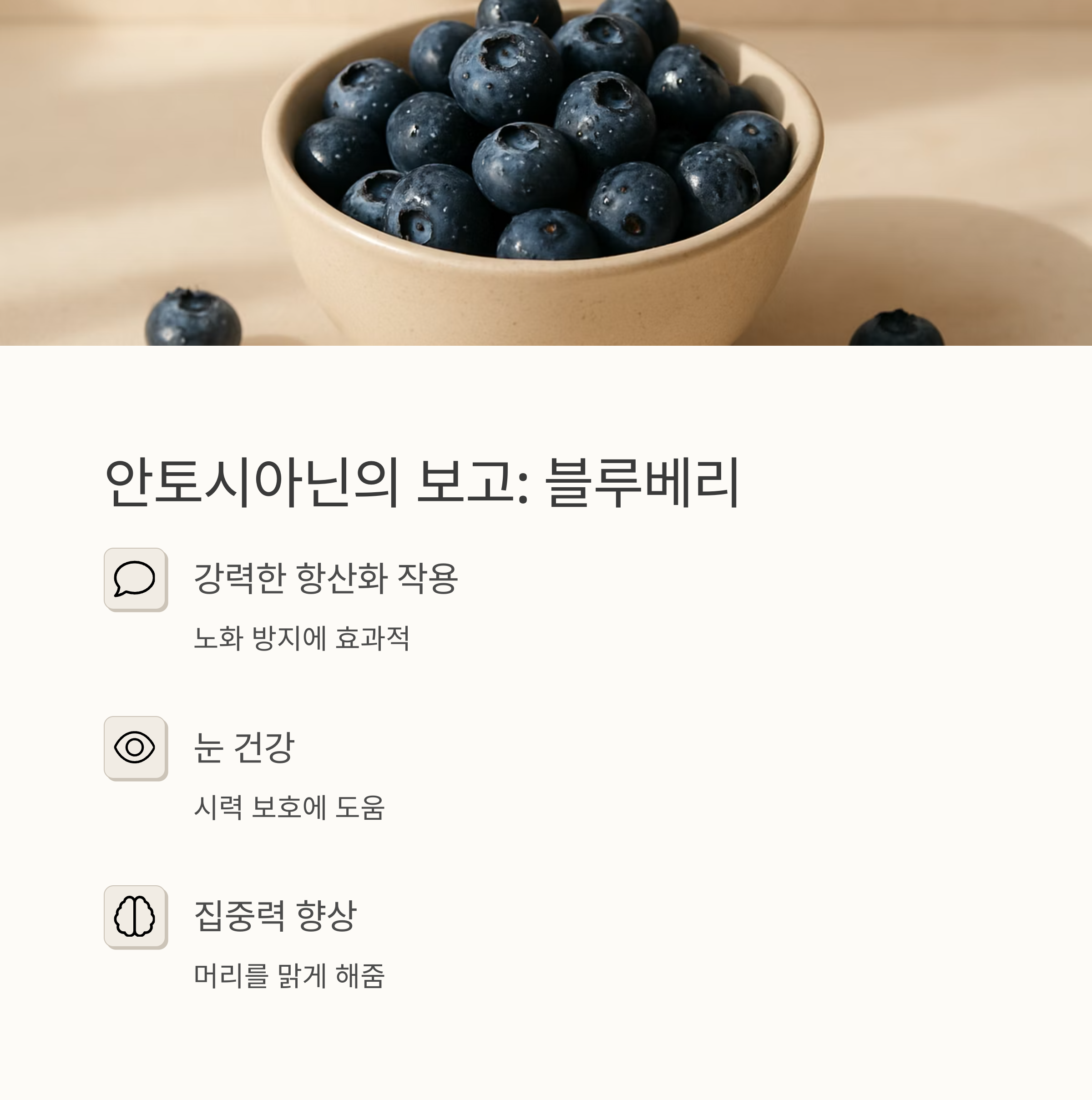 블루베리는 작은 크기지만 엄청난 효능을 가지고 있어요. 안토시아닌이라는 강력한 항산화 물질이 풍부해서 노화 방지에 효과적이고, 눈 건강에도 좋대요. 아침에 블루베리를 몇 알 먹으면 하루 종일 머리가 맑고 집중력이 높아지는 느낌이 들어요. 저는 요즘 블루베리 스무디를 만들어 마시는데, 맛도 좋고 건강에도 좋아서 정말 만족하고 있어요.
