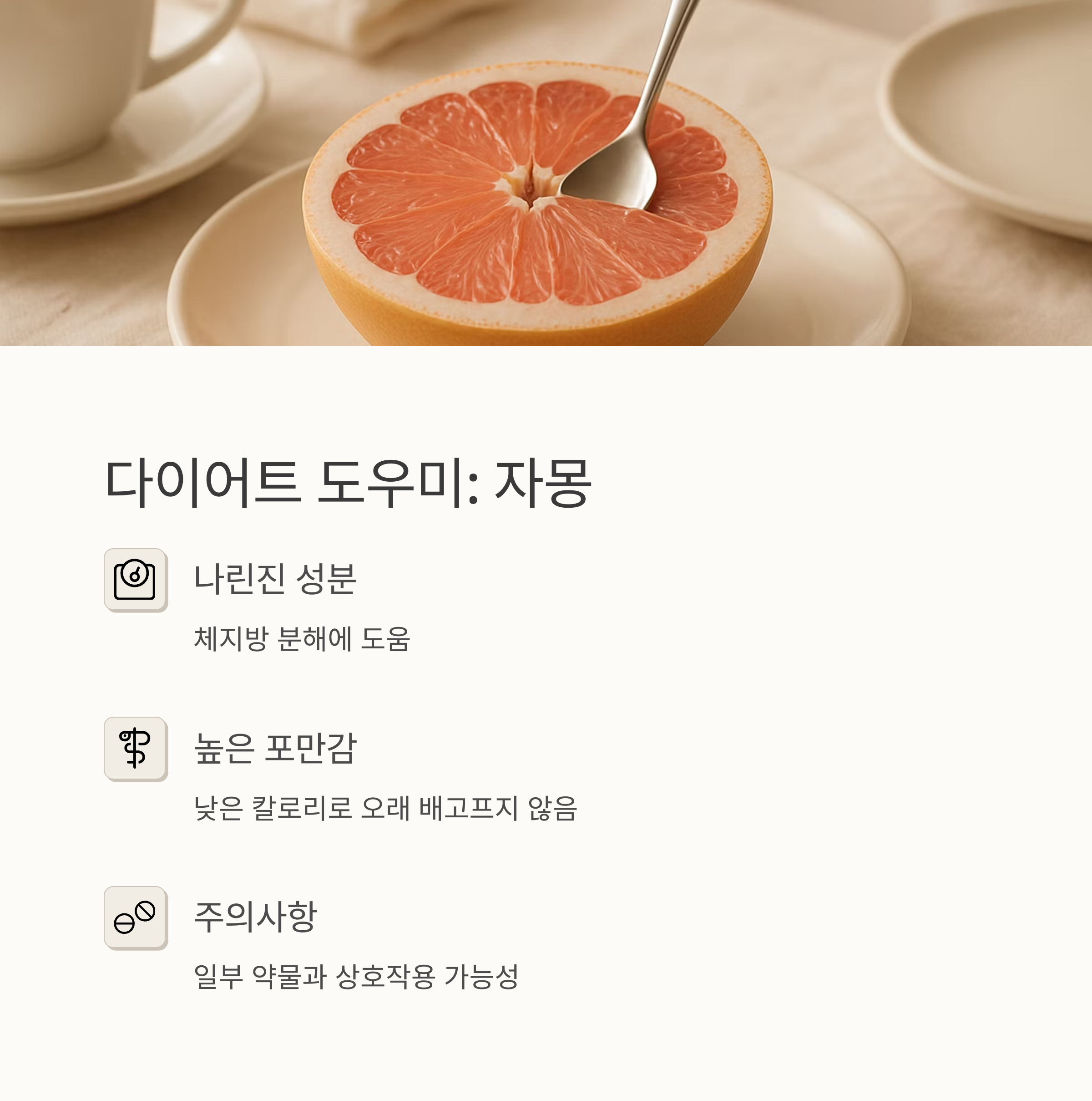 다이어트에 관심이 많다면 자몽을 추천해요. 자몽에 들어있는 나린진 성분이 체지방 분해에 도움을 준다고 하더라고요. 칼로리가 낮으면서 포만감도 높아서 다이어트 식단에 딱인데, 단, 몇몇 약과는 상호작용이 있을 수 있다고 하니 약을 드시는 분들은 꼭 확인해 보셔야 해요. 저는 아침에 자몽 반 개 정도 먹으면 점심까지 허기가 느껴지지 않더라고요!