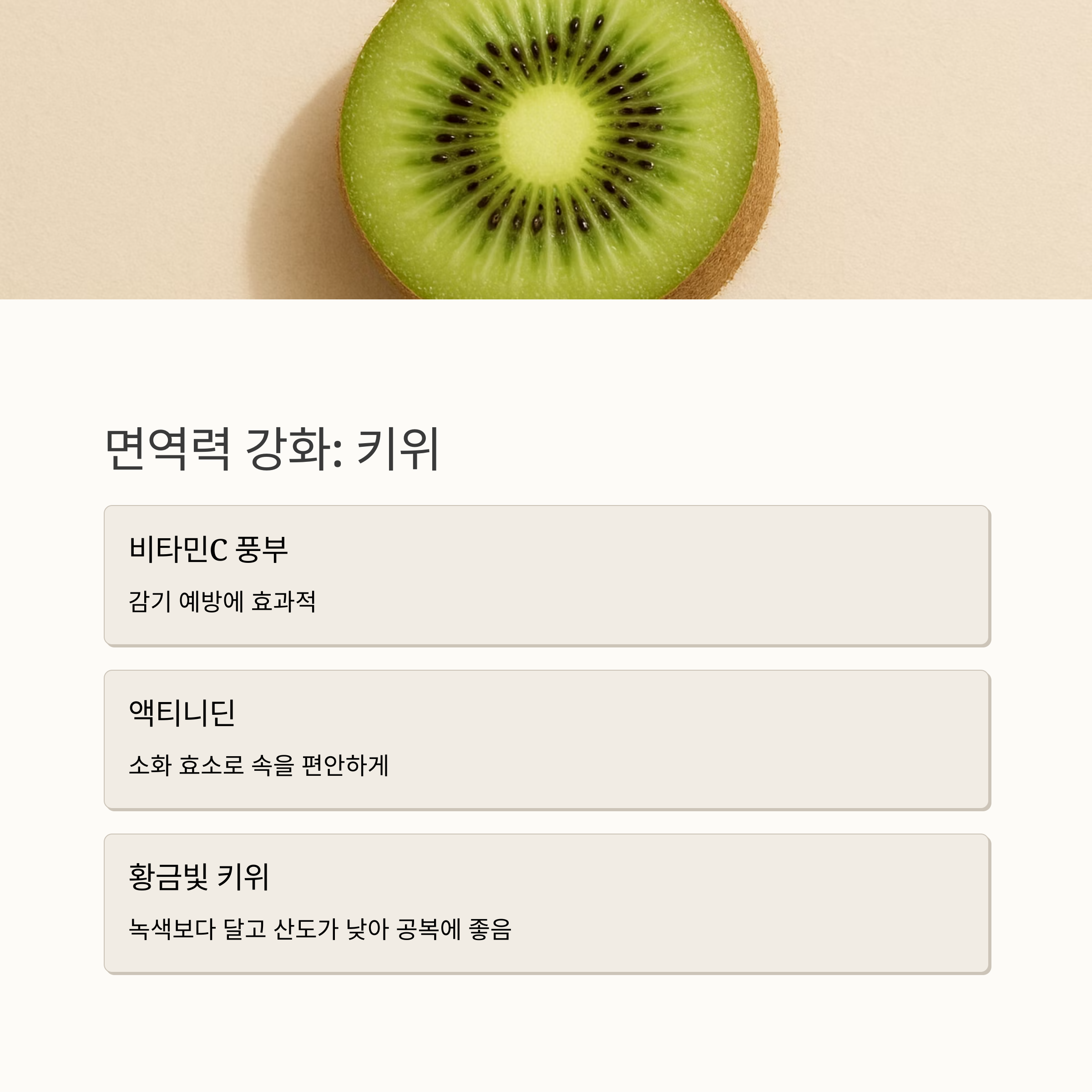 키위, 톡톡 터지는 새콤달콤한 맛이 매력적인 과일이죠. 비타민C가 엄청나게 많아서 감기 예방에도 좋고, 특히 액티니딘이라는 소화효소가 있어서 소화에도 도움이 된다고 해요. 저는 아침에 키위를 먹으면 속이 편안하고, 하루 종일 컨디션이 좋더라고요. 황금빛 키위는 녹색 키위보다 더 달고 산도가 낮아서 아침 공복에 먹기에도 부담 없답니다.