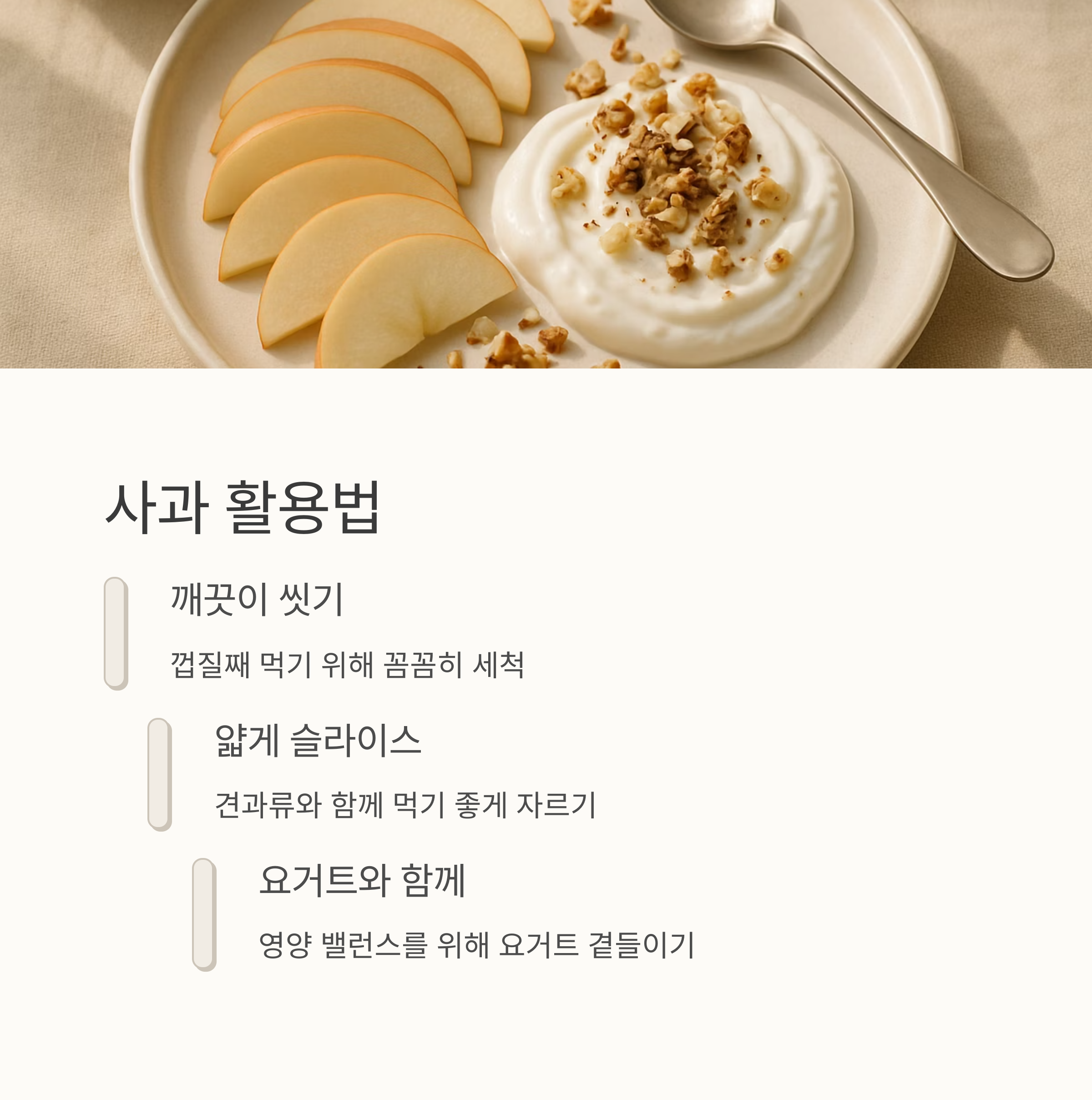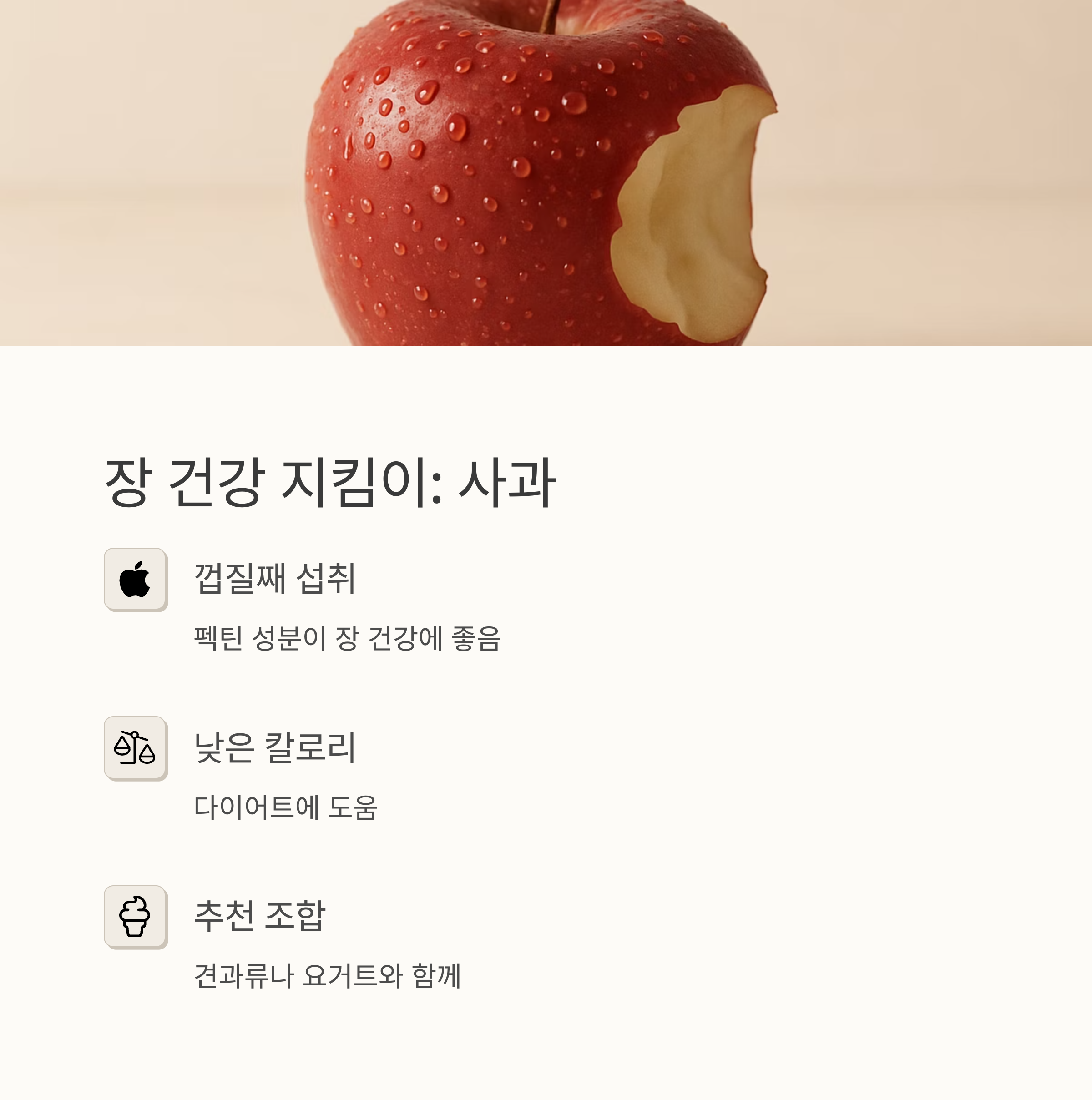 사과는 말이죠, 껍질째 먹으면 더욱 좋다고 해요. 사과 껍질에 있는 펙틴이라는 성분이 장 건강에 아주 좋대요! 아침에 사과 하나 먹으면 하루 종일 변비 걱정 없이 상쾌하게 보낼 수 있을 거예요. 게다가 사과는 칼로리도 낮아서 다이어트에도 도움이 된대요. 아침에 사과 하나 베어 물고 출근하면 기분도 좋고 건강도 챙기고 일석이조죠! 저는 사과를 먹을 때 견과류나 요거트를 곁들이는 것을 추천해요. 영양 밸런스를 맞추기에 딱이거든요.