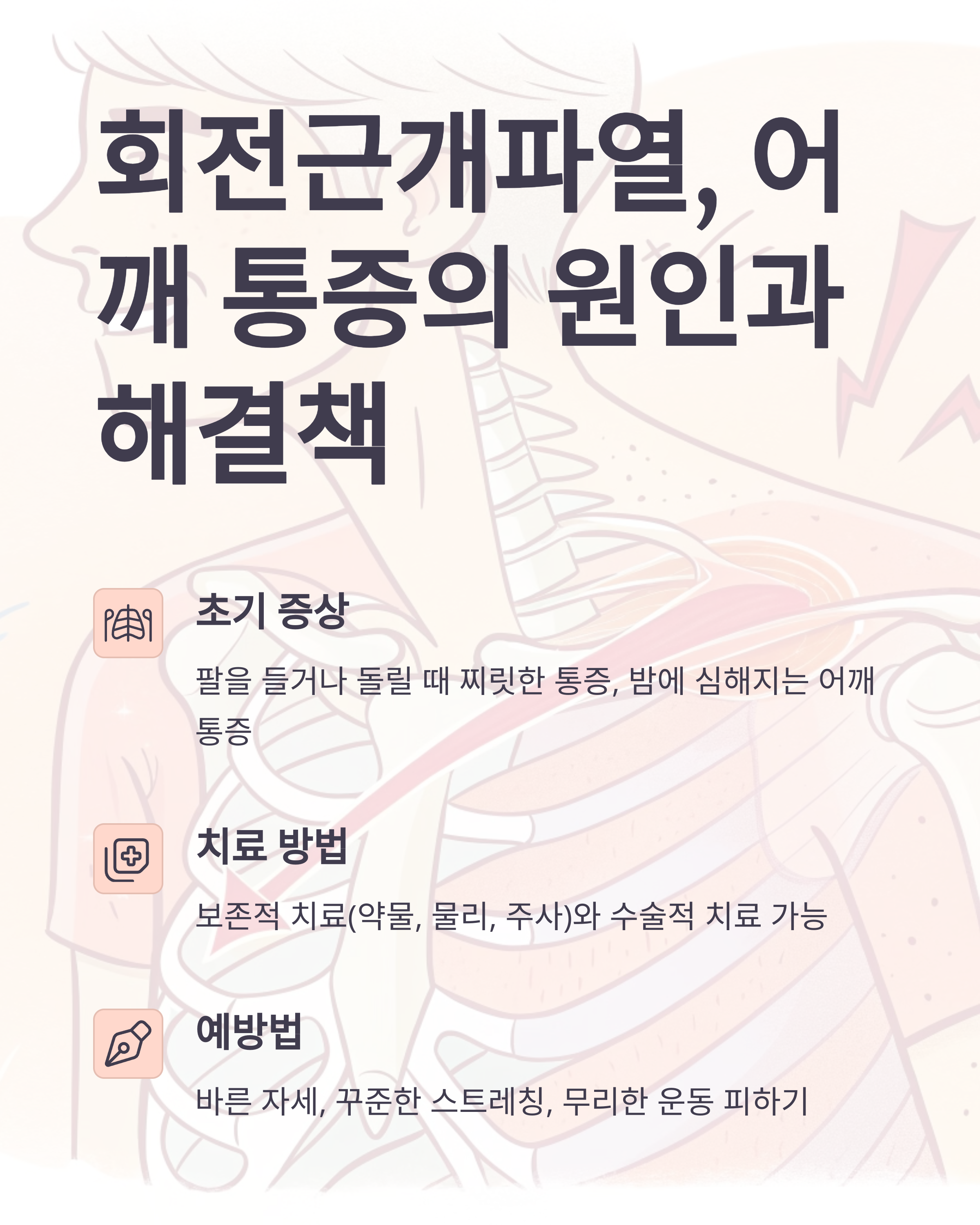 안녕하세요! 어깨 통증 때문에 밤잠 설치시는 분들 많으시죠? 특히 회전근개파열은 삶의 질을 뚝 떨어뜨리는 주범인데요. 오늘은 회전근개파열의 증상부터 원인, 그리고 다양한 치료법까지 속 시원하게 알려드릴게요. 이 글 하나로 어깨 통증, 이제 안녕!