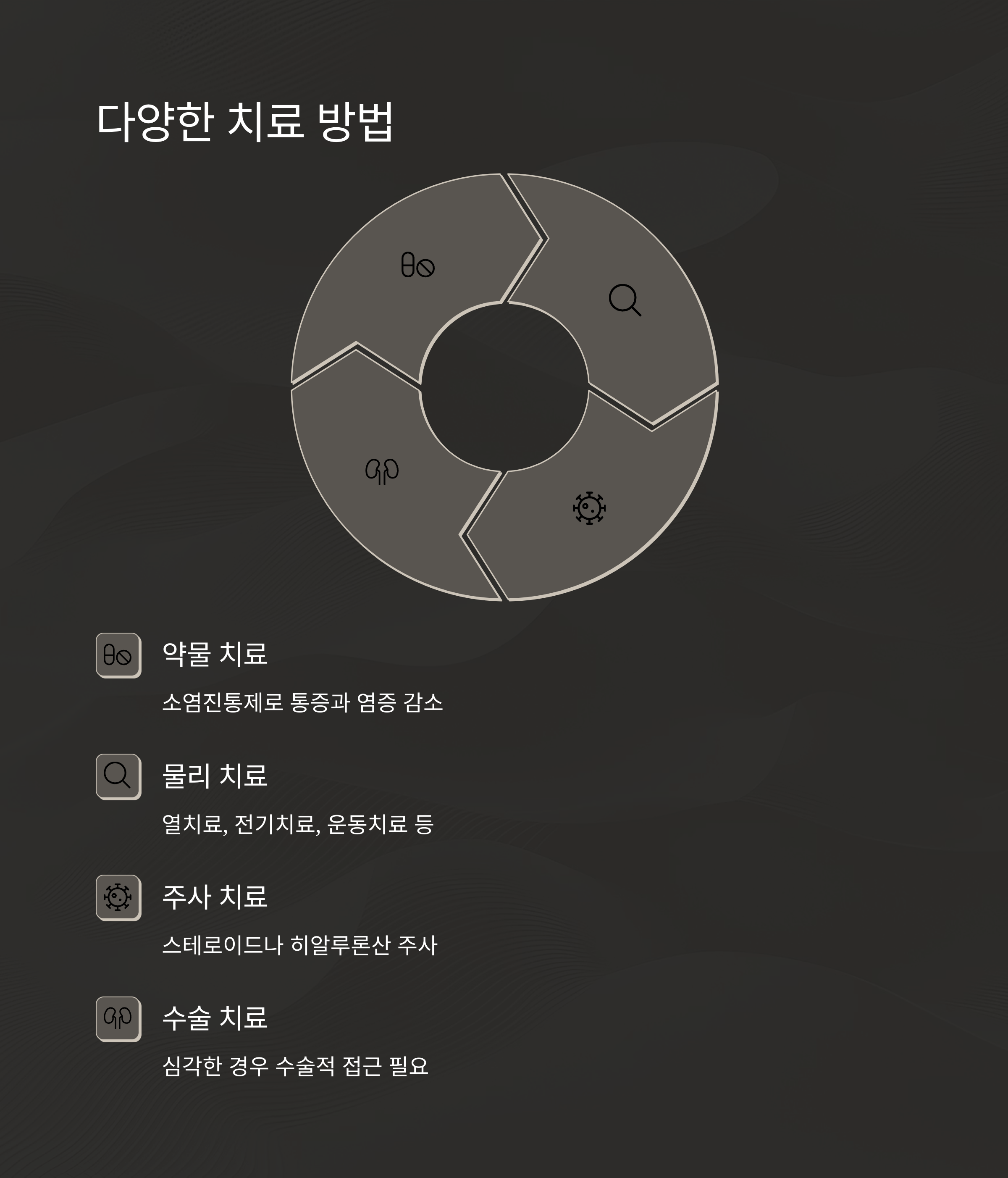 병원에서는 X-ray, MRI, CT 등의 검사를 통해 정확한 원인을 진단하고, 그에 맞는 적절한 치료를 받을 수 있습니다. 또한, 물리 치료나 약물 치료, 수술 등 다양한 치료 방법이 있으니, 전문의와 상담하여 자신에게 가장 적합한 치료 계획을 세우는 것이 중요합니다.