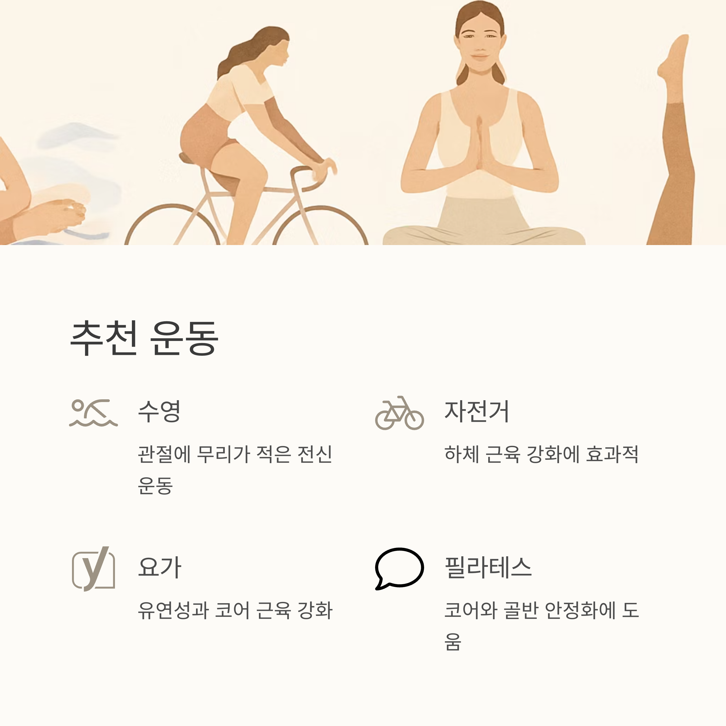 하지만 무리한 운동은 금물! 자신의 체력에 맞춰 천천히 운동량을 늘려가는 것이 중요해요. 수영이나 자전거 타기처럼 관절에 무리가 덜 가는 운동이 좋고, 요가나 필라테스처럼 코어 근육을 강화하는 운동도 효과적이에요.