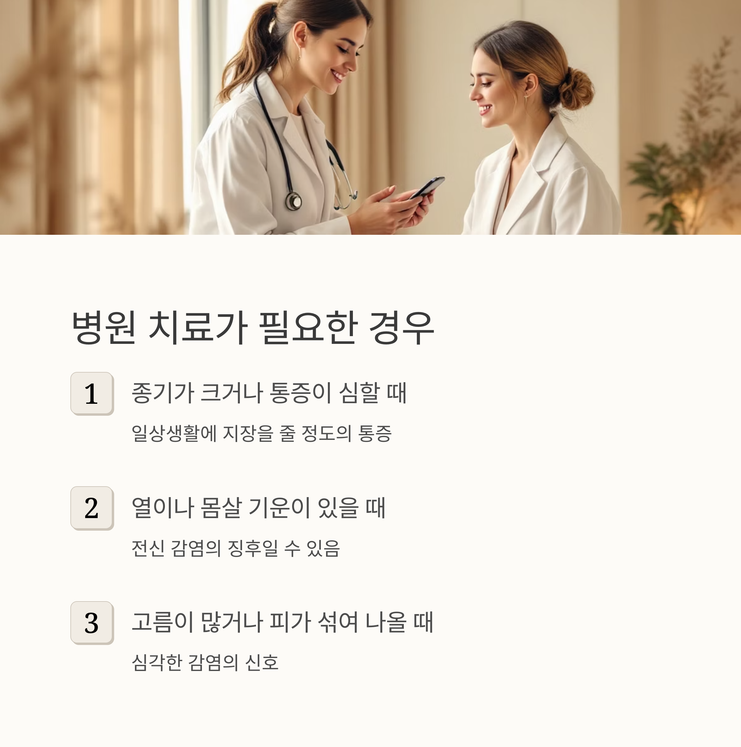 엉덩이 종기가 생겼다고 해서 모두 병원에 가야 하는 것은 아니지만, 몇 가지 경우에는 꼭 병원을 방문하는 것이 좋습니다. 종기의 크기가 크거나 통증이 심한 경우, 열이 나거나 몸살 기운이 있는 경우, 고름이 많이 나오거나 피가 섞여 나오는 경우, 종기가 터진 후에도 염증이 가라앉지 않는 경우, 그리고 종기가 반복적으로 재발하는 경우에는 즉시 병원을 찾아 진료를 받아야 합니다.