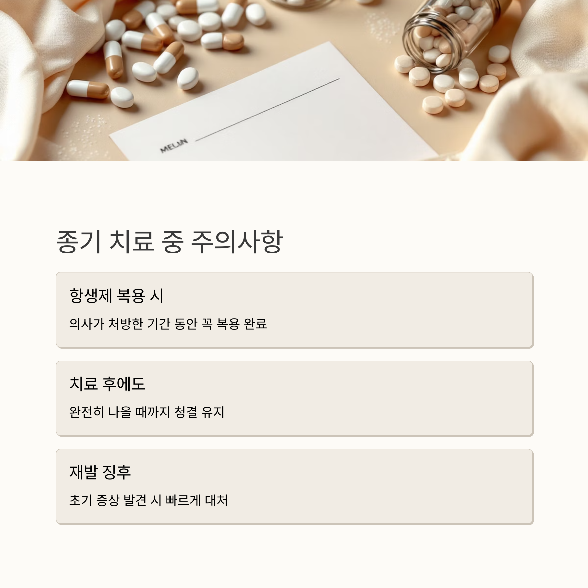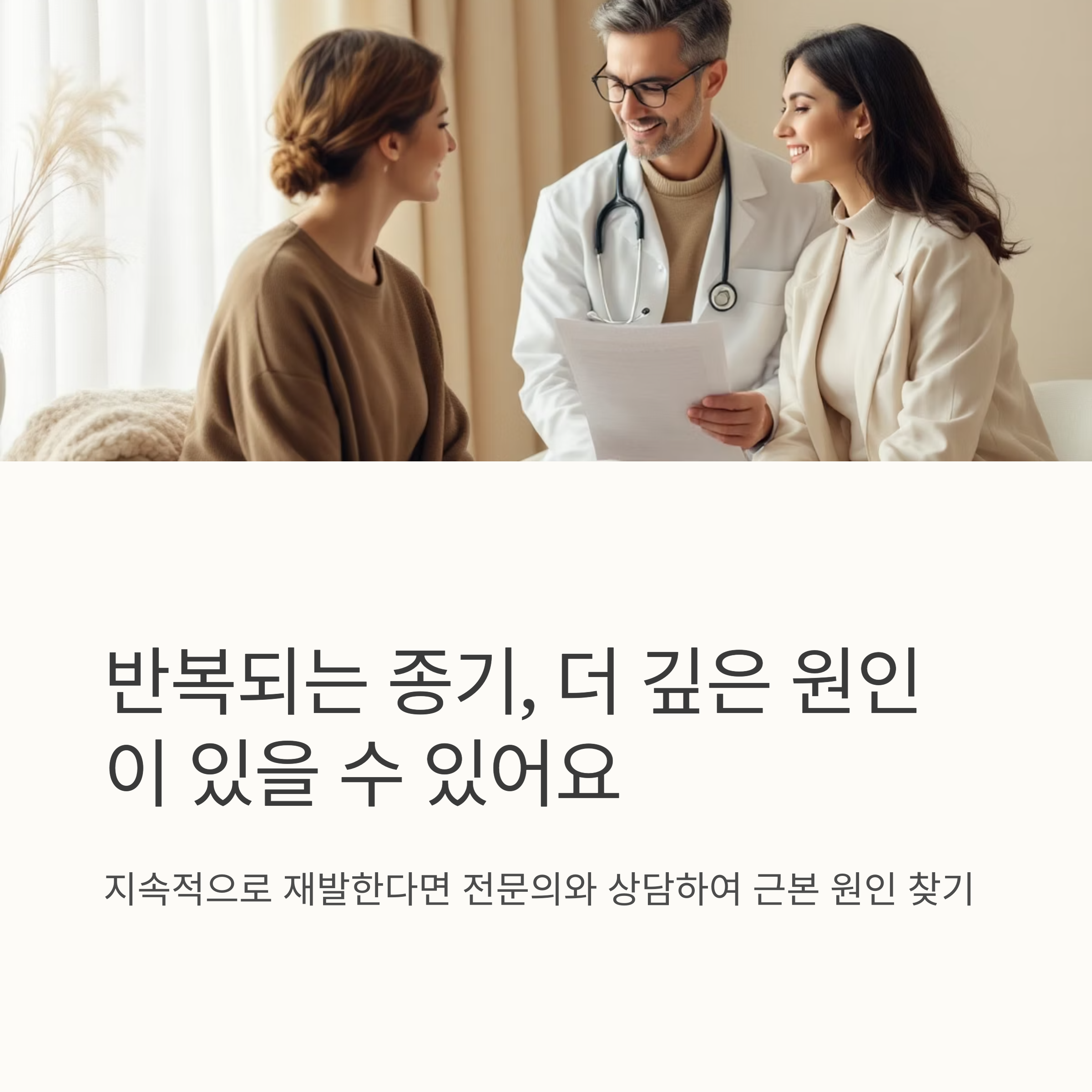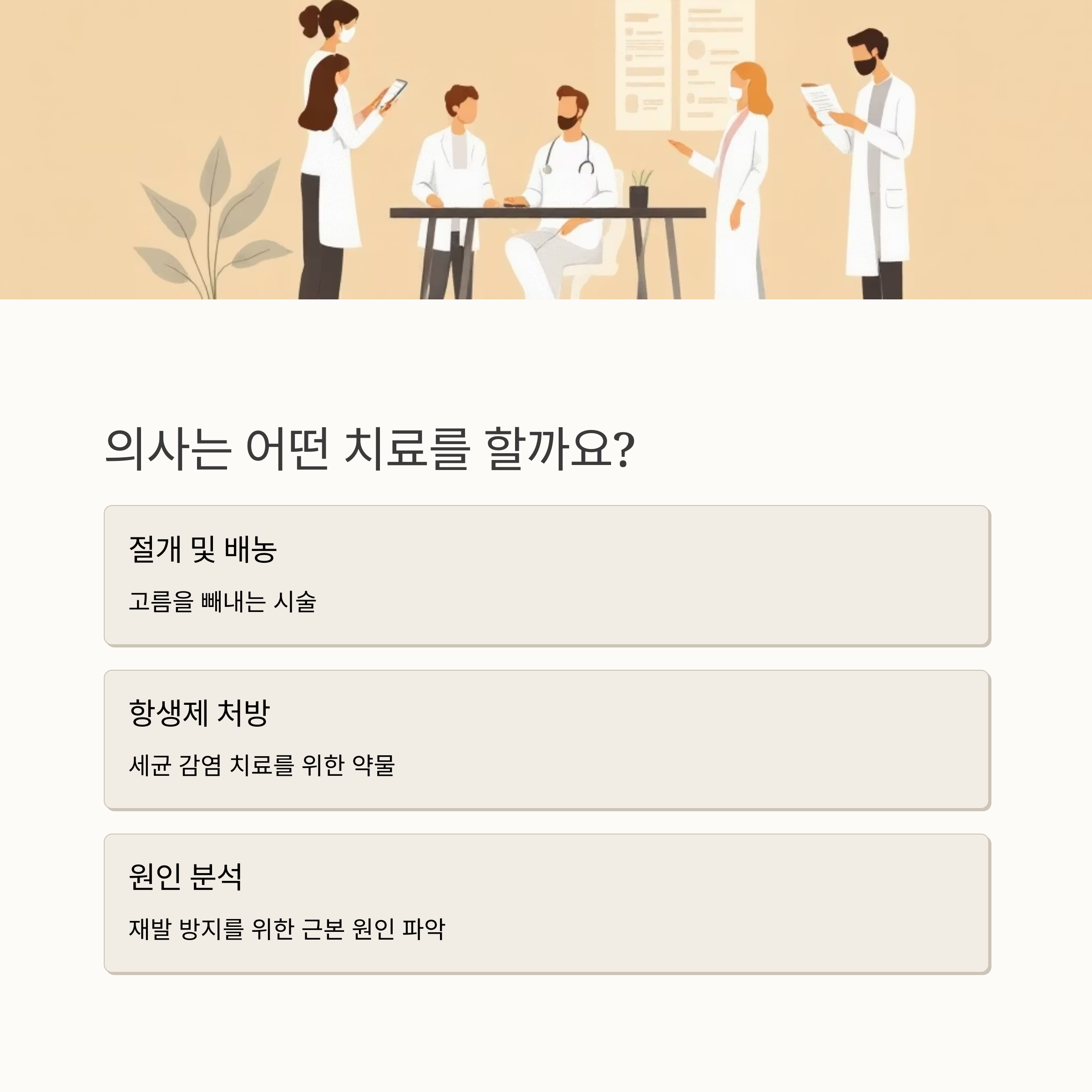 만약 종기가 커지거나 고름이 많이 차면, 병원을 방문해야 해요. 의사는 종기를 절개해서 고름을 빼내는 시술을 할 수도 있습니다. 심한 경우 항생제를 처방받을 수도 있고요. 집에서 자가 치료를 하기보다는 전문가의 도움을 받는 것이 안전하다는 것을 기억하세요.