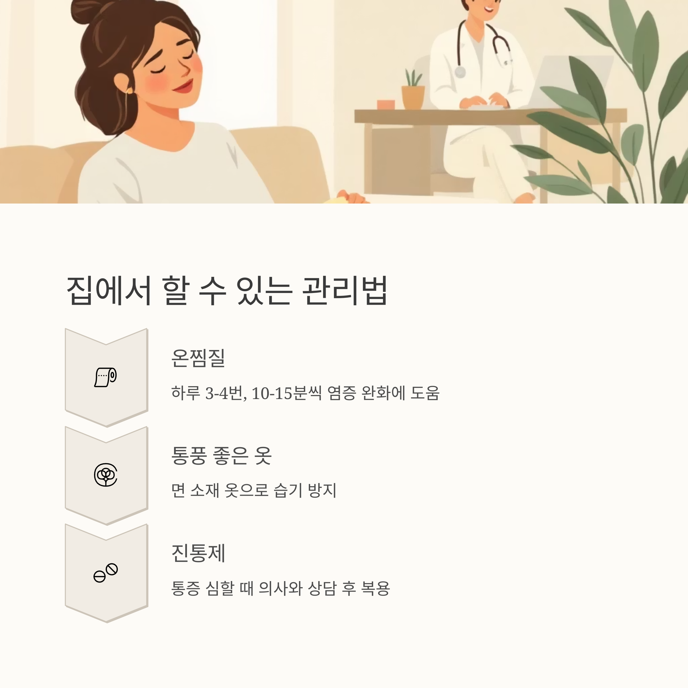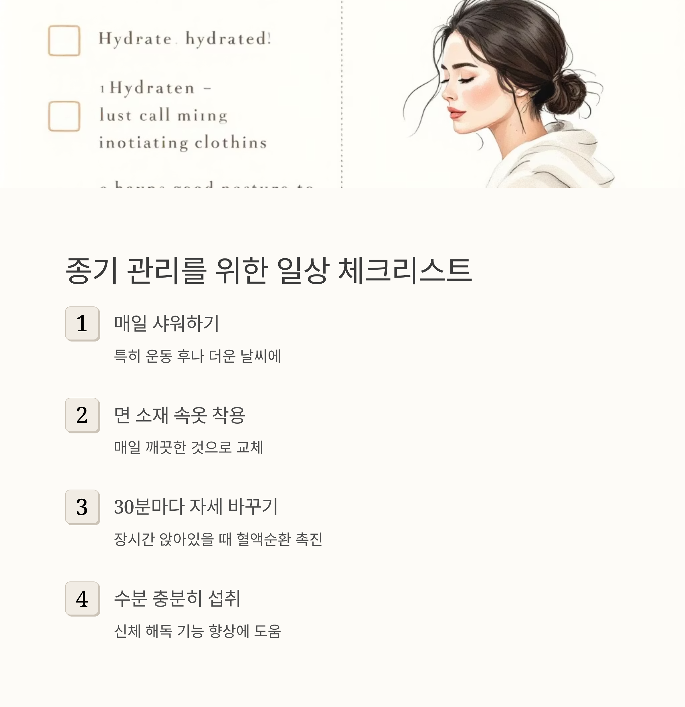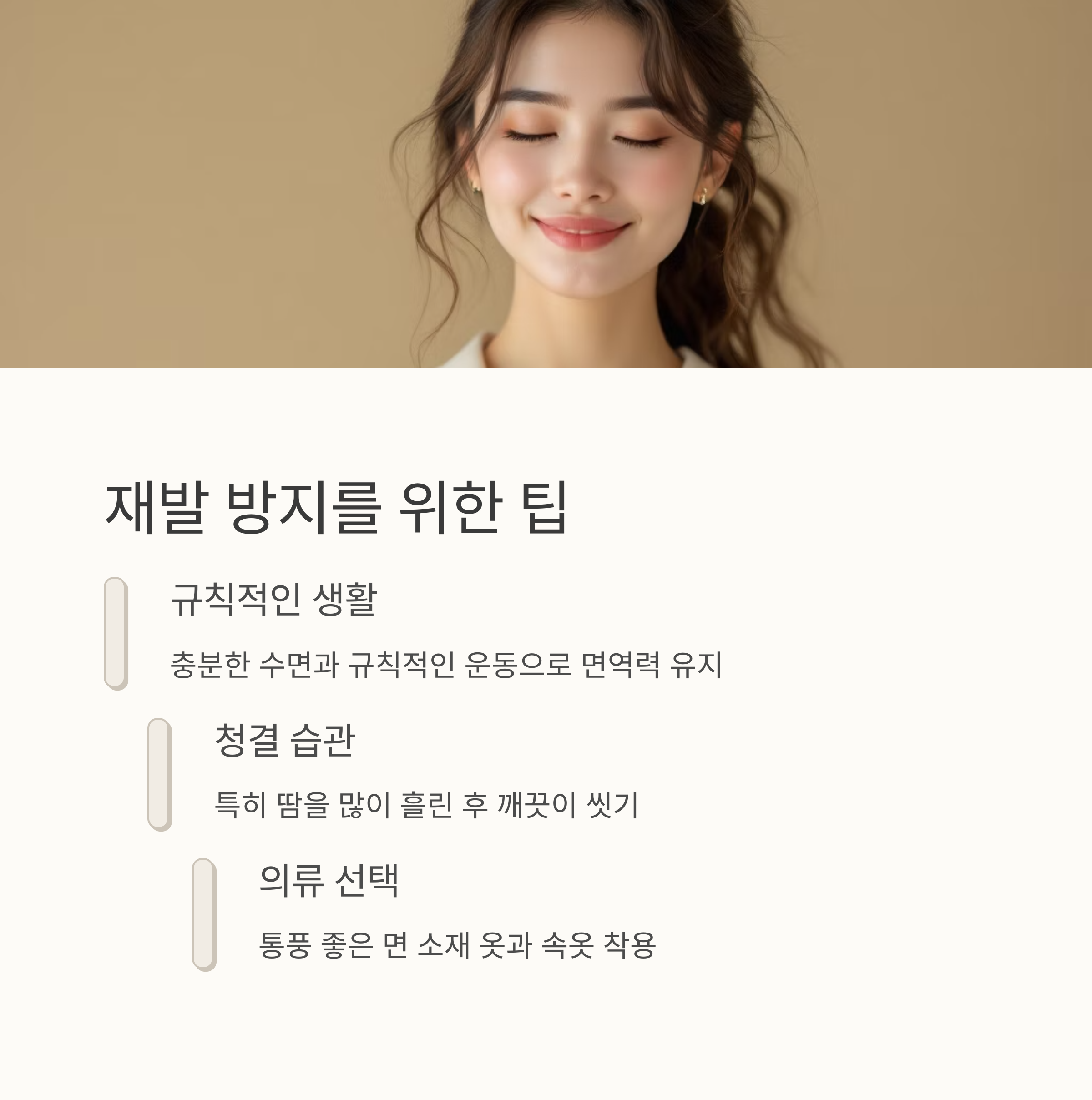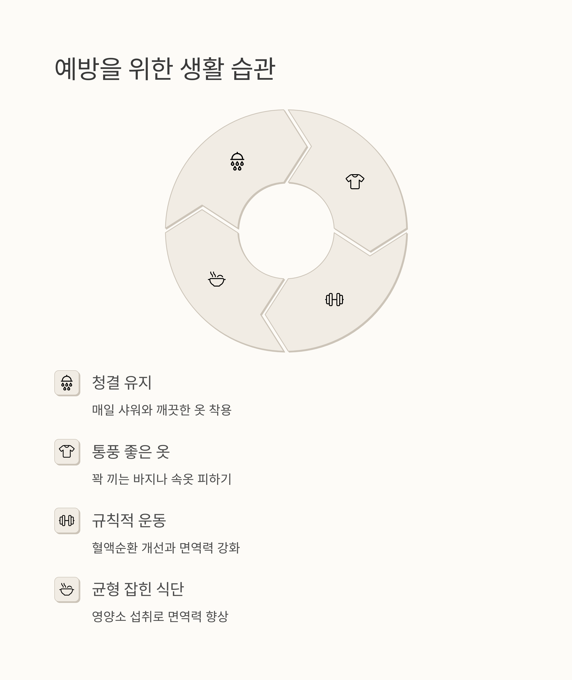 땀이 많이 난다면 바로 닦아주는 것이 좋고, 통풍이 잘 되는 옷을 선택하는 것도 중요해요. 꽉 끼는 바지나 속옷은 피하는 것이 좋습니다. 또한, 면역력을 높이는 것도 중요해요. 균형 잡힌 영양 섭취와 충분한 수면, 규칙적인 운동을 통해 건강한 몸 상태를 유지하도록 노력하세요.